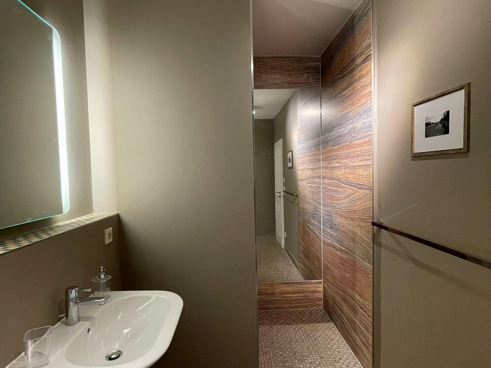 Das Badezimmer ist mit ebenerdiger Dusche, Waschtisch und großen Spiegel ausgestattet.