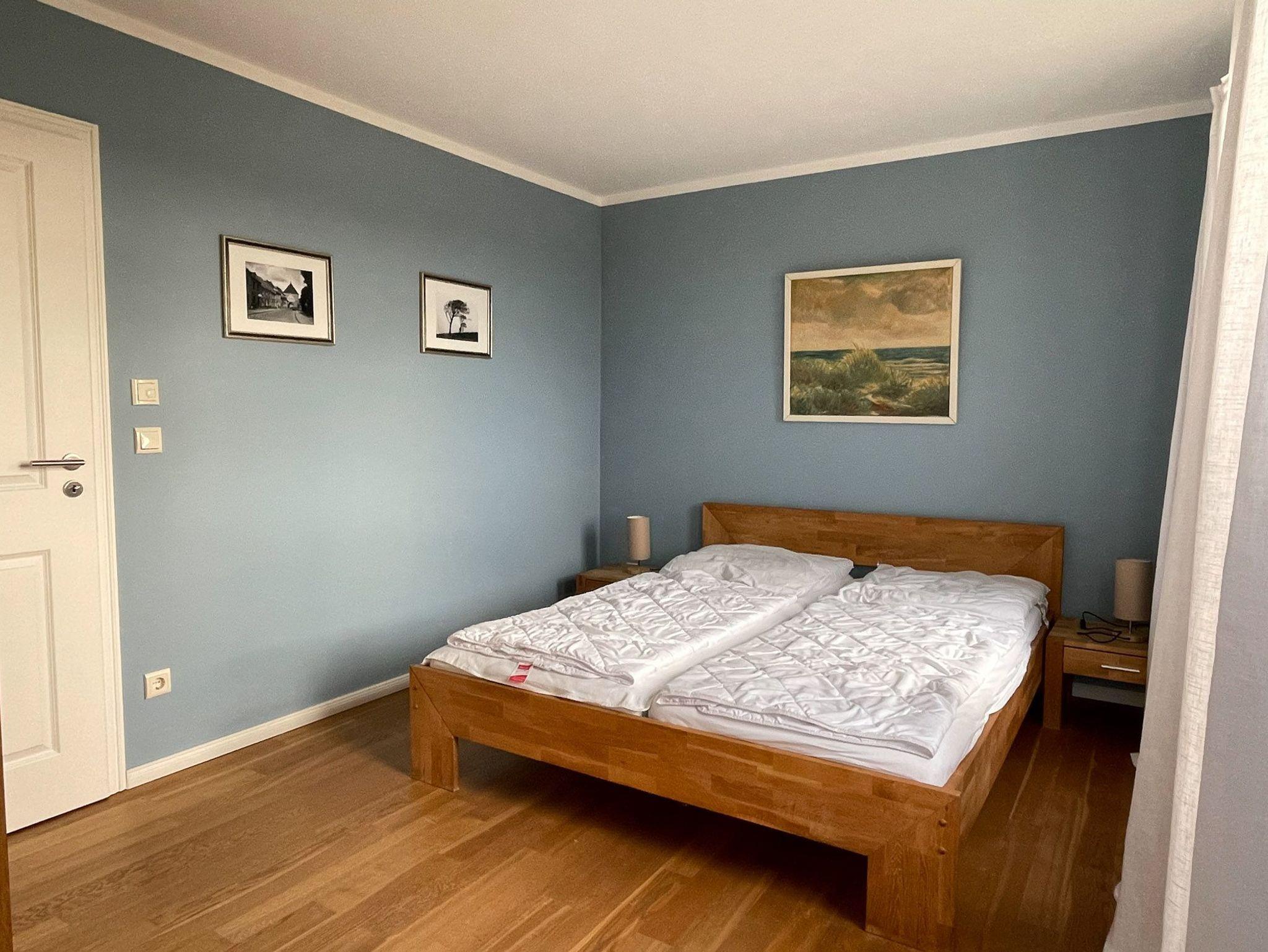 Das Schlafzimmer besticht mit einem großen Doppelbett und direktem Meerblick. In Schlaf- und Wohnzimmer sind zusätzlich zu den schönen Vorhängen separate Blindouts vorhanden, die je nach Verdunkelungswunsch zusätzlich zugezogen werden können. Einem erholsamen Urlaub für zwei Erwachsene und zwei Kinder (bis 15 Jahre) steht in dieser Ferienwohnung nichts entgegen. Damit Sie bei der Anfahrt Platz sparen, stehen für Ihr Kleinkind ein Babybett ohne Matratze sowie ein Hochstuhl bereit. Ein Wäscheset kann pro Person kostenpflichtig zugebucht werden.
