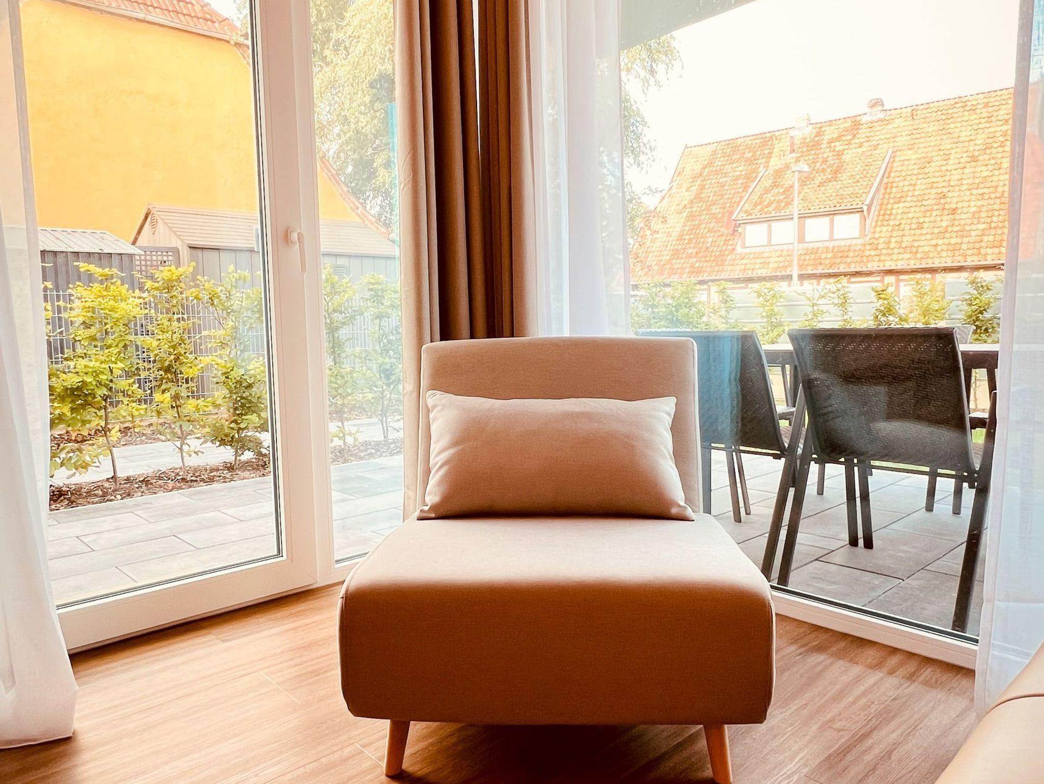 Über den Eingangsbereich gelangen Sie in den offenen Wohn- und Essbereich. Die moderne Einbauküche ist mit allen wichtigen Dingen ausgestattet: Geschirrspüler, Backofen, Mikrowelle, Kühlschrank, Toaster, Wasserkocher und Kaffeemaschine. Eine Geschirr-, Koch- und Zubehörausstattung ist natürlich ebenfalls vorhanden. Der Essbereich umfasst 6 bequeme Sitzplätze und lädt neben dem Essen zum längeren Verweilen ein. Das lichtdurchflutete Wohnzimmer mit bodentiefen Fenstern bietet ausreichend Platz und verfügt über eine bequeme Schlafcouch, auf welcher es sich wunderbar entspannen lässt. Ein ruhiger Platz zum Lesen sowie ein TV runden die Entschleunigung im Urlaub ab.