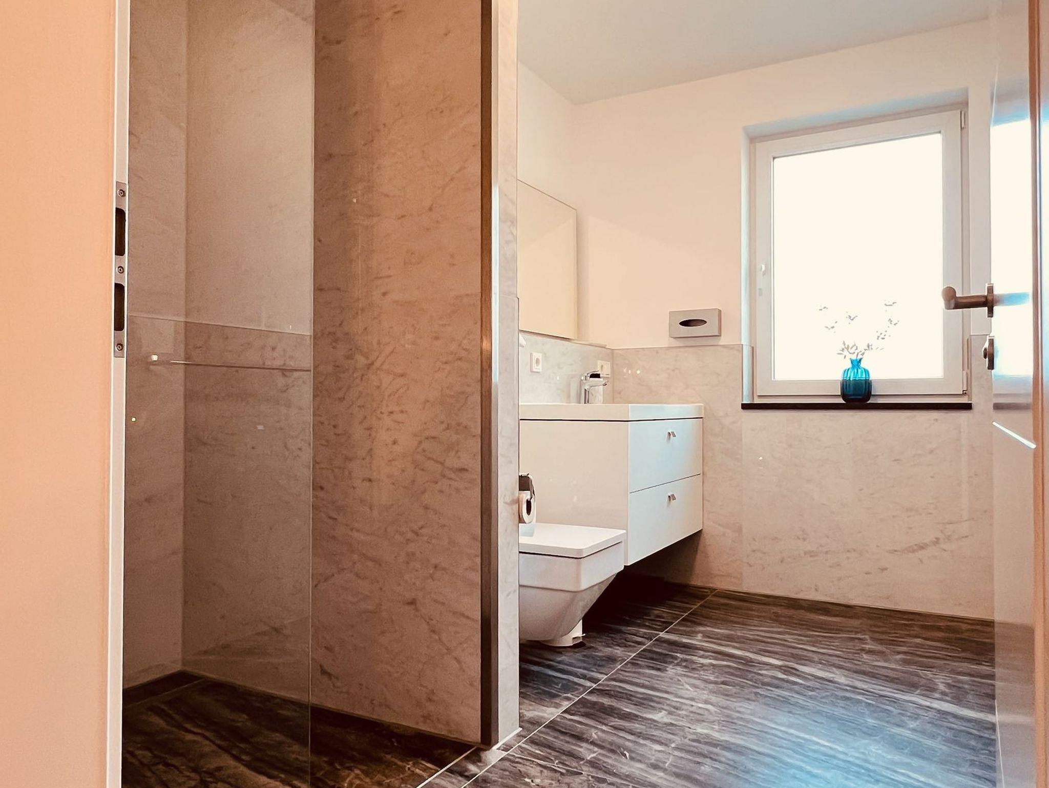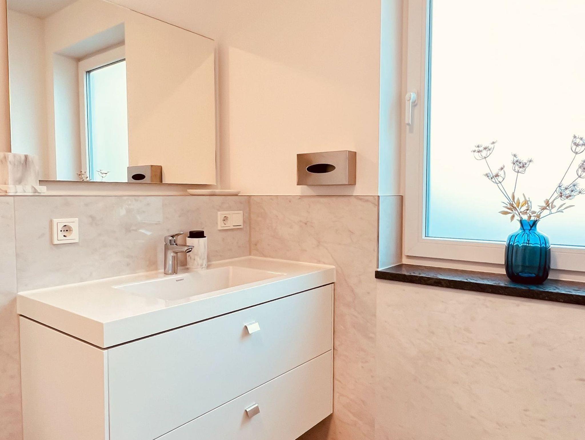 Das helle Badezimmer ist ausgestattet mit einer ebenerdigen Dusche, einem Waschtisch inklusive großem Spiegel sowie einem Haartrockner.