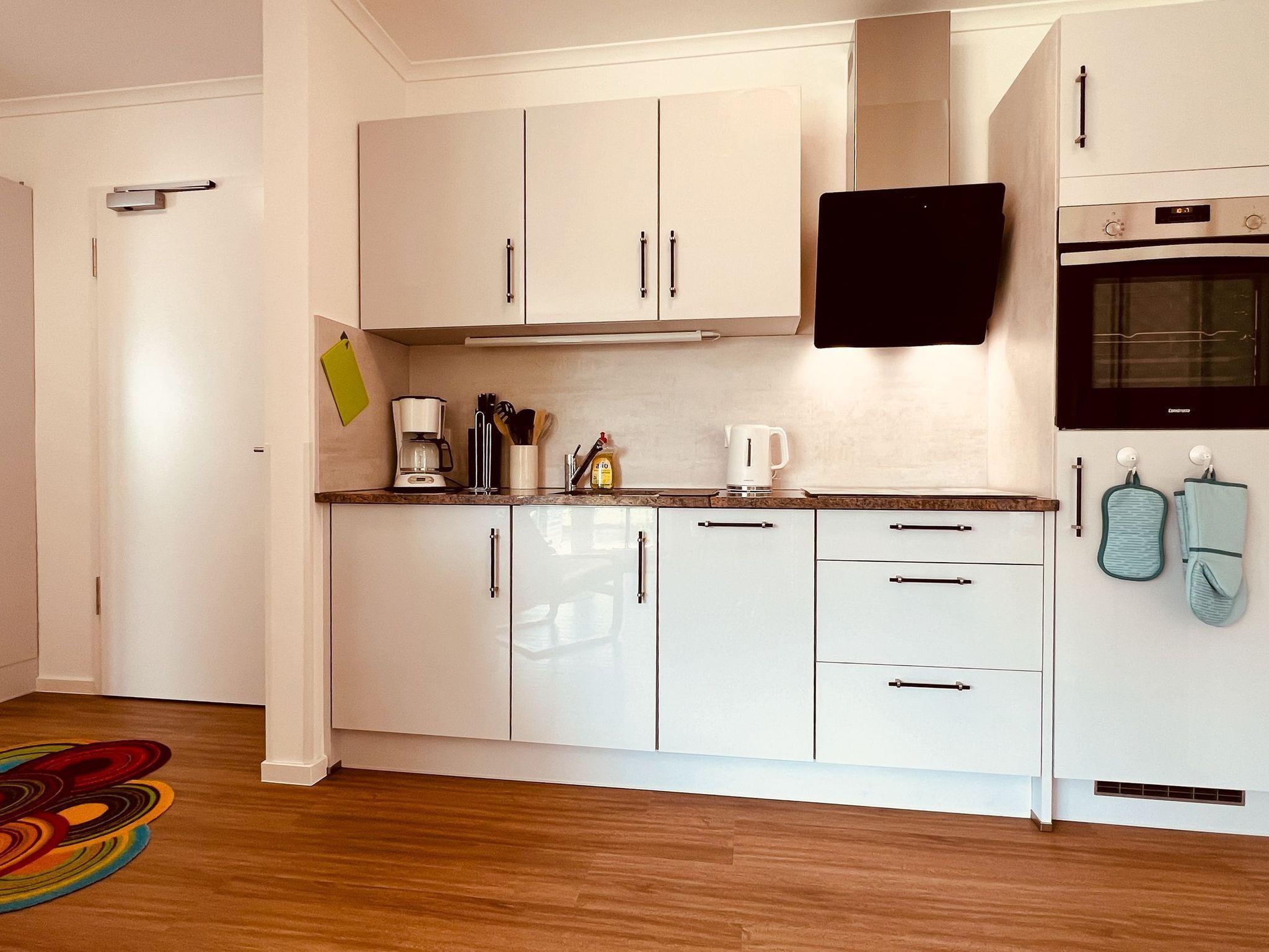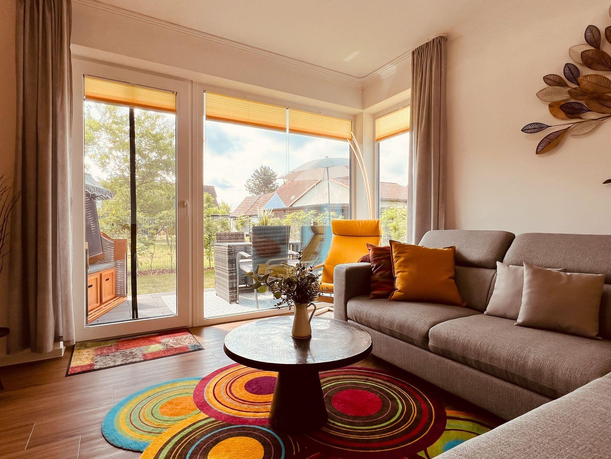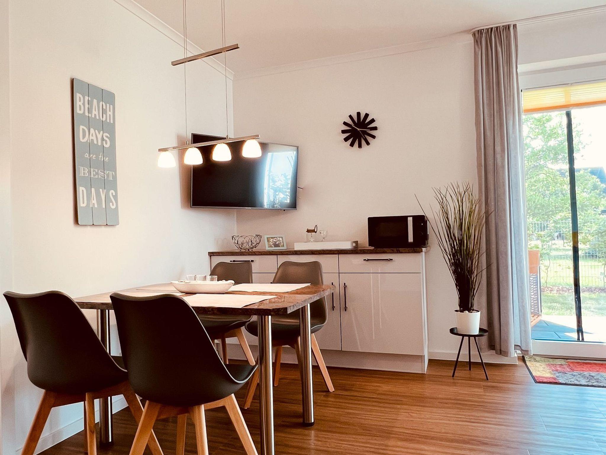 Über den Eingangsbereich gelangen Sie in den offenen Wohn- und Essbereich. Die moderne Einbauküche ist mit allen wichtigen Dingen ausgestattet: Geschirrspüler, Backofen, Mikrowelle, Kühlschrank, Toaster, Wasserkocher und Kaffeemaschine. Eine Geschirr-, Koch- und Zubehörausstattung ist natürlich ebenfalls vorhanden. Der Essbereich umfasst 4 bequeme Sitzplätze und lädt neben dem Essen zum längeren Verweilen ein. Das lichtdurchflutete Wohnzimmer mit bodentiefen Fenstern bietet ausreichend Platz und verfügt über eine bequeme Couch, auf welcher es sich wunderbar entspannen lässt. Ein ruhiger Platz zum Lesen sowie ein TV runden die Entschleunigung im Urlaub ab.
