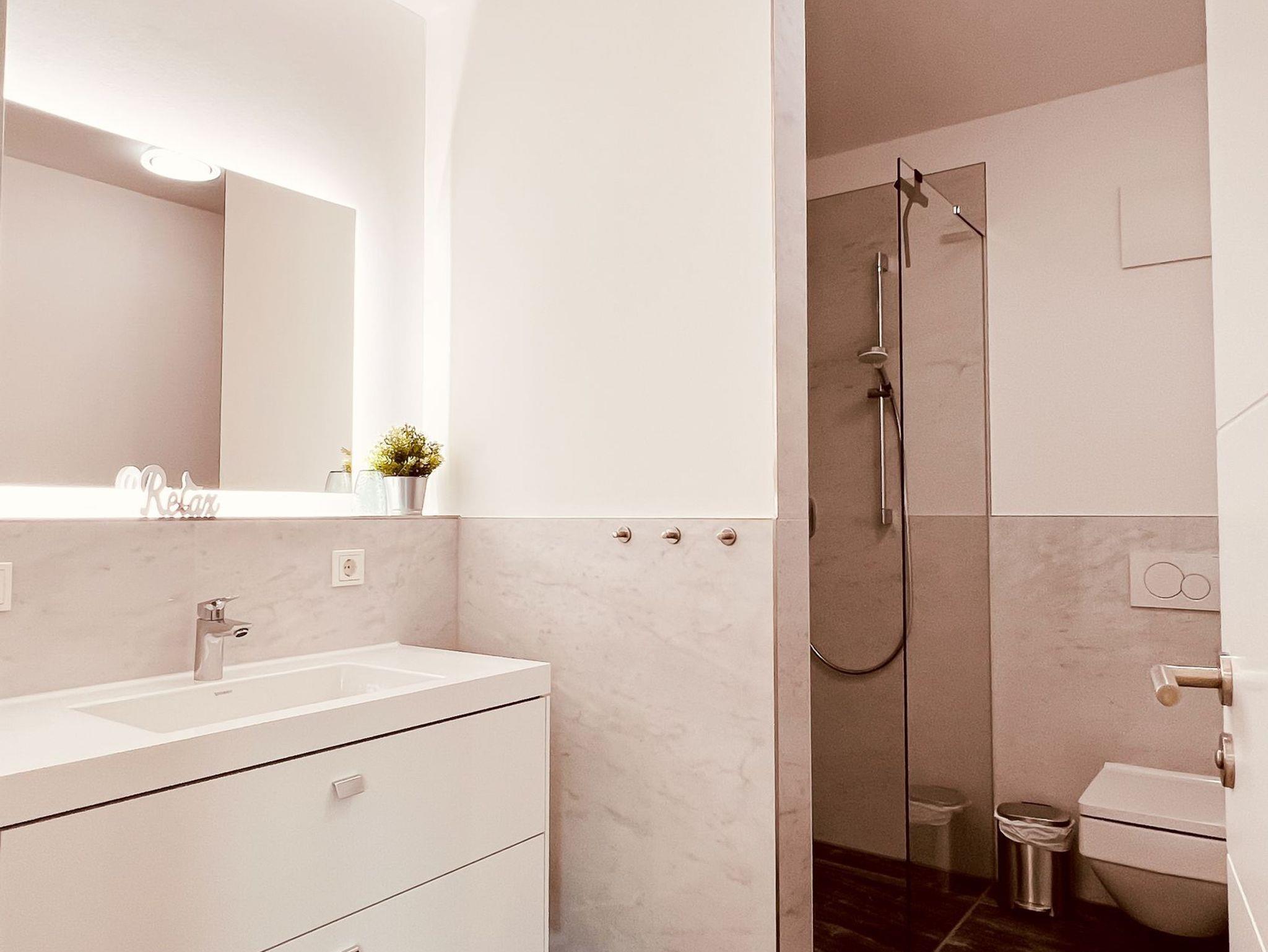 Das helle Badezimmer ist ausgestattet mit einer ebenerdigen Dusche, einem Waschtisch inklusive großem Spiegel sowie einem Haartrockner.
