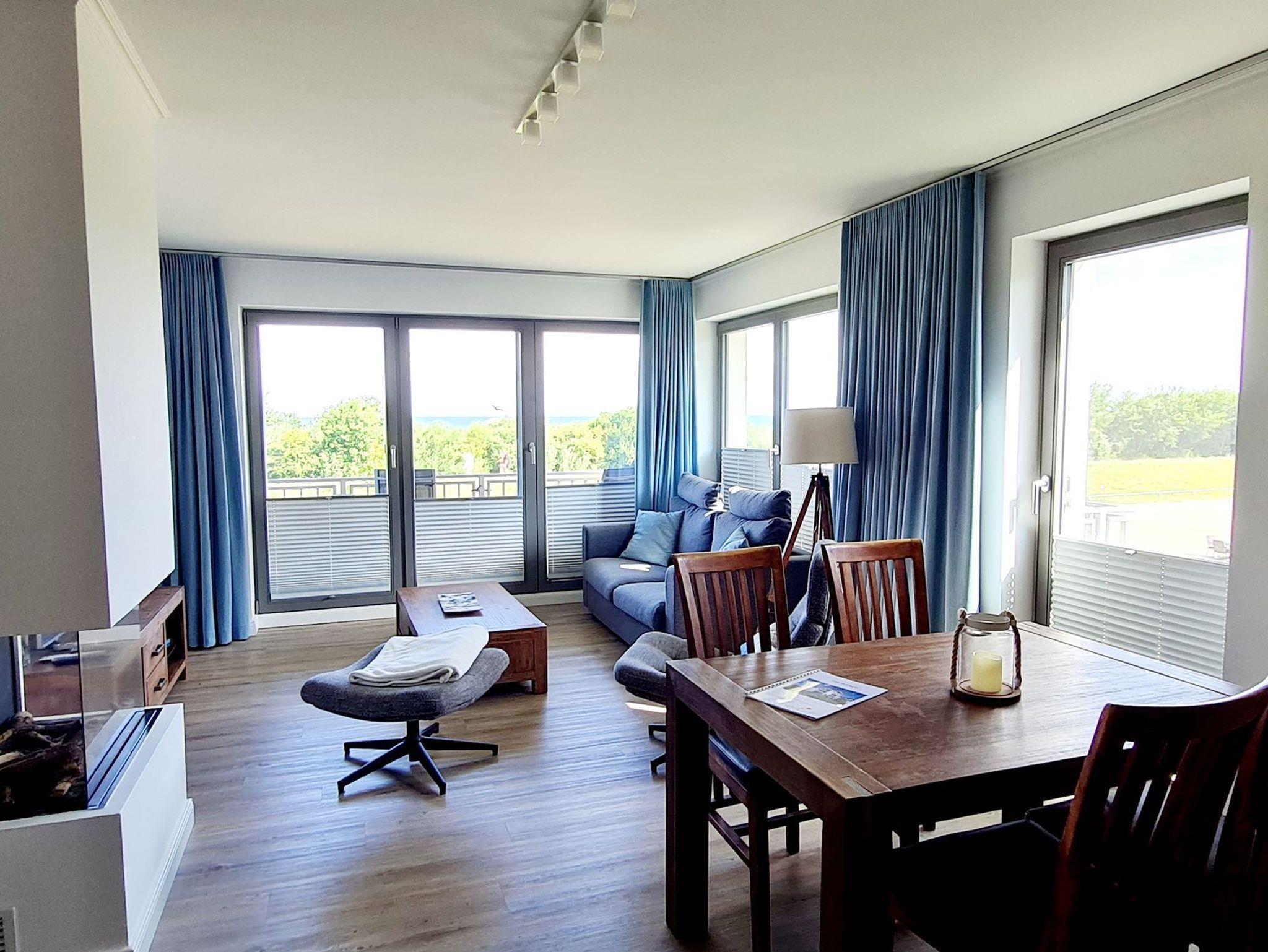 Die stilvoll modern eingerichtete 59 m² große Wohnung im ersten Obergeschoss ist für drei Personen und ein Kleinkind (bis 3 Jahre) geeignet. Mit einem traumhaften Blick auf die Ostsee lässt sie fast keine Wünsche offen. Genießen Sie einen unvergleichbaren Blick auf die Ostsee durch die großen Panoramafenster oder direkt vom Balkon. Der Wohnbereich empfängt Sie mit einer gemütlichen Schlafcouch (Liegefläche 140 x 200 cm) und einem modernen Gas- Kamin. Hier erleben sie auch in der kalten Jahreszeit unvergesslich schöne und erholsame Urlaubstage. Ein TV-Gerät mit integriertem DVD-Player, ein CD-Radio sowie eine kleine Bücher- und Spielesammlung stehen für die Unterhaltung zu Ihrer Verfügung. In der offenen Einbauküche finden Sie einen Hochbackofen, Cerankochfeld, Kühl- Gefrierkombination, Geschirrspüler, Mikrowelle, Kaffeemaschine, Wasserkocher und Toaster. Also alles, was Sie für die Zubereitung Ihrer Mahlzeiten benötigen. Ein Esstisch für den Verzehr ist selbstverständlich auch vorhanden. Genießen Sie die Ostseesonne und starten den Tag mit einem gemütlichen Frühstück (Beispielfoto) auf den bequemen Hochlehnern vom charmanten Balkon in Nord-Ost-Ausrichtung. Im Schlafzimmer empfängt Sie dann ein gemütliches Doppelbett und ein geräumiger Kleiderschrank, inklusive Beleuchtung. Zusätzlich sorgen Verdunklungsvorhänge und ein Insektenschutzgitter an den Fenstern für ruhige Nächte. Das Bad ist mit einer ebenerdigen Dusche und einem Doppelwaschtisch mit entsprechend großem Spiegel ausgestattet. Im separaten Abstellraum der Ferienwohnung stehen ein Bügeleisen und ein Bügelbrett bei Bedarf zu Ihrer Verfügung. Für angenehme Wärme sorgt die Fußbodenheizung, die in allen Räumen vorhanden ist. Eine kostenfreie Verbindung ins Internet, WLAN, steht in der gesamten Unterkunft bereit. Das Datenvolumen ist unbegrenzt, so dass Sie ohne Limit nach Herzenslust streamen und surfen können. Zur Wohnung gehören zudem ein kostenfreier Tiefgaragenstellplatz und eine Abstellmöglichkeit für Fahrräder. Bitte beachten Sie die Durchfahrtshöhe von max. 1,90 m der Tiefgarage. Mit einem Personenaufzug gelangen Sie von der Tiefgarage aus direkt zu Ihrer Wohnung. Im Erdgeschoss der Wohnung befindet sich ein gekennzeichneter Abstellbereich für Kinderwagen. Hier noch einige Hinweise: Es handelt sich um eine Nichtraucherwohnung. Haustiere sind nicht erlaubt. Für die kleinen Gäste stehen ein Kinderhochstuhl und ein Reisebett mit zusätzlicher Matratze bereit. Ab der dritten Person wird ein Aufschlag in Höhe von 10,00 €/ÜN berechnet. Ein Wäscheset kann pro Person kostenpflichtig zugebucht werden. Eine Waschmaschine und ein Trockner stehen im separaten Hauswirtschaftsraum im Untergeschoss der Villa zu Ihrer Verfügung (gegen Gebühr / 1,00 € Münzen). Sichern Sie sich einen der begehrten Strandkörbe nur ein paar Meter entfernt von den rauschenden Wellen der Ostsee (Anfang Mai - Ende August) und buchen Sie jetzt zu besonderen Konditionen (12,00 € pro Tag oder 75,00 € pro Woche.)