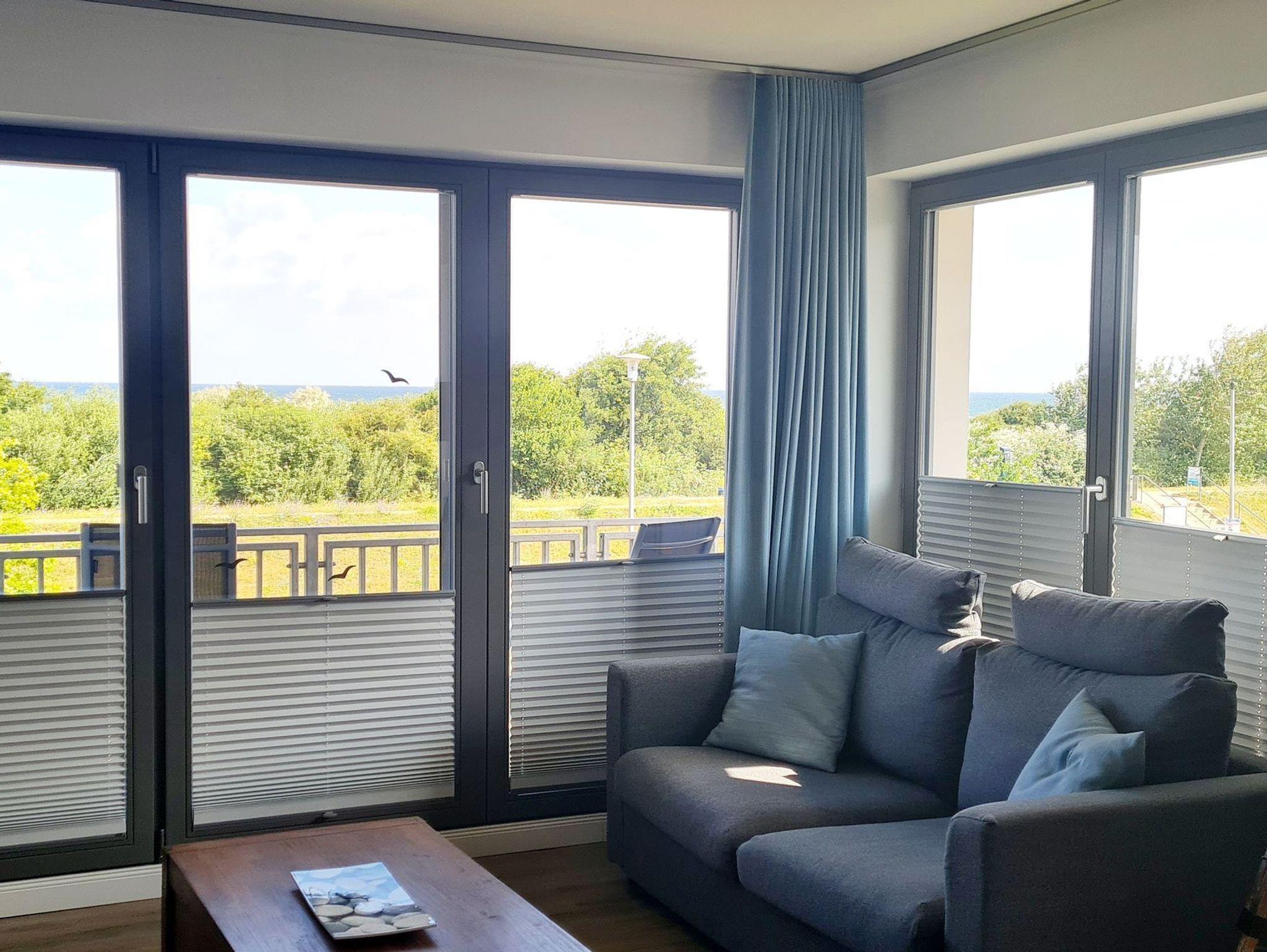 Die stilvoll modern eingerichtete 59 m² große Wohnung im ersten Obergeschoss ist für drei Personen und ein Kleinkind (bis 3 Jahre) geeignet. Mit einem traumhaften Blick auf die Ostsee lässt sie fast keine Wünsche offen. Genießen Sie einen unvergleichbaren Blick auf die Ostsee durch die großen Panoramafenster oder direkt vom Balkon. Der Wohnbereich empfängt Sie mit einer gemütlichen Schlafcouch (Liegefläche 140 x 200 cm) und einem modernen Gas- Kamin. Hier erleben sie auch in der kalten Jahreszeit unvergesslich schöne und erholsame Urlaubstage. Ein TV-Gerät mit integriertem DVD-Player, ein CD-Radio sowie eine kleine Bücher- und Spielesammlung stehen für die Unterhaltung zu Ihrer Verfügung. In der offenen Einbauküche finden Sie einen Hochbackofen, Cerankochfeld, Kühl- Gefrierkombination, Geschirrspüler, Mikrowelle, Kaffeemaschine, Wasserkocher und Toaster. Also alles, was Sie für die Zubereitung Ihrer Mahlzeiten benötigen. Ein Esstisch für den Verzehr ist selbstverständlich auch vorhanden. Genießen Sie die Ostseesonne und starten den Tag mit einem gemütlichen Frühstück (Beispielfoto) auf den bequemen Hochlehnern vom charmanten Balkon in Nord-Ost-Ausrichtung. Im Schlafzimmer empfängt Sie dann ein gemütliches Doppelbett und ein geräumiger Kleiderschrank, inklusive Beleuchtung. Zusätzlich sorgen Verdunklungsvorhänge und ein Insektenschutzgitter an den Fenstern für ruhige Nächte. Das Bad ist mit einer ebenerdigen Dusche und einem Doppelwaschtisch mit entsprechend großem Spiegel ausgestattet. Im separaten Abstellraum der Ferienwohnung stehen ein Bügeleisen und ein Bügelbrett bei Bedarf zu Ihrer Verfügung. Für angenehme Wärme sorgt die Fußbodenheizung, die in allen Räumen vorhanden ist. Eine kostenfreie Verbindung ins Internet, WLAN, steht in der gesamten Unterkunft bereit. Das Datenvolumen ist unbegrenzt, so dass Sie ohne Limit nach Herzenslust streamen und surfen können. Zur Wohnung gehören zudem ein kostenfreier Tiefgaragenstellplatz und eine Abstellmöglichkeit für Fahrräder. Bitte beachten Sie die Durchfahrtshöhe von max. 1,90 m der Tiefgarage. Mit einem Personenaufzug gelangen Sie von der Tiefgarage aus direkt zu Ihrer Wohnung. Im Erdgeschoss der Wohnung befindet sich ein gekennzeichneter Abstellbereich für Kinderwagen. Hier noch einige Hinweise: Es handelt sich um eine Nichtraucherwohnung. Haustiere sind nicht erlaubt. Für die kleinen Gäste stehen ein Kinderhochstuhl und ein Reisebett mit zusätzlicher Matratze bereit. Ab der dritten Person wird ein Aufschlag in Höhe von 10,00 Euro/ÜN berechnet. Ein Wäscheset kann pro Person kostenpflichtig zugebucht werden. Eine Waschmaschine und ein Trockner stehen im separaten Hauswirtschaftsraum im Untergeschoss der Villa zu Ihrer Verfügung (gegen Gebühr / 1,00 Euro Münzen). Sichern Sie sich einen der begehrten Strandkörbe nur ein paar Meter entfernt von den rauschenden Wellen der Ostsee (Anfang Mai - Ende August) und buchen Sie jetzt zu besonderen Konditionen (12,00 Euro pro Tag oder 75,00 Euro pro Woche.)
