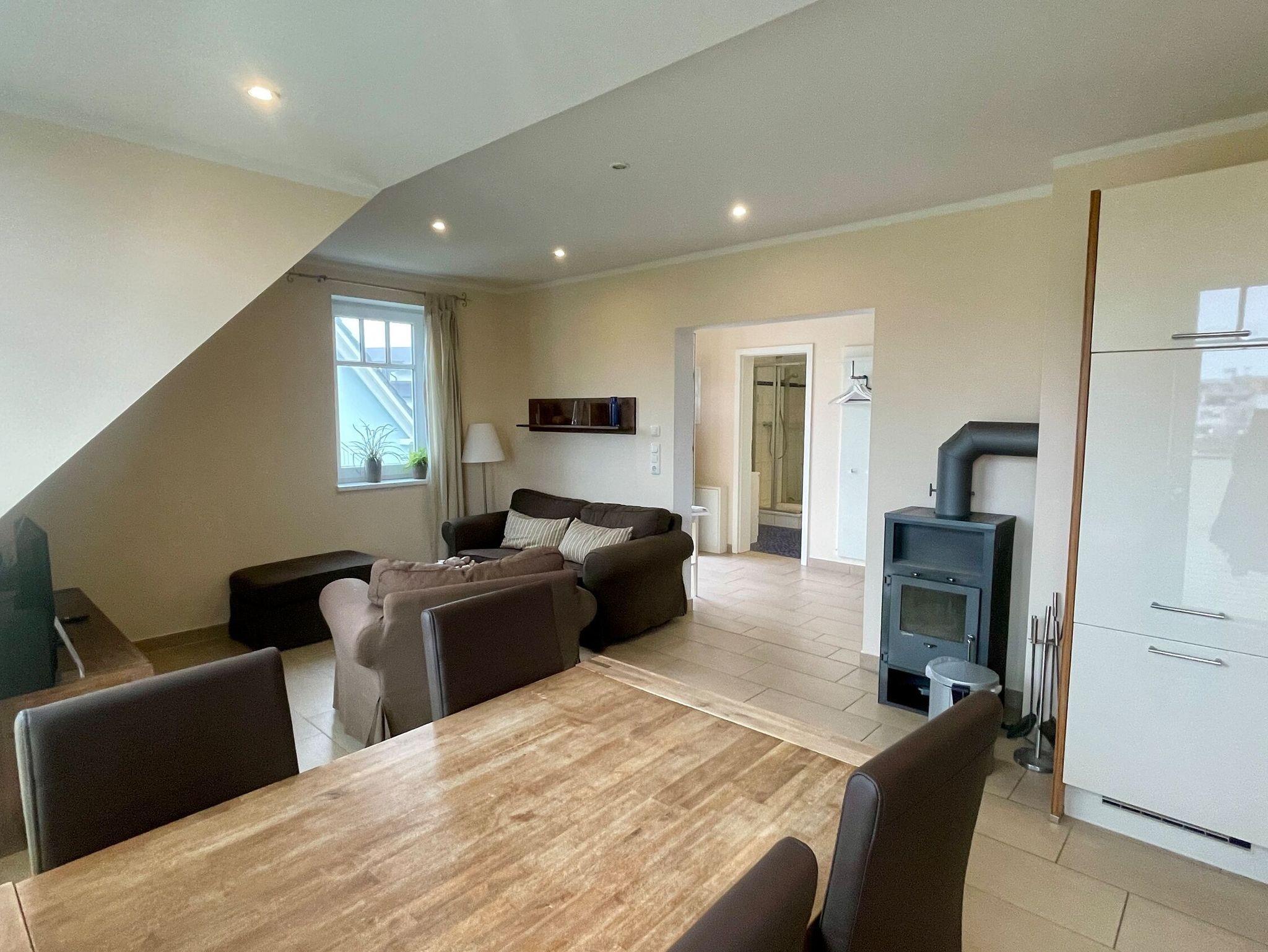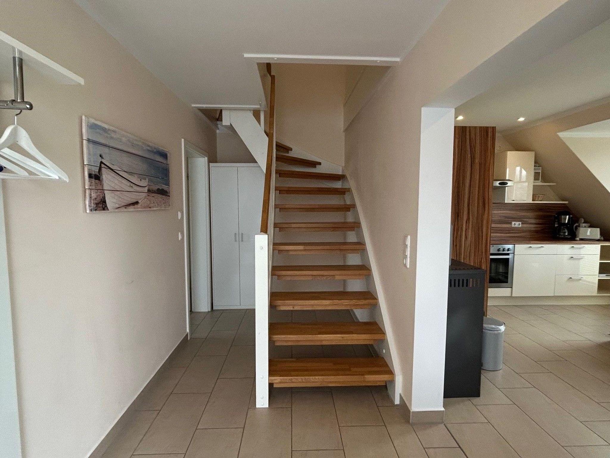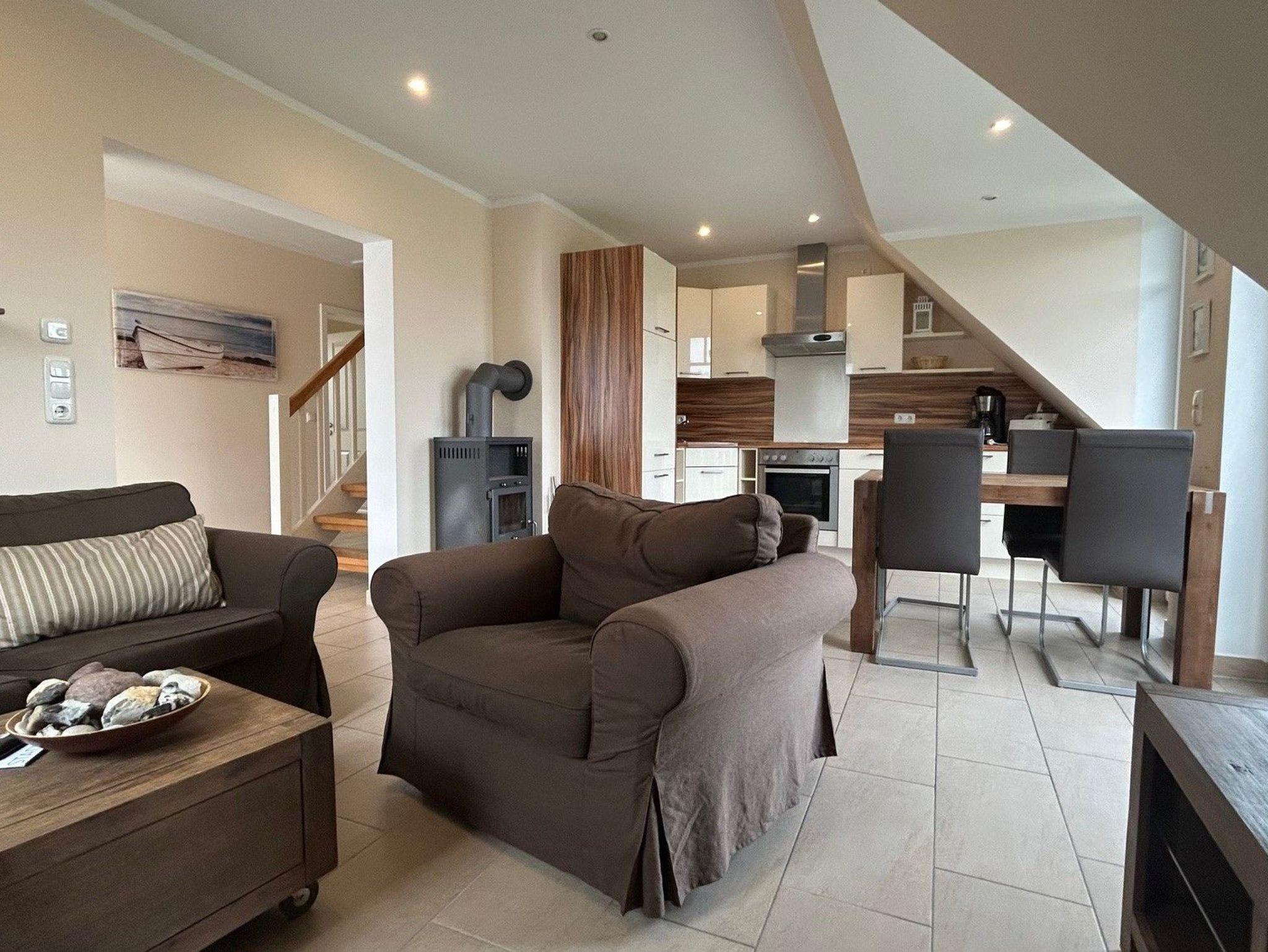 Diese charmante Ferienwohnung im Obergeschoss bietet auf 65 m² ausreichend Platz für 4 Personen. Sie verfügt über 2 Schlafzimmer mit Doppelbetten, eine gut ausgestattete Küche (inkl. Geschirrspüler und Backofen) und einen gemütlichen Wohnbereich mit Kaminofen. Der Balkon ist ideal zum Entspannen an schönen Tagen. Haustiere sind erlaubt. Der Strand ist nur 150 Meter entfernt, und ein PKW-Stellplatz ist vorhanden.