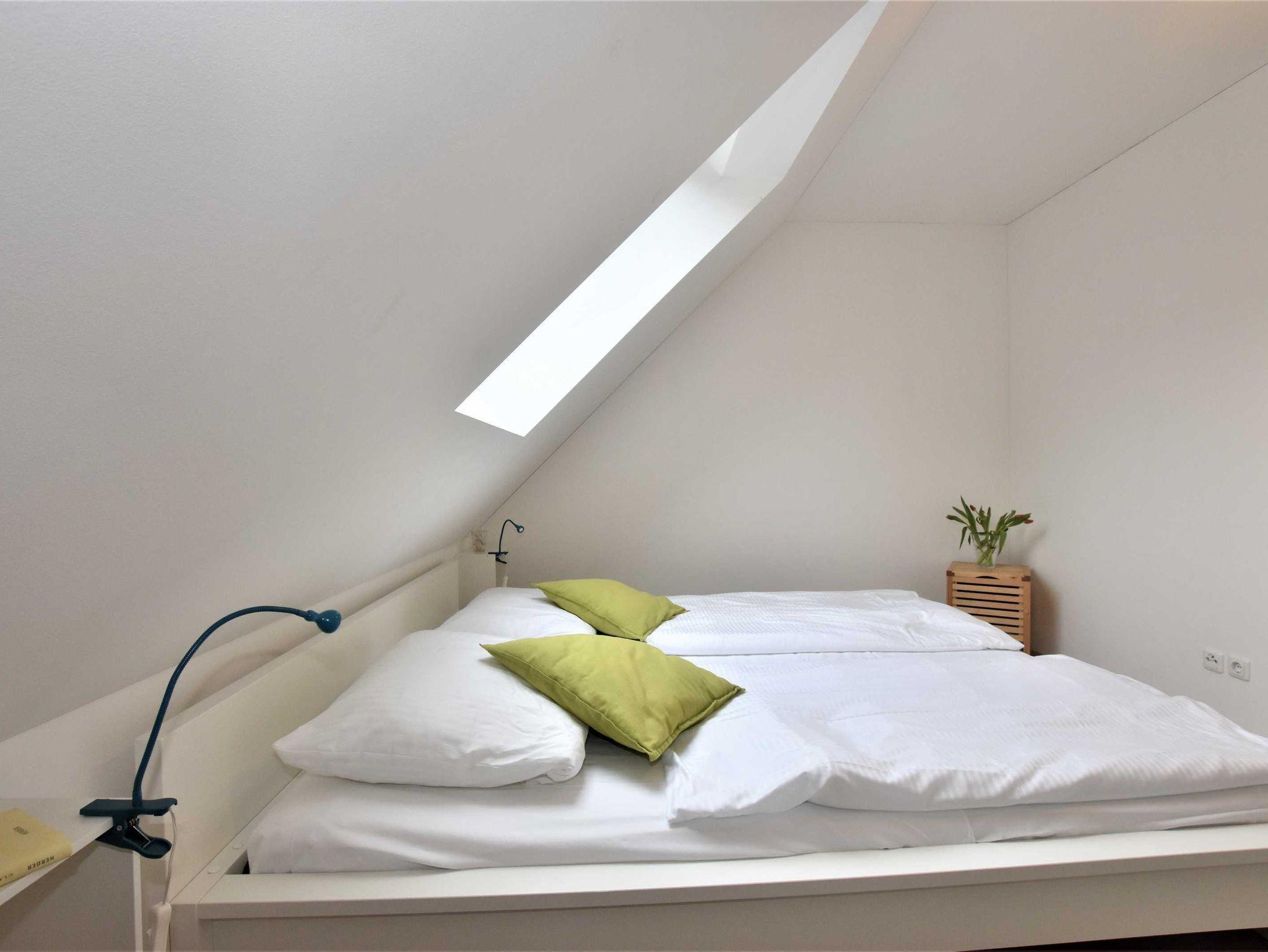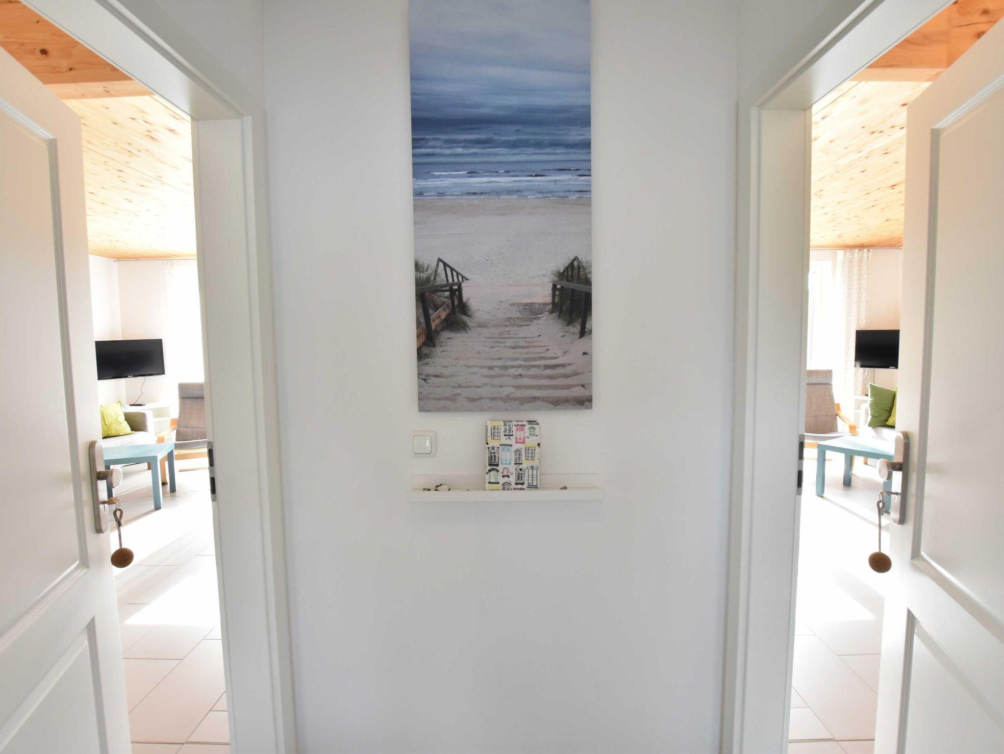 Im oberen Bereich der Ferienwohnung: In das Obergeschoss gelangt man über einen hellen und freundlichen Treppenbereich. Hier befinden sich zwei separate Schlafzimmer. Beide sind mit einem Doppelbett (1,80 x 2m) und ausreichend Stauraum im Kleiderschrank ausgestattet. Ein Schlafzimmer verfügt außerdem über ein zusätzliches TV- Gerät.