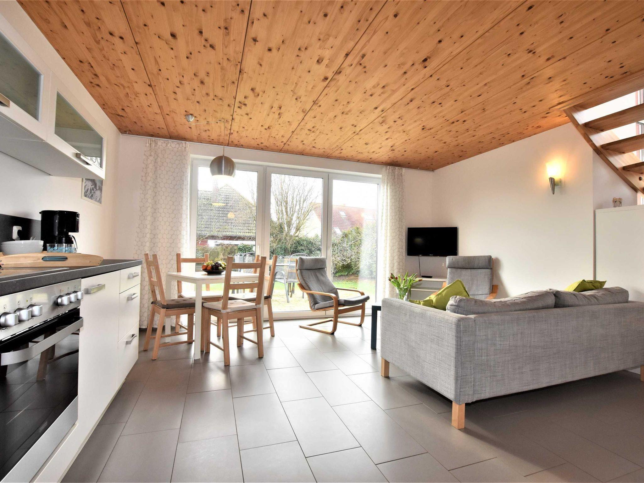 Die helle und gemütliche Ferienwohnung Steuerbord verteilt sich über zwei Etagen und bietet Platz für 4 Personen. Im unteren Bereich der Ferienwohnung: Großzügiger Wohn- Essbereich mit einer umfangreich ausgestatteten Küche (4- Plattenherd, Backofen, Kaffeemaschine, Wasserkocher, Kühlschrank, Toaster, Geschirrspüler), Esstisch und gemütliche Sofaecke mit TV (inkl. Radio und USB- Anschluss). Bad mit Dusche und WC.