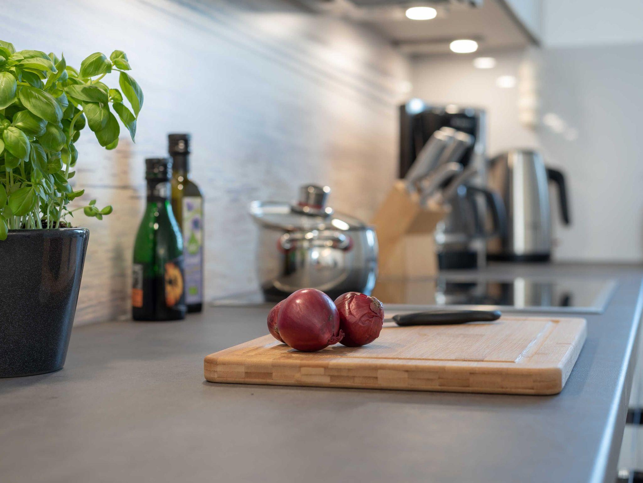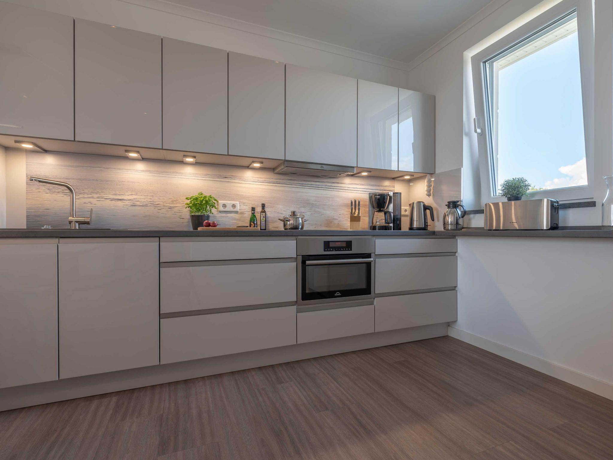 · einer voll ausgestatteten Küchenzeile: Herd mit im Backofen, Mikrowelle, Spülmaschine (Siemens), Kühl- und Gefrierschrank und diverse Elektrokleingeräte