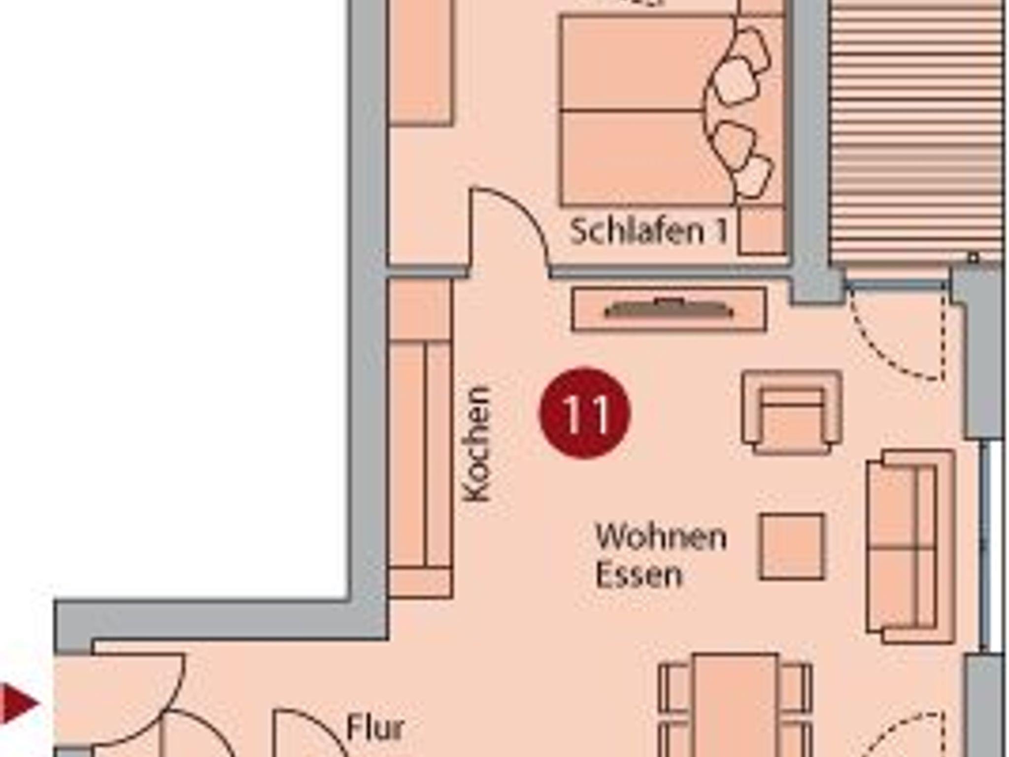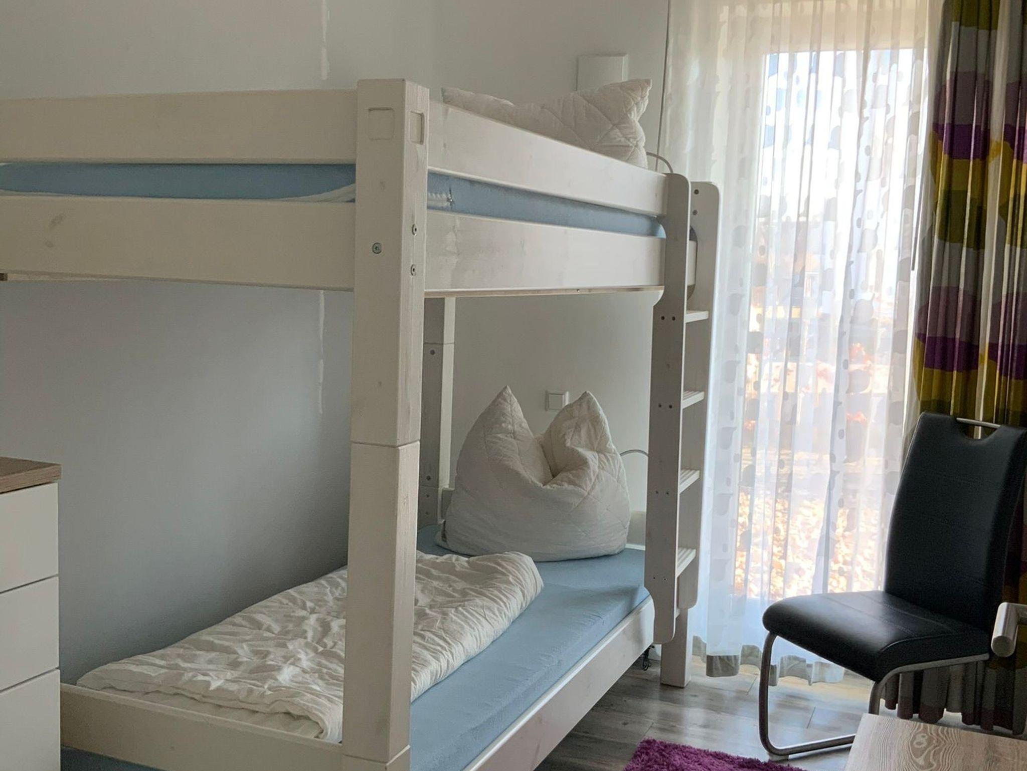 Die großzügige Wohnung ist für vier Erwachsene und einem Kind (bis 12 Jahre) eingerichtet. Im ersten Schlafzimmer finden Sie ein Doppelbett mit einem Schiebetürenschrank. Das zweite Schlafzimmer ist mit einem Etagenbett und Highboard ausgestattet. Im modernen Wohnbereich erwarten Sie eine Schlafcouch sowie zwei Sessel, zur Unterhaltung gibt es einen Flatscreen-TV, Stereoanlage und DVD-Player. Im offenen Koch- und Essbereich finden Sie die Einbauküche und einen Tisch mit sechs Stühlen. Die voll ausgestattete Einbauküche bietet Ihnen alles was Sie für Ihren Aufenthalt benötigen und verfügt über Geschirrspüler, Kühlschrank, Backofen mit Cerankochfeld und Mikrowelle. Vom Wohnraum sowie vom ersten Schlafzimmer gelangen Sie auf die nach Nord-Westen ausgerichtete Terrasse mit sechs bequemen Terrassenstühlen. Das Bad hat eine bodengleiche Dusche, einen Waschtisch mit großem Spiegel und einen Fön. Zusätzlich hat die Wohnung ein separates Gäste-WC.