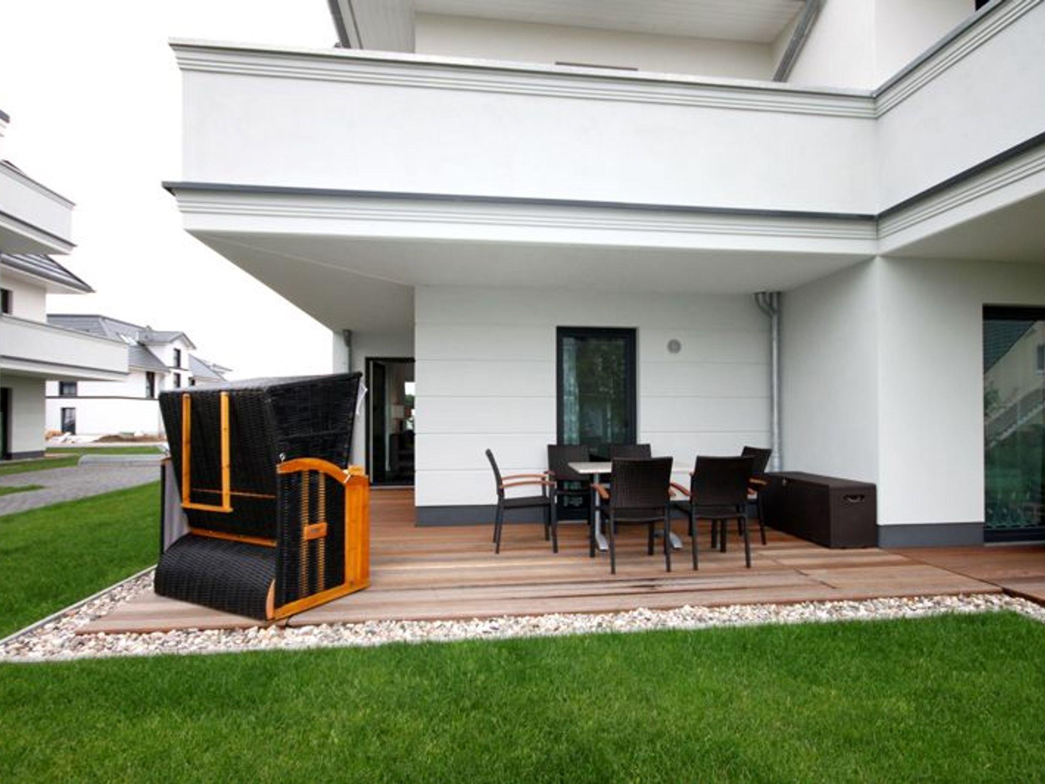 Freundliche Drei-Zimmer-Wohnung im Erdgeschoss mit Terrasse und einem Strandkorb.