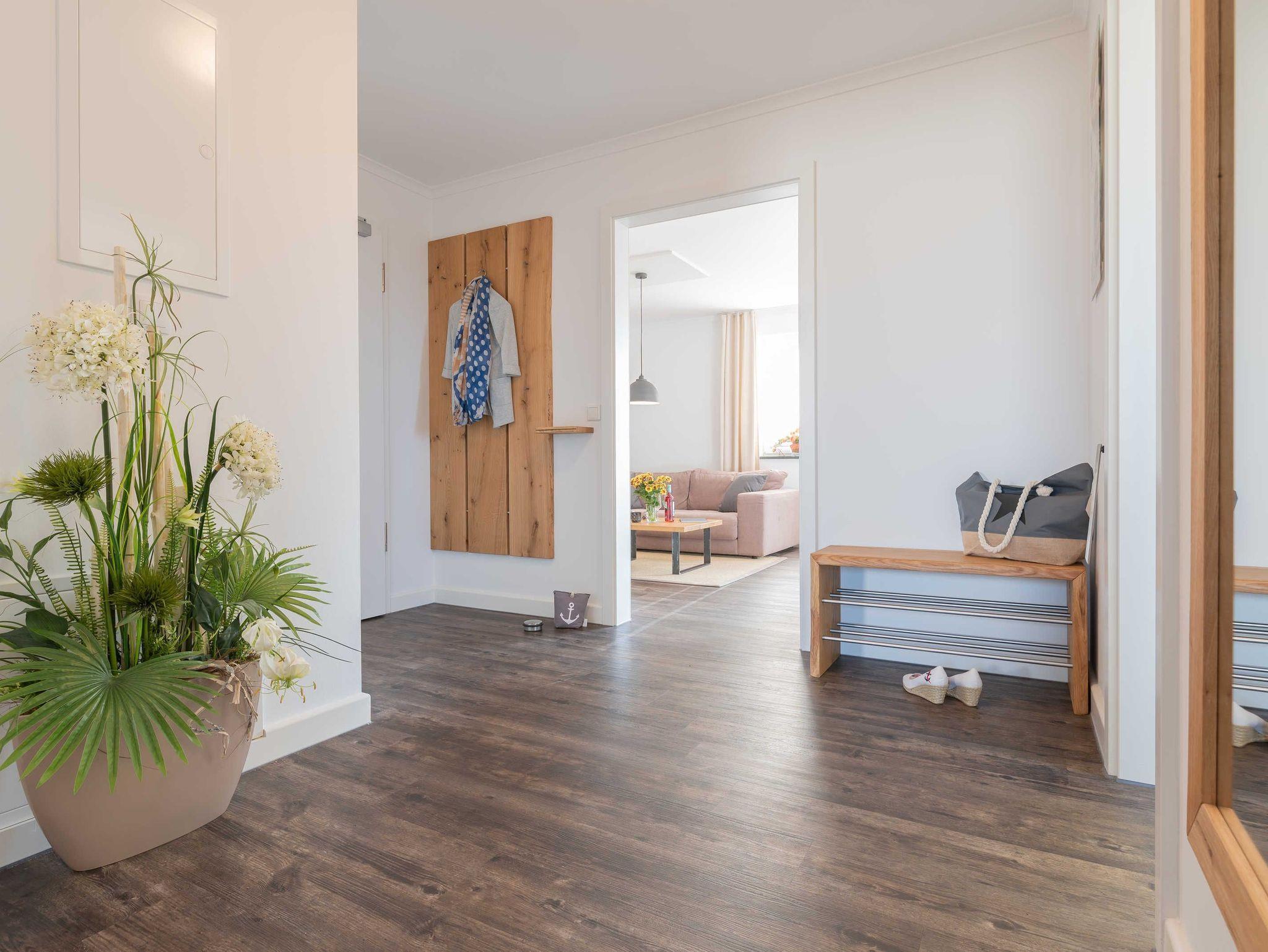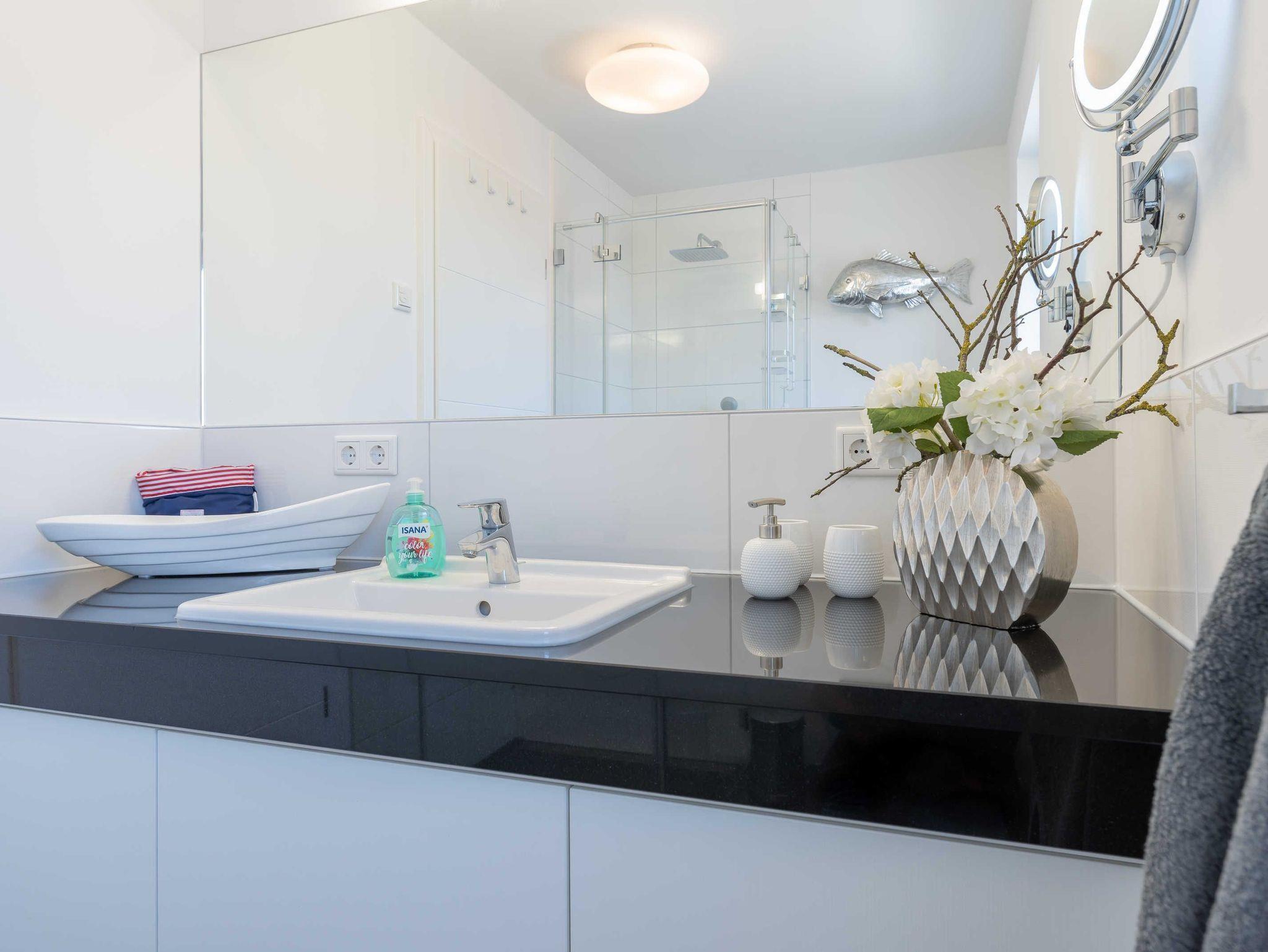 Aus dem einladenden und vor allem funktional eingerichteten Flur haben Sie kurze Wege zu den anderen Räumen. Das liebevoll eingerichtete Wohn- und Esszimmer ist bestens ausgestattet. So verfügt der Küchenbereich über eine große Kühl- und Gefrierkombination (160 l / 57 l), damit mehr als ein Eis für die heißen Tage des Jahres vorgehalten werden kann. Die Mikrowelle ist platzsparend im leicht zu bedienenden Backofen integriert. Abgerundet wird die Küche neben einem großen und vor allem leisen Geschirrspüler durch ein Induktionskochfeld mit passender Dunstabzugshaube. Zum Essen lädt Sie neben dem Balkon (Tisch, 4 Stühle sowie Sonnenschirm) auch der große Esstisch (1,80 m x 1,00 m) ein. Dieser eignet sich hervorragend, um den Abend im Kreise der Familie mit Gesellschaftsspielen ausklingen zu lassen. Abgerundet wird der Wohnbereich durch eine hochwertige Eckcouch, welche extra so ausgesucht wurde, dass alle Urlaubsgäste unserer Ferienwohnung „Treibholz“ ihren Platz finden. Man wird in ihr versinken und die Beine kann man getrost austrecken. So darf ein Urlaubstag gerne enden! Im Bereich der Unterhaltungselektronik haben wir darauf geachtet, dass Sie alle modernen Medien vollumfänglich mittels WLAN nutzen können. Der Flatscreen-TV verfügt ferner über eine Radiofunktion. Weiterhin stehen Ihnen ein DVD-Player und eine Soundbar zur Verfügung. Letztere können Sie auch per Bluetooth mit Ihrem Endgerät verbinden.