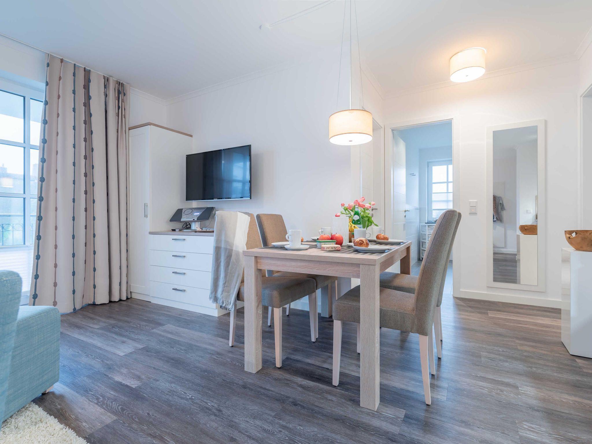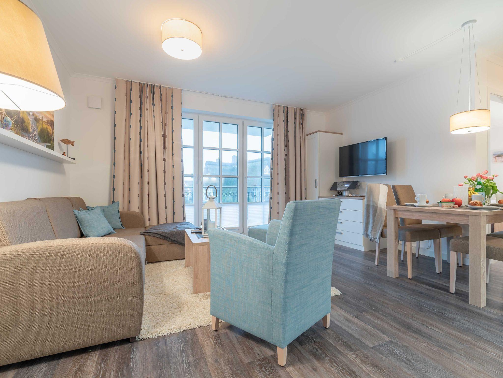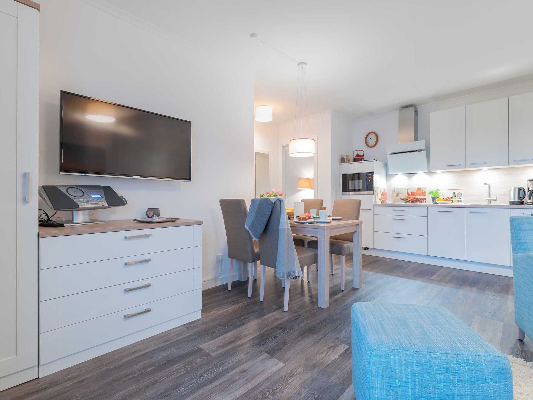 Der Wohnbereich mit Zugang zum Balkon ist hell und lichtdurchflutet. Das große bequeme Ecksofa mit Schlaffunktion und einem Topper (Liegefläche 150 x 200 cm) wird ergänzt durch einen Sessel mit Fußhocker, einem Flat-TV und einer Musikanlage. Ein klassischer Holzesstisch mit vier Stühlen vervollständigt die Einrichtung. Die hochwertige Einbauküche verfügt über einen Kühlschrank mit Tiefkühlfach, ein Vier-Platten-Glaskeramikkochfeld, eine Mikrowelle mit Grillfunktion, eine Kaffeemaschine, einen Toaster, einen Wasserkocher, einen Mixer und eine Küchenwaage. Das erste Schlafzimmer ist mit einem komfortablen Boxspringbett (180 x 200 cm / getrennte Matratzen) und einem geräumigen Kleiderschrank ausgestattet. Des Weiteren befindet sich hier noch ein Flachbild-TV. Ein weiteres Zimmer bietet die Möglichkeit einer ausklappbaren Couch mit kleinem Tisch und einem Kleiderschrank. Verdunklungsplissees sowie Verdunklungsgardinen sorgen für die nötige Nachtruhe. Die Zimmer bieten genug Platz für ein Kinderreisebett. Dies beziehungsweise Wäscheset und Kinderhochstuhl können kostenpflichtig zugebucht werden. Die eingebaute Fußbodenheizung verteilt wohlige Wärme in allen Räumen. Das helle Badezimmer mit bodengleicher Dusche verfügt über einen großen Waschtisch, ein Ablageregal mit Haartrockner, Handtuchheizkörper und ein Fenster für frische Küstenluft. Vom Balkon aus haben Sie Blick auf das Meer.