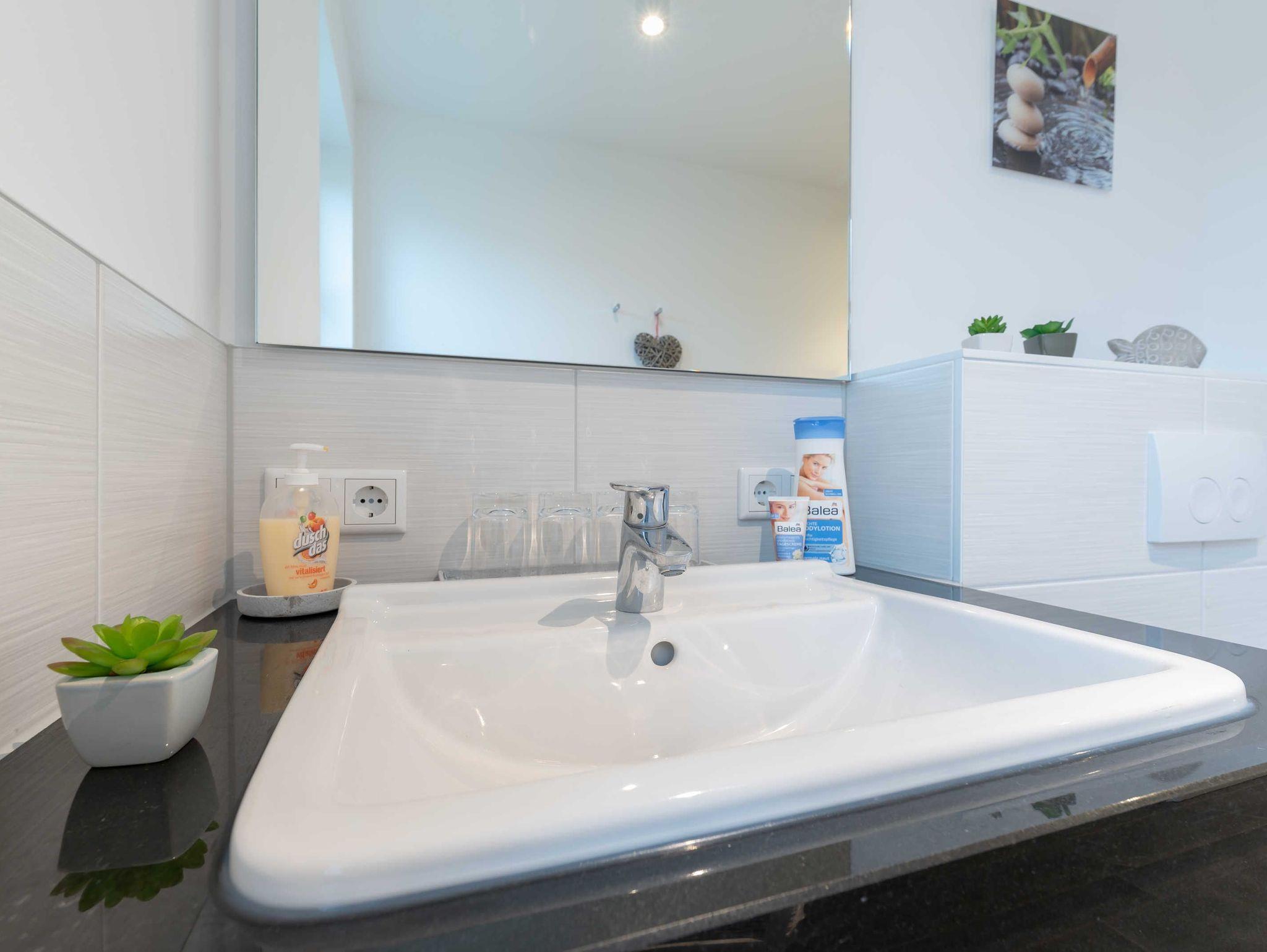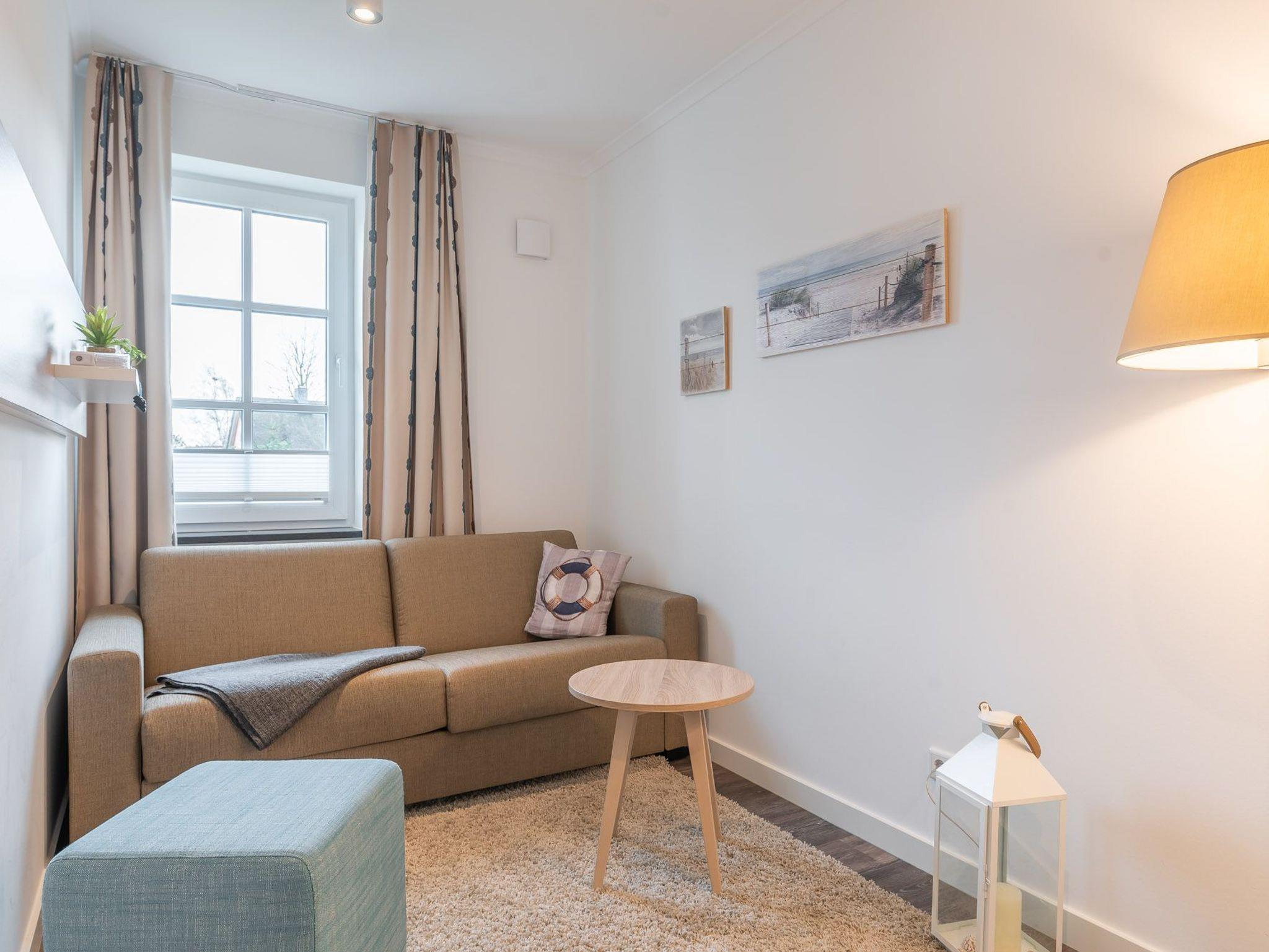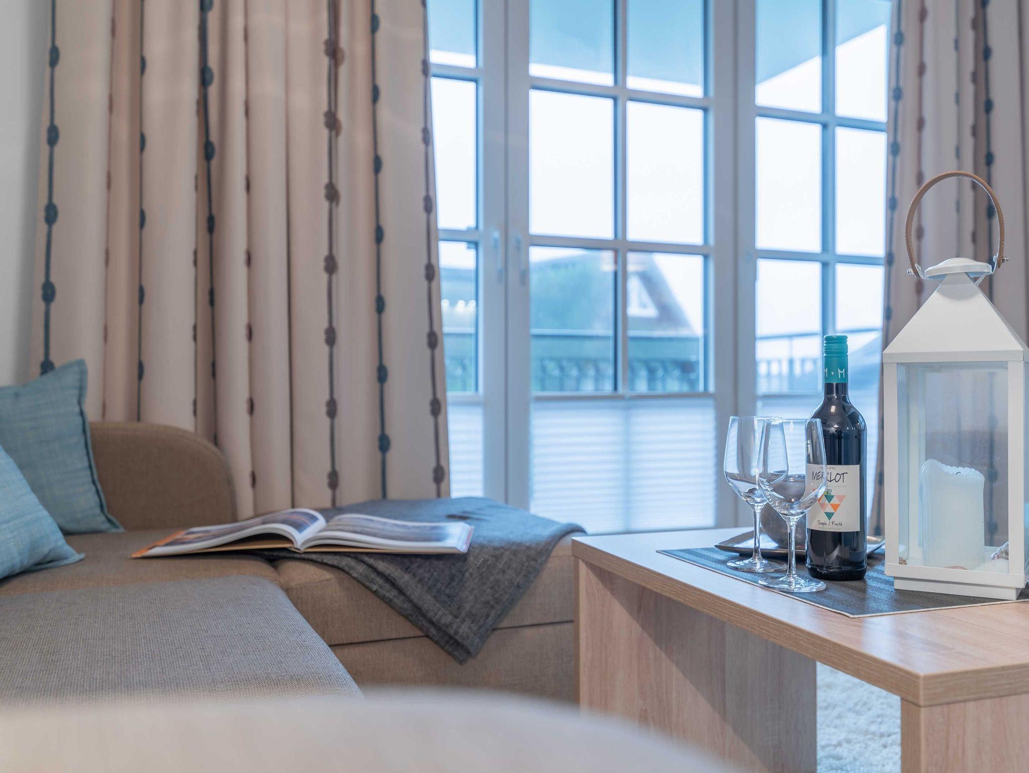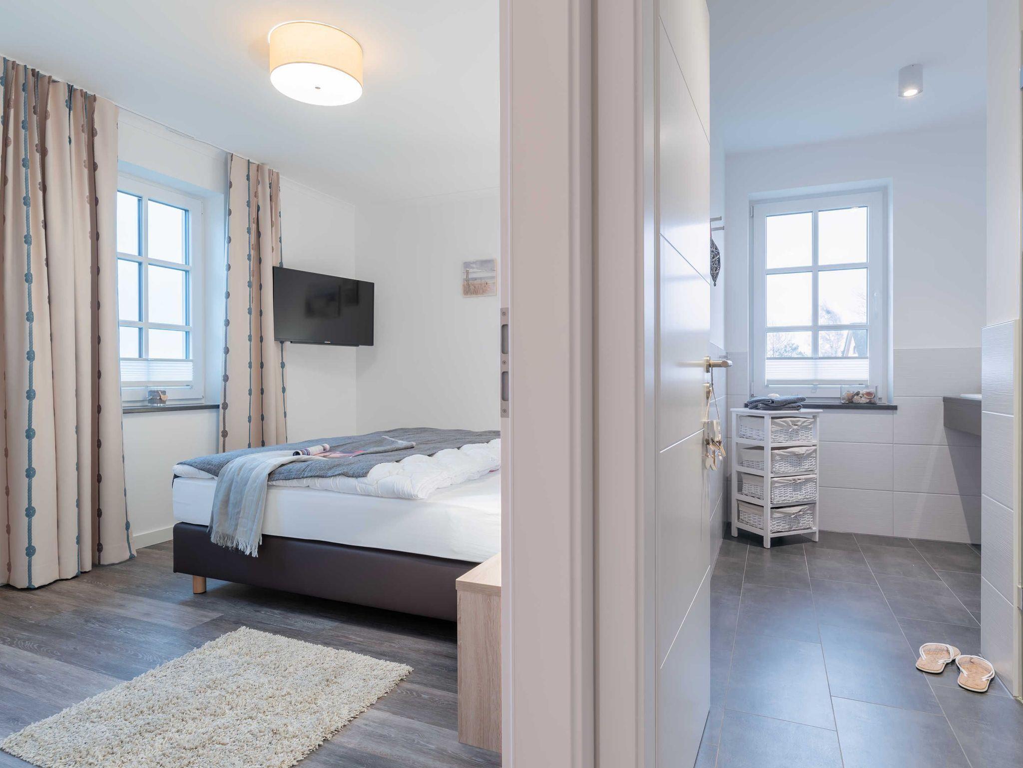 Der Wohnbereich mit Zugang zum Balkon ist hell und lichtdurchflutet. Das große bequeme Ecksofa mit Schlaffunktion und einem Topper (Liegefläche 150 x 200 cm) wird ergänzt durch einen Sessel mit Fußhocker, einem Flat-TV und einer Musikanlage. Ein klassischer Holzesstisch mit vier Stühlen vervollständigt die Einrichtung. Die hochwertige Einbauküche verfügt über einen Kühlschrank mit Tiefkühlfach, ein Vier-Platten-Glaskeramikkochfeld, eine Mikrowelle mit Grillfunktion, eine Kaffeemaschine, einen Toaster, einen Wasserkocher, einen Mixer und eine Küchenwaage. Das erste Schlafzimmer ist mit einem komfortablen Boxspringbett (180 x 200 cm / getrennte Matratzen) und einem geräumigen Kleiderschrank ausgestattet. Des Weiteren befindet sich hier noch ein Flachbild-TV. Ein weiteres Zimmer bietet die Möglichkeit einer ausklappbaren Couch mit kleinem Tisch und einem Kleiderschrank. Verdunklungsplissees sowie Verdunklungsgardinen sorgen für die nötige Nachtruhe. Die Zimmer bieten genug Platz für ein Kinderreisebett. Dies beziehungsweise Wäscheset und Kinderhochstuhl können kostenpflichtig zugebucht werden. Die eingebaute Fußbodenheizung verteilt wohlige Wärme in allen Räumen. Das helle Badezimmer mit bodengleicher Dusche verfügt über einen großen Waschtisch, ein Ablageregal mit Haartrockner, Handtuchheizkörper und ein Fenster für frische Küstenluft. Vom Balkon aus haben Sie Blick auf das Meer.