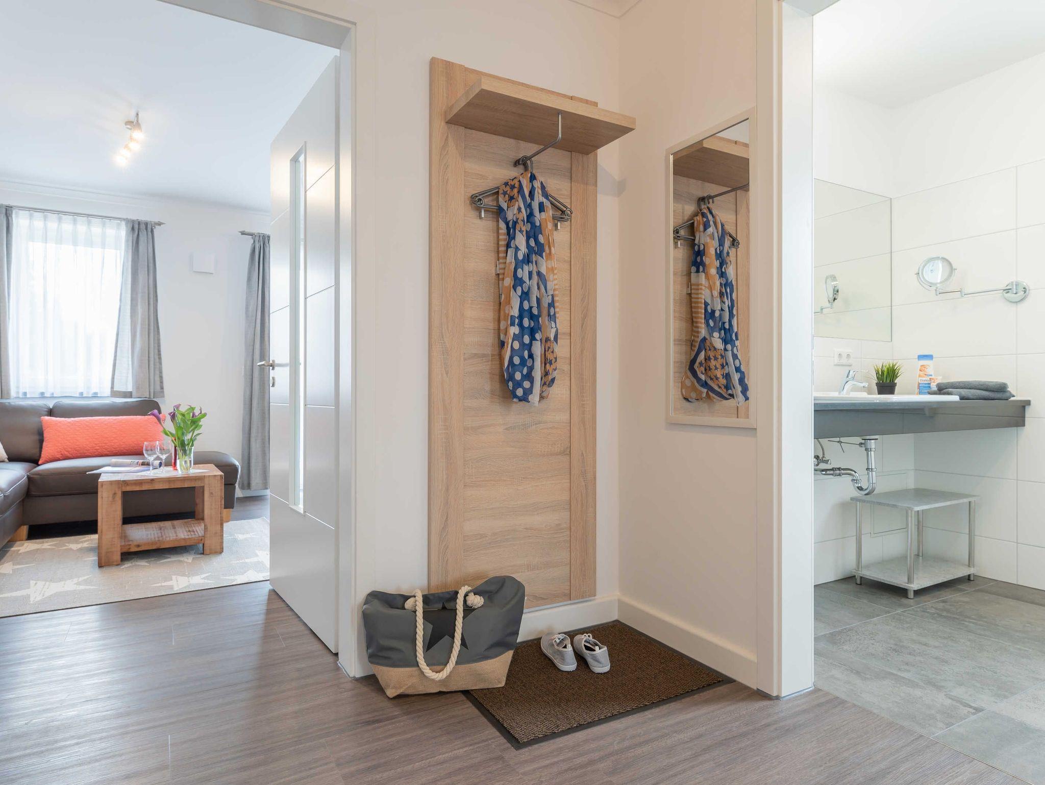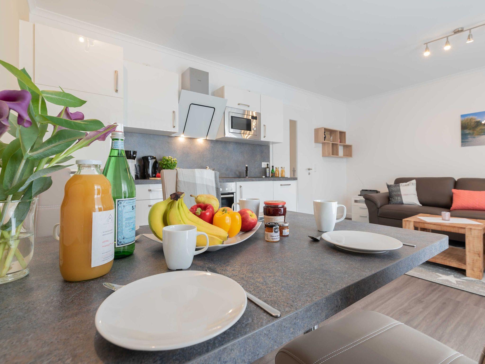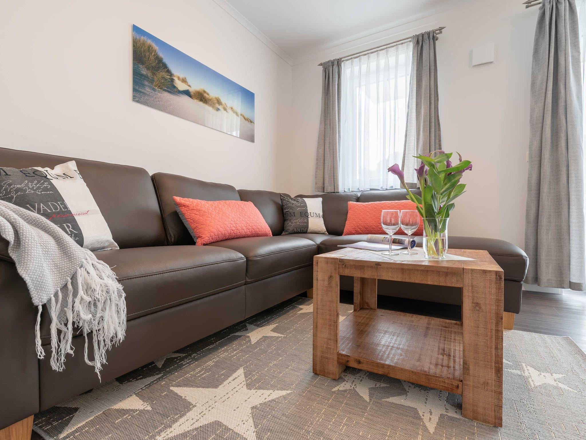 Diese schöne 61 qm große Ferienwohnung ist für 4 Personen ausgestattet. Im Wohnraum befinden sich eine gemütliche Eckcouch, ein Flachbild-TV und ein Esstisch mit bequemen Stühlen. Vom hier aus haben Sie Zugang zur Terrasse. Der offene Koch- und Essbereich mit komplett ausgestatteter, moderner Einbauküche bietet Mikrowelle, Backofen, Geschirrspüler und Kühlschrank inklusive Gefrierfach. Im ersten Schlafzimmer empfangen Sie ein großes Doppelbett und ein geräumiger Kleiderschrank. Im zweiten Schlafzimmer erwarten Sie eine Schlafcoach und ebenfalls ein Kleiderschrank. Das Bad ist mit einer bodengleichen Dusche und einem großen Waschtisch mit durchgehenden Spiegel ausgestattet.
