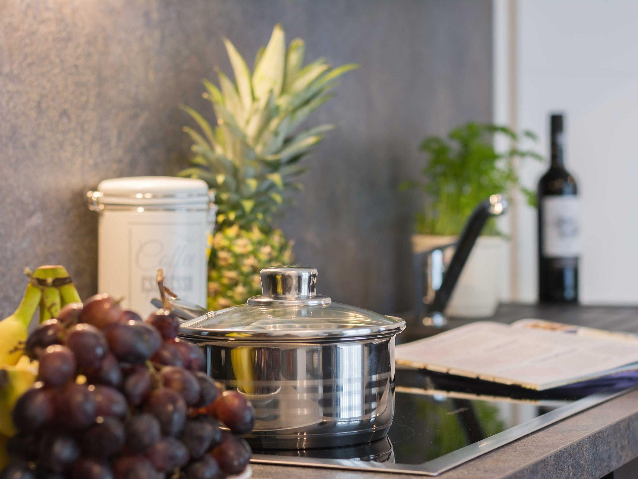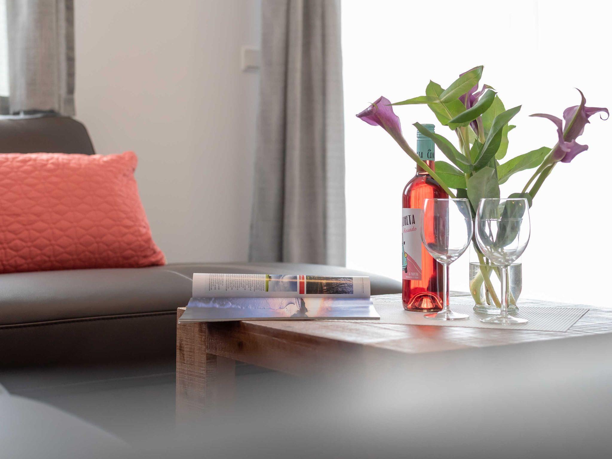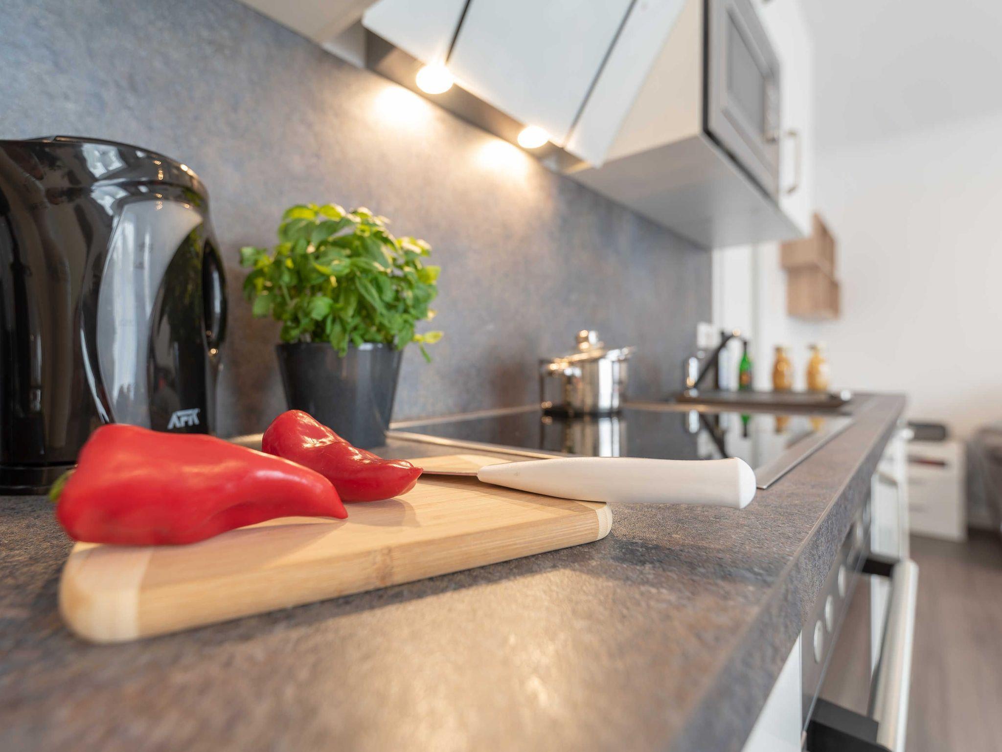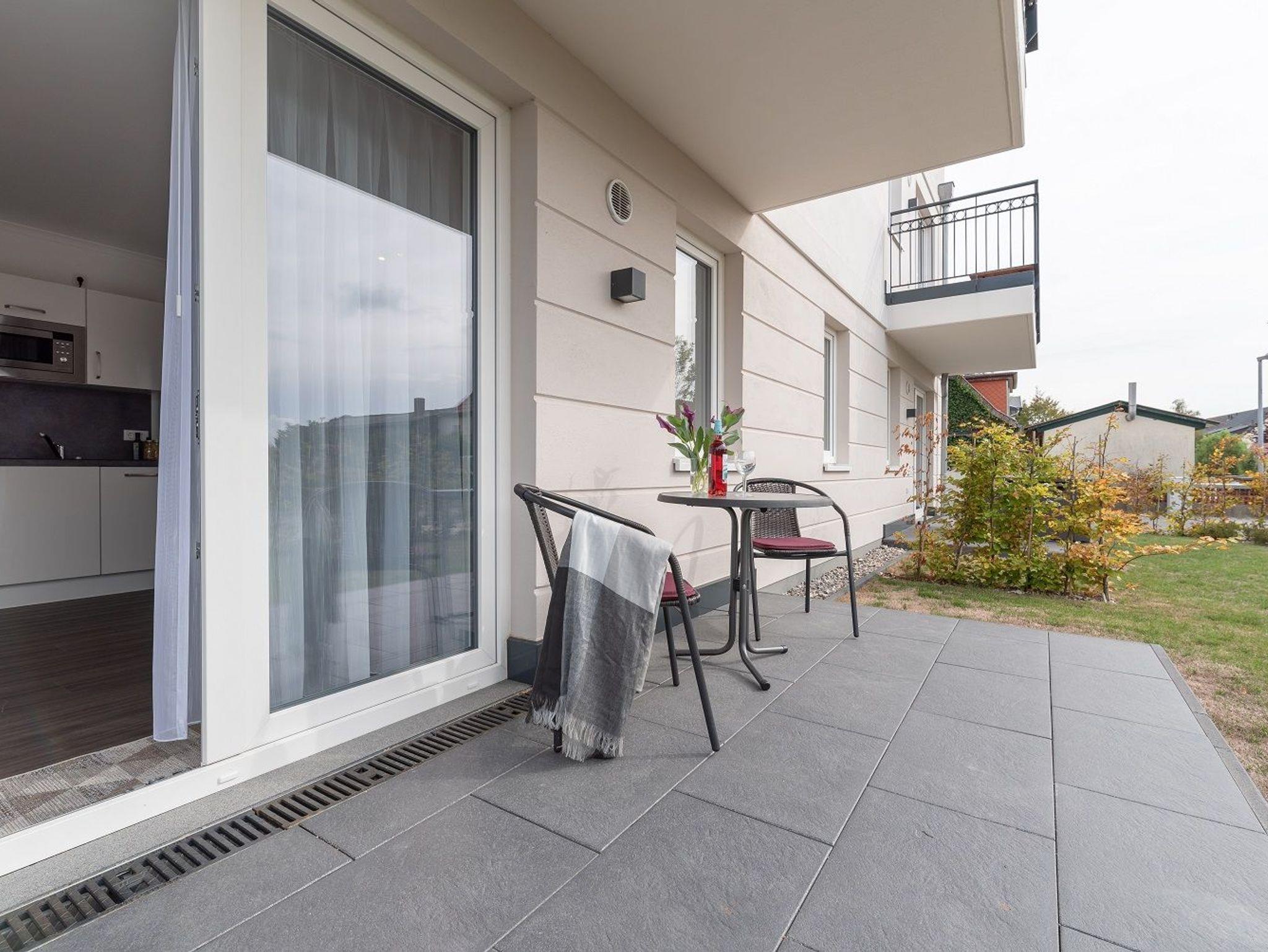 Diese schöne 61 qm große Ferienwohnung ist für 4 Personen ausgestattet. Im Wohnraum befinden sich eine gemütliche Eckcouch, ein Flachbild-TV und ein Esstisch mit bequemen Stühlen. Vom hier aus haben Sie Zugang zur Terrasse. Der offene Koch- und Essbereich mit komplett ausgestatteter, moderner Einbauküche bietet Mikrowelle, Backofen, Geschirrspüler und Kühlschrank inklusive Gefrierfach. Im ersten Schlafzimmer empfangen Sie ein großes Doppelbett und ein geräumiger Kleiderschrank. Im zweiten Schlafzimmer erwarten Sie eine Schlafcoach und ebenfalls ein Kleiderschrank. Das Bad ist mit einer bodengleichen Dusche und einem großen Waschtisch mit durchgehenden Spiegel ausgestattet.