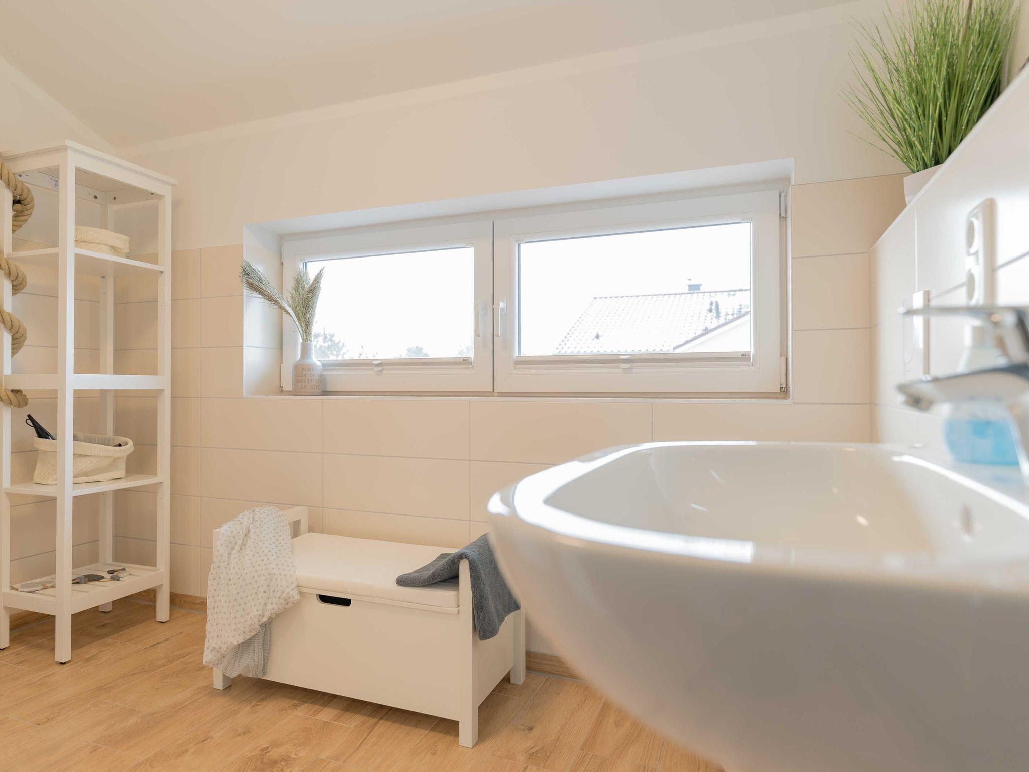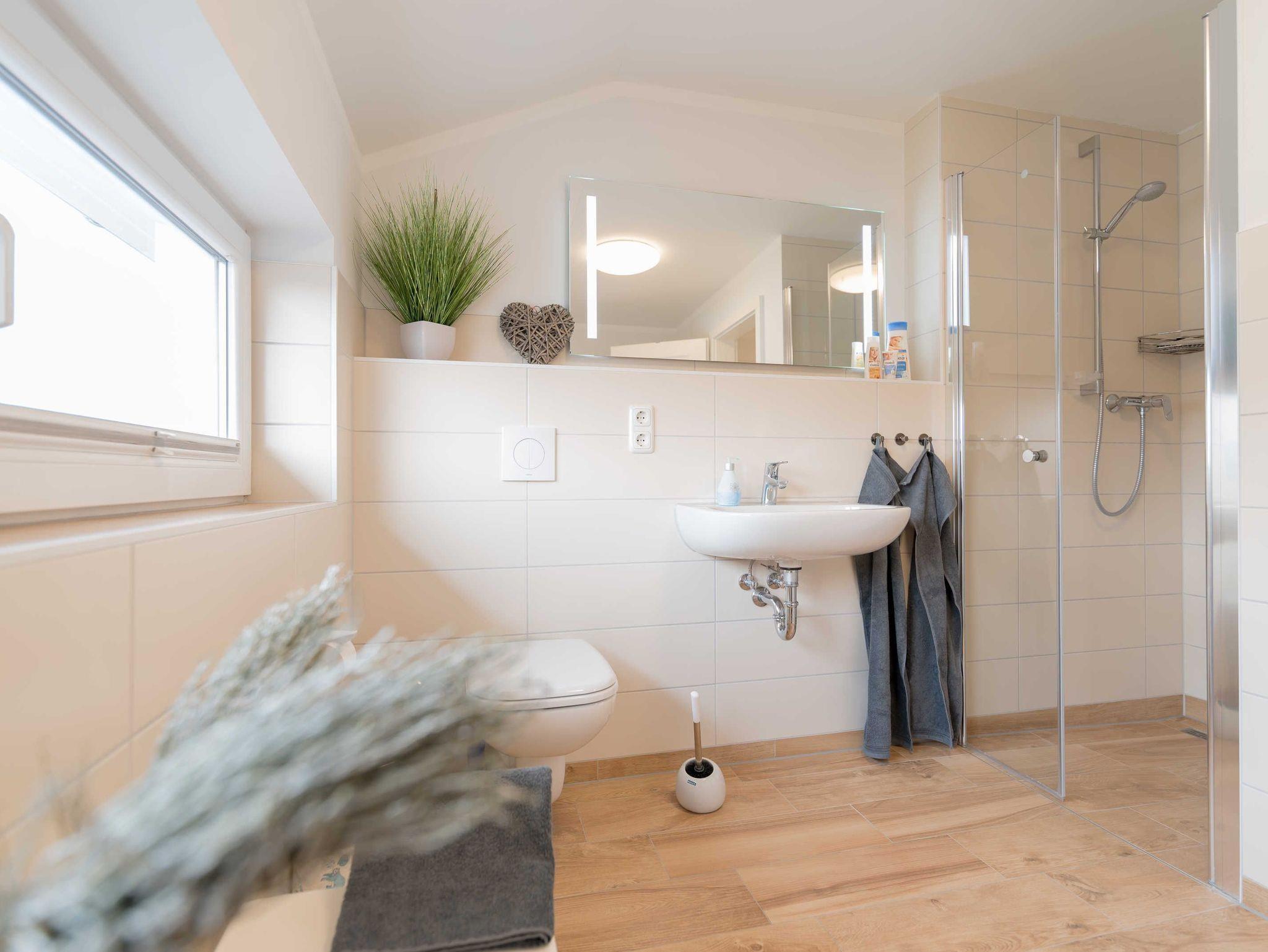 Das Badezimmer besticht mit bodengleicher Dusche, beleuchtetem Spiegel, beheizbarem Handtuchhalter und Fön.