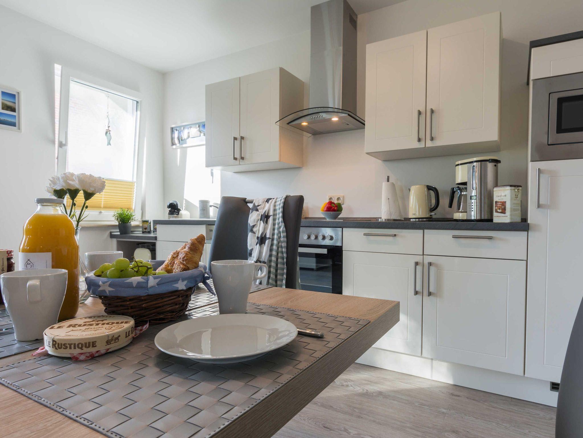 Es erwarten Sie eine sehr gut ausgestattete, offene Einbauküche mit Geschirrspüler, Backofen inklusive Cerankochfeld, Mikrowelle, Kühlschrank inklusive Gefrierfach, Kaffeemaschine, Bosch Tassimo Kapselmaschine, Wasserkocher, Toaster sowie ein Esstisch mit vier Stühlen. Im gemütlichen Wohnbereich befinden sich eine Schlafcouch (1,60 x 2,00 m Liegefläche), ein Radio und ein Flatscreen-TV inkl. DVD-Player. Außerdem stehen unseren Gästen eine Auswahl an Spielen, ein Wäscheständer sowie ein Staubsauger zur Verfügung. Das Schlafzimmer überzeugt mit einem Doppelbett (1,80 x 2,00 m bestehend aus zwei Einzelmatratzen 0,90 x 2,00 m ), einem geräumigen Kleiderschrank und einem weiteren Flatscreen-TV inkl. DVD-Player. Das Bad ist ausgestattet mit einer bodengleichen Dusche, einem Waschtisch, einem Handtuchtrockner und einem Föhn. Die beiden mit Gartenmöbeln ausgestatteten Terrassen laden von Sonnenaufgang bis Sonnenuntergang zum Verweilen ein. Die Unterkunft wird über eine Fußbodenheizung erwärmt.