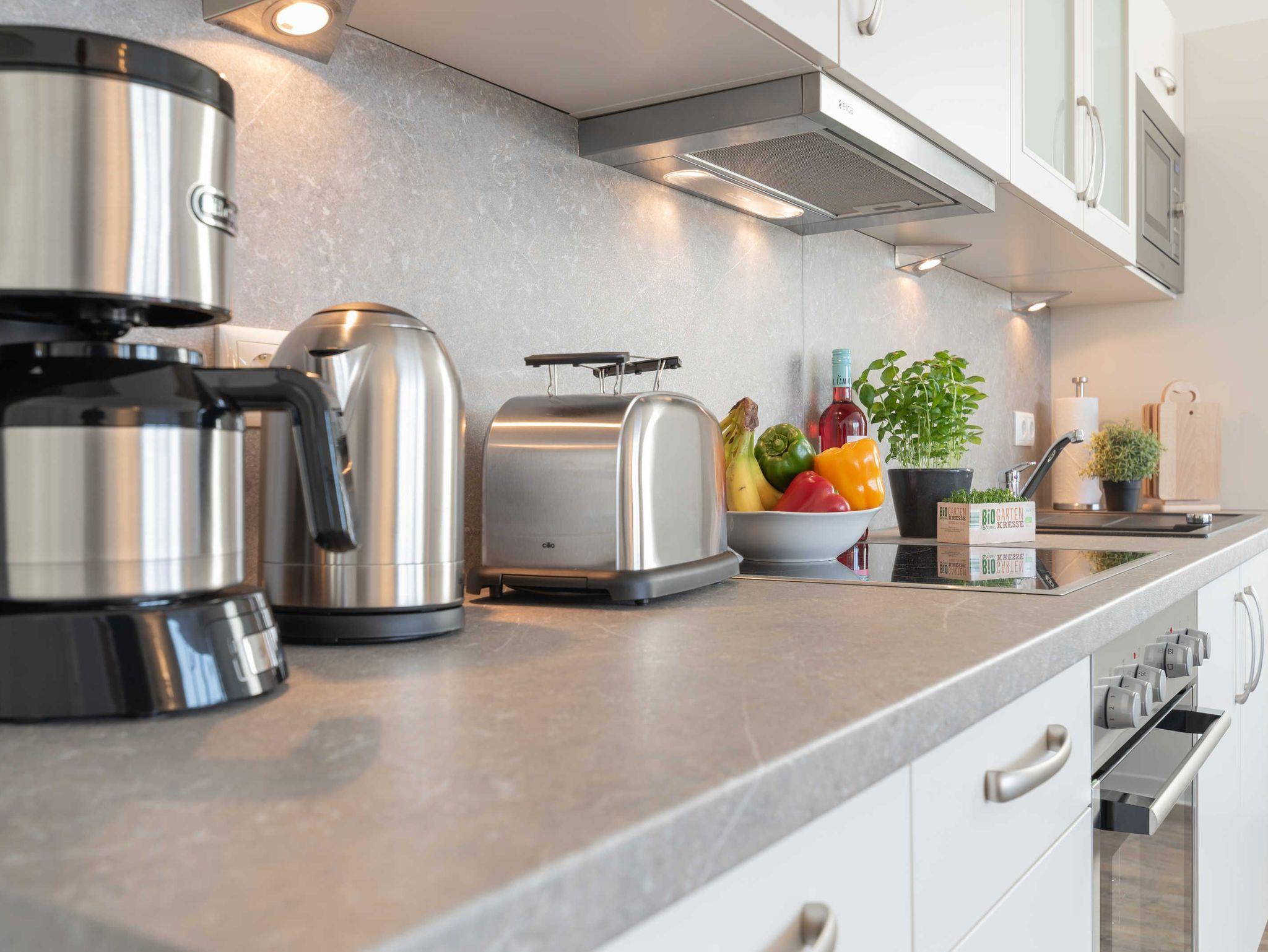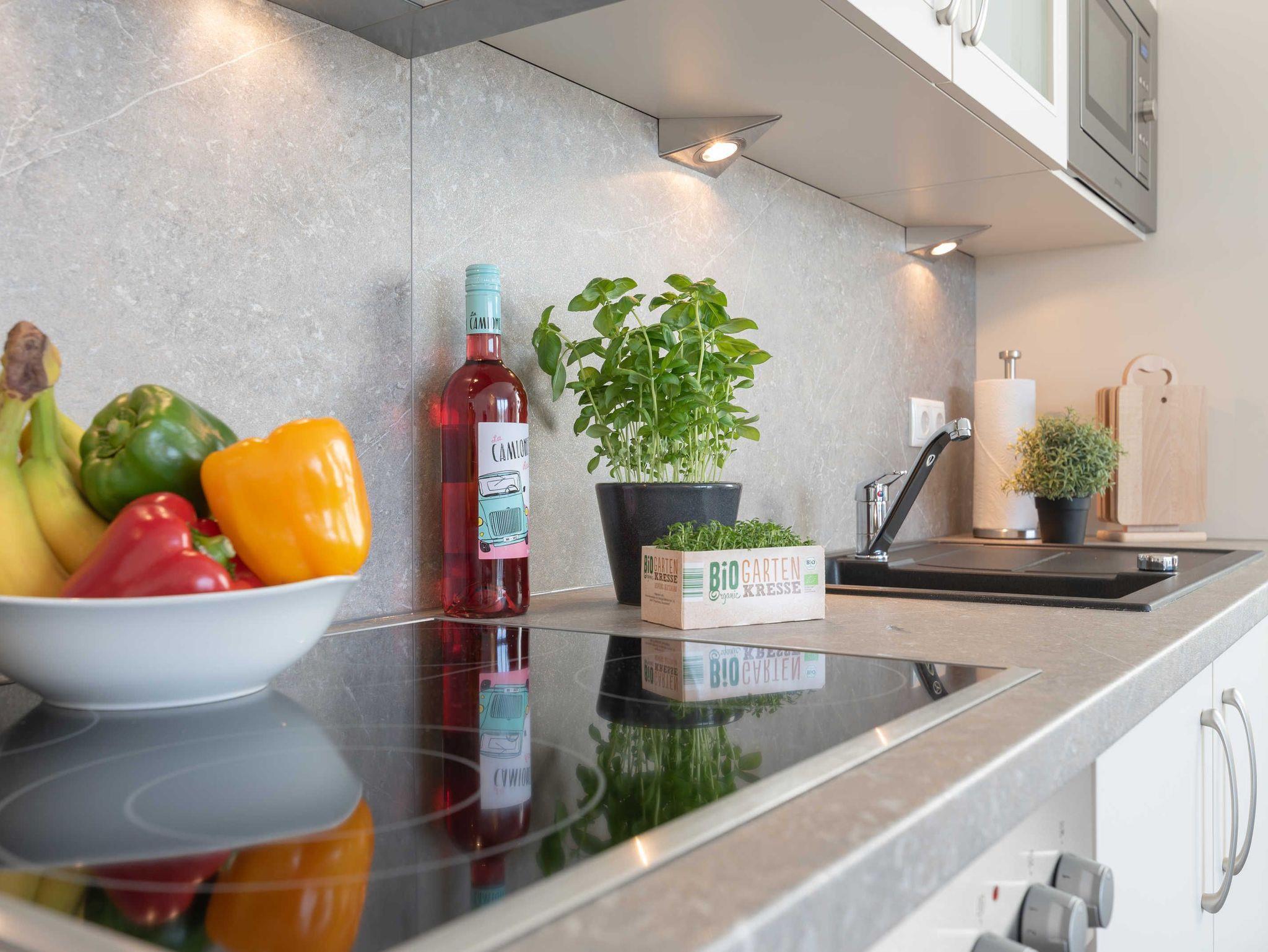 Im integrierten Abstellraum der Freienwohnung befindet sich eine Waschmaschine, um längere Aufenthalte angenehm zu gestalten. Wäscheset, Kinderreisebett und Kinderhochstuhl können kostenpflichtig zugebucht werden.