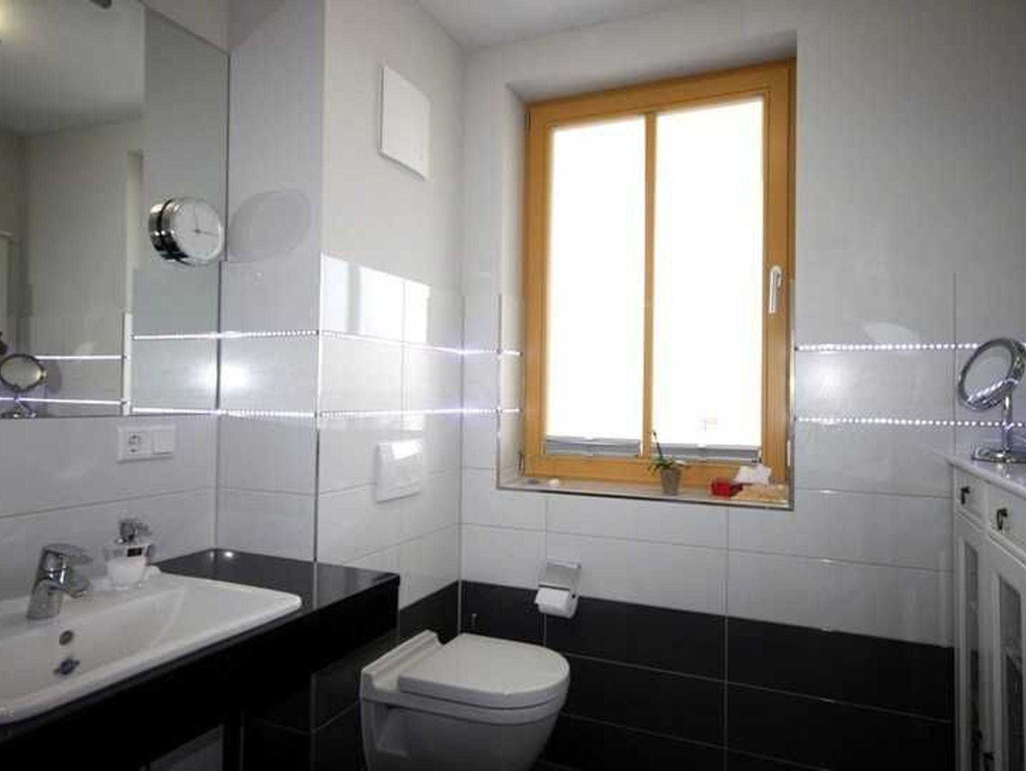 Das großzügige moderne Badezimmer mit Fenster verfügt über eine bodengleiche Dusche, Fön, beleuchteten Kosmetikspiegel und Badhocker. Die besonders gestalteten Fliesenwände mit LED-Licht machen aus dem Bad eine Wohlfühloase.