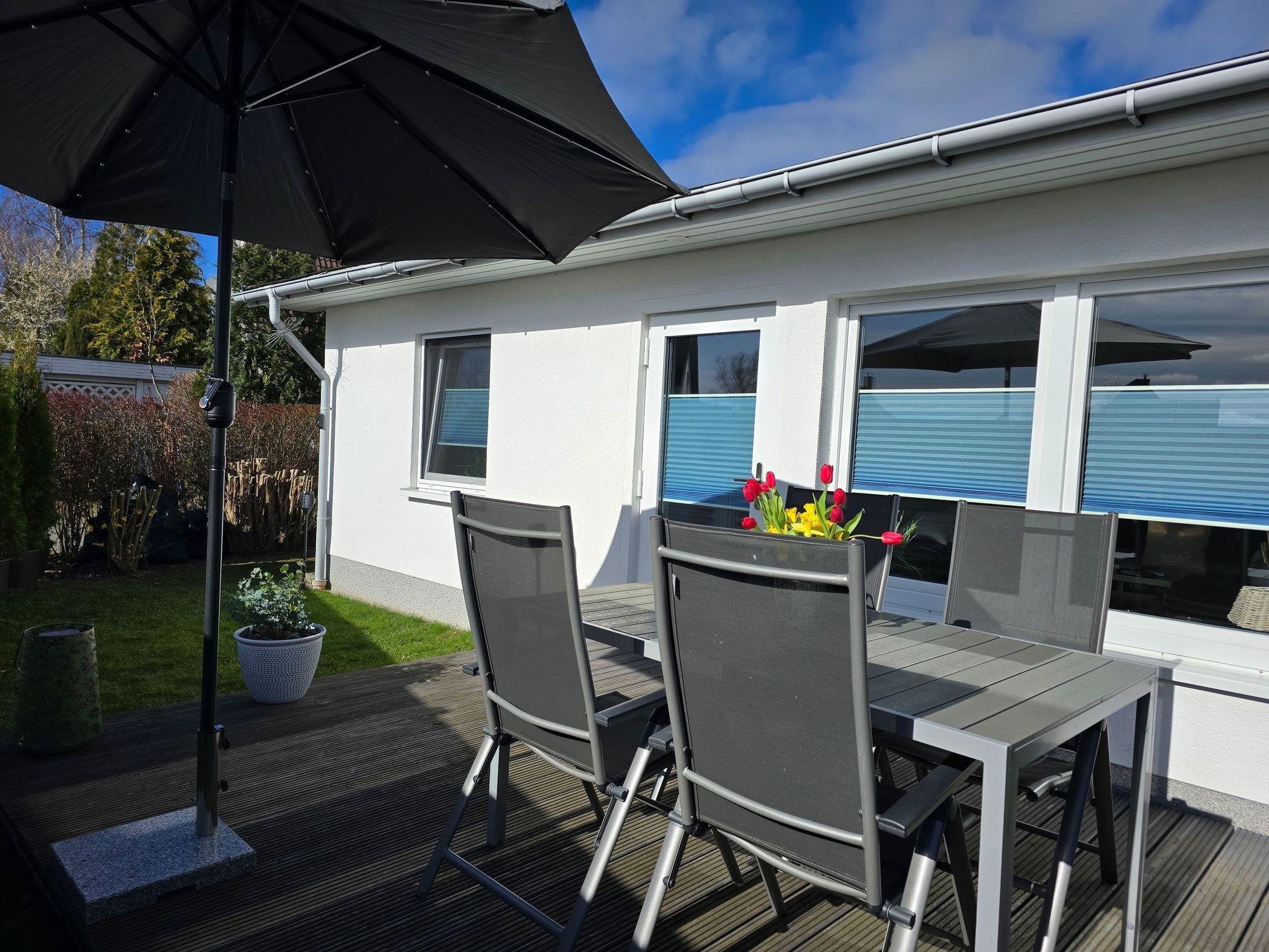 Im Hauswirtschaftsraum finden Sie weitere Annehmlichkeiten, darunter ein Sonnenschirm mit Solarlicht, Strandzubehör, ein Bollerwagen mit Zahlenschloss, eine Kühltasche und Kühlakkus sowie einen Strandschirm. Ein Luftbett kann als Zusatzbett aufgestellt werden. Weitere Highlights sind ein Fahrradständer und eine Wäschespinne im Außenbereich. Ein kostenfreier Parkplatz befindet sich direkt an der Unterkunft.