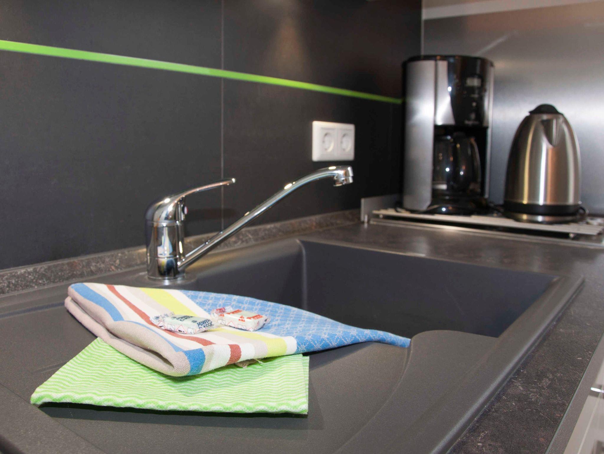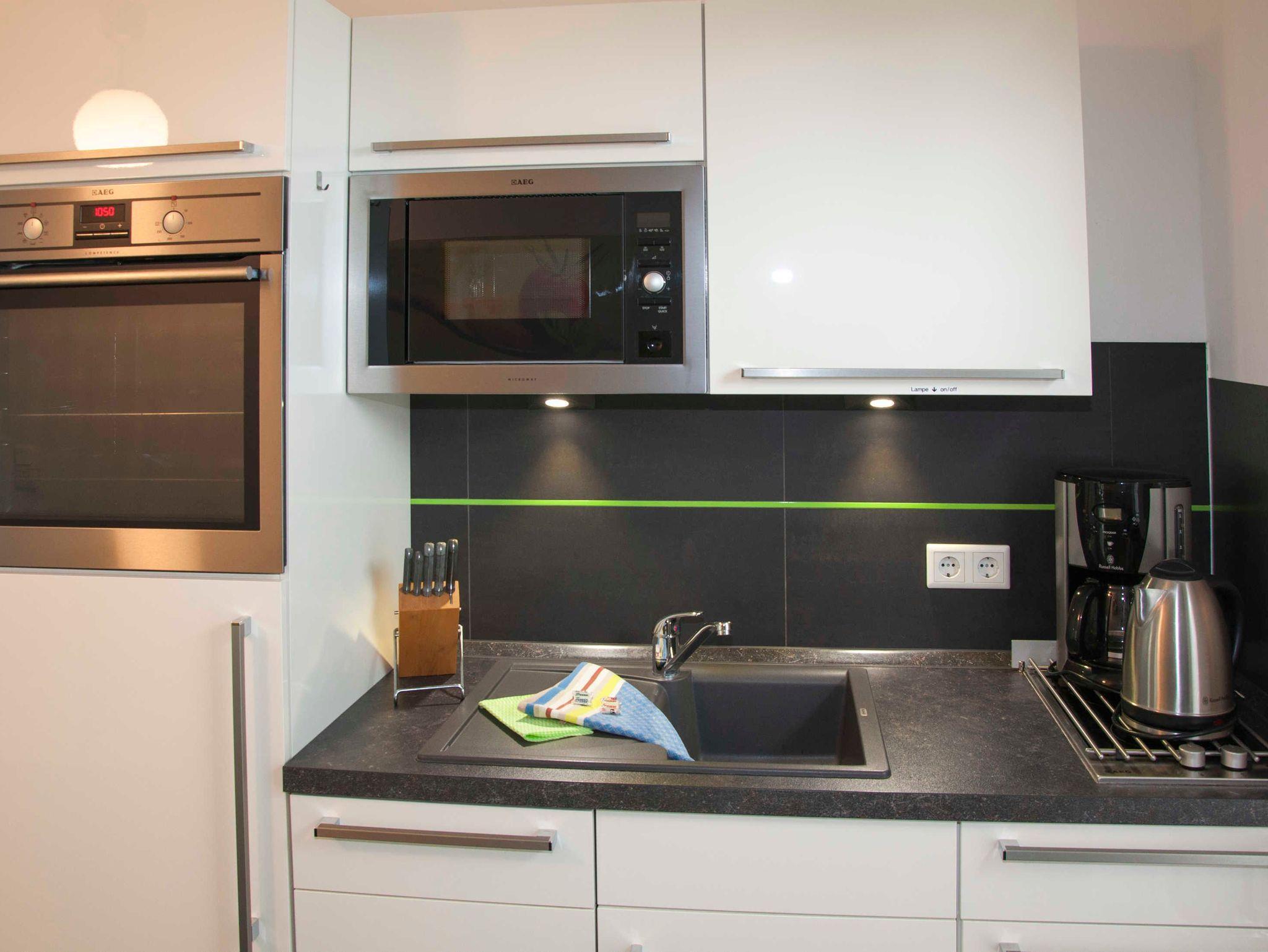 Das Wohnzimmer empfängt Sie mit einer gemütlichen Chillout Lounge inklusive einem LED-TV, einer Playstation (PS3) und einer Stereoanlage. Auf der Schlafcouch finden bequem zwei Personen Platz. Im Schlafzimmer sorgt ein komfortables Doppelbett für süße Träume. In der kompletten Wohnung ist eine Fußbodenheizung installiert und von jedem Zimmer aus gelangen Sie nach draußen auf die Terrasse. In der offenen Küche befindet sich eine komplett eingerichtete Einbauküche mit Backofen, Ceranfeld, Kühlschrank inklusive Gefrierfach, Geschirrspüler, Mikrowelle, Wasserkocher, Kaffeemaschine und Toaster. Das Bad mit Tageslicht bietet Ihnen eine Dusche, einen Föhn, einen Waschtisch mit großem Spiegel, einen separaten Kosmetikspiegel sowie mehrere Abstellmöglichkeiten.