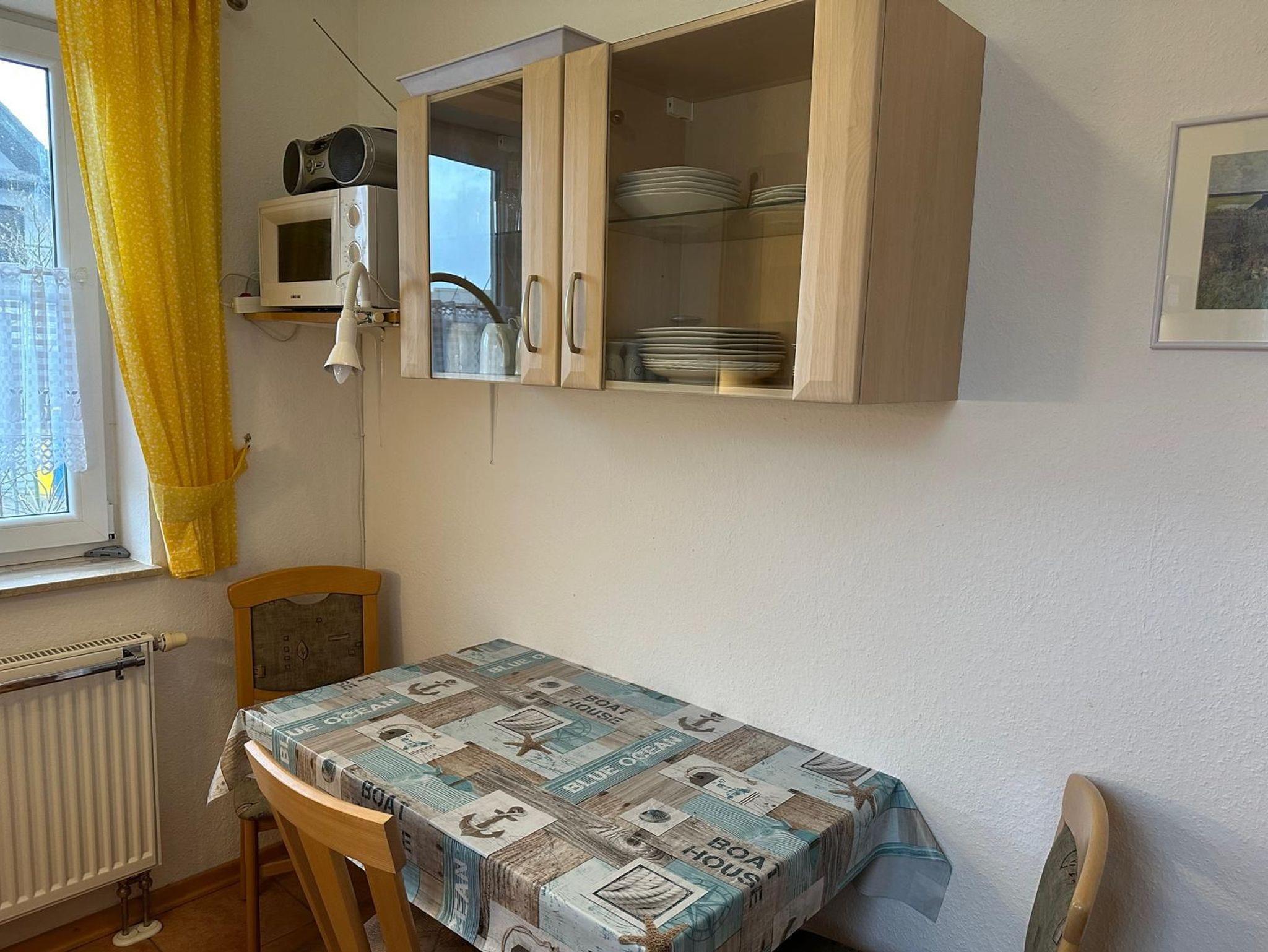 Die separate Küche ist hell und modern eingerichtet. Sie verfügt über ein Fenster, eine Küchenzeile, einen Kühlschrank mit Gefrierfach, einen Herd mit Cerankochfeld und Ablufthaube, einen Heißluftbackofen, eine Kaffeemaschine, eine Mikrowelle, einen Geschirrspüler und einen Esstisch. Geschirr, Töpfe, Pfannen und weitere Küchenutensilien sind selbstverständlich vorhanden.
