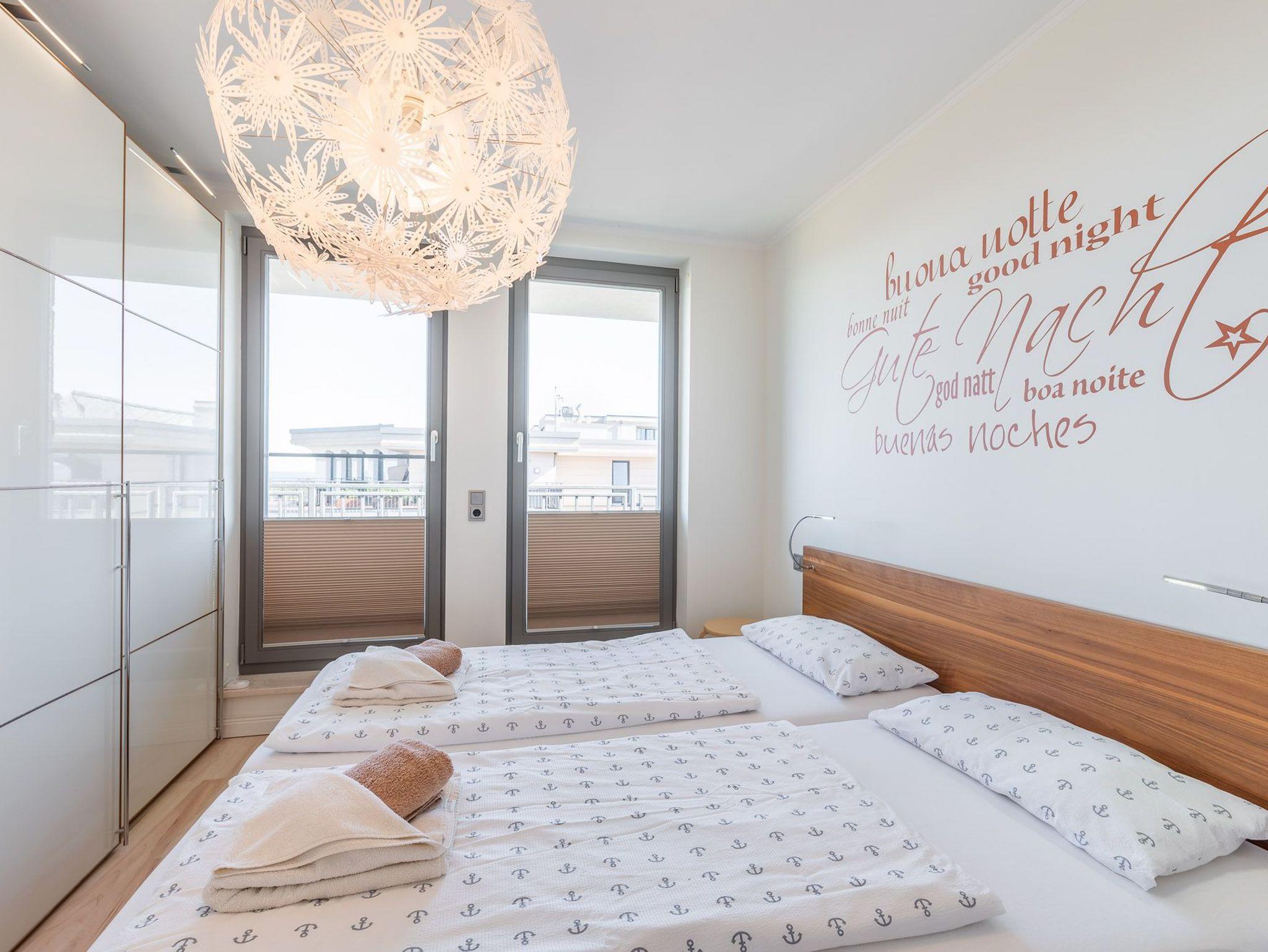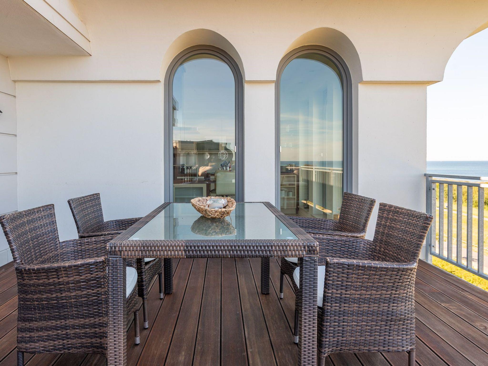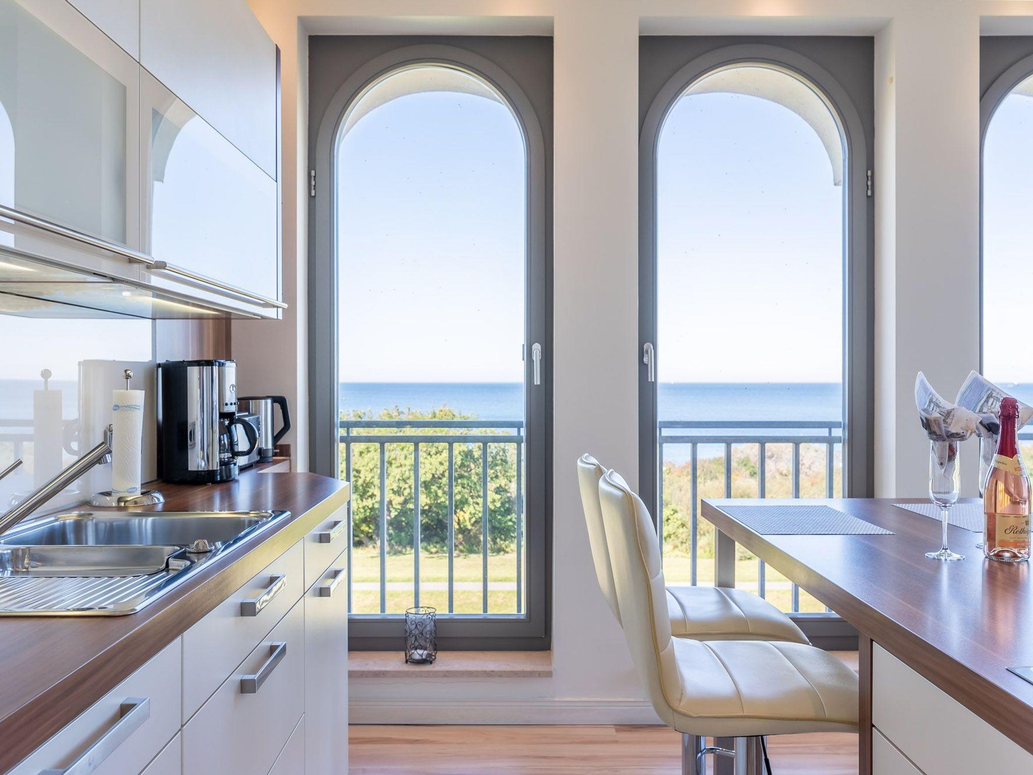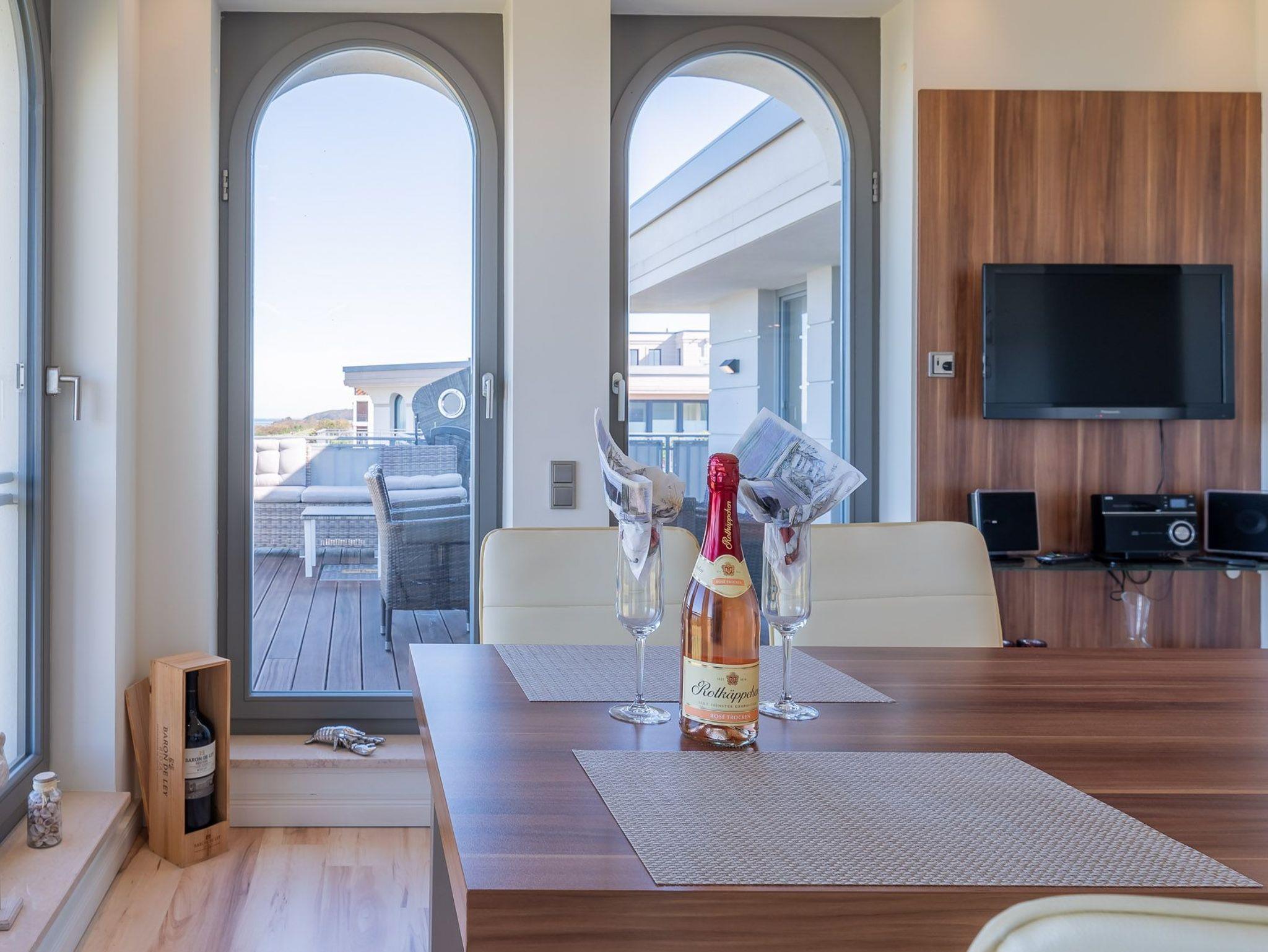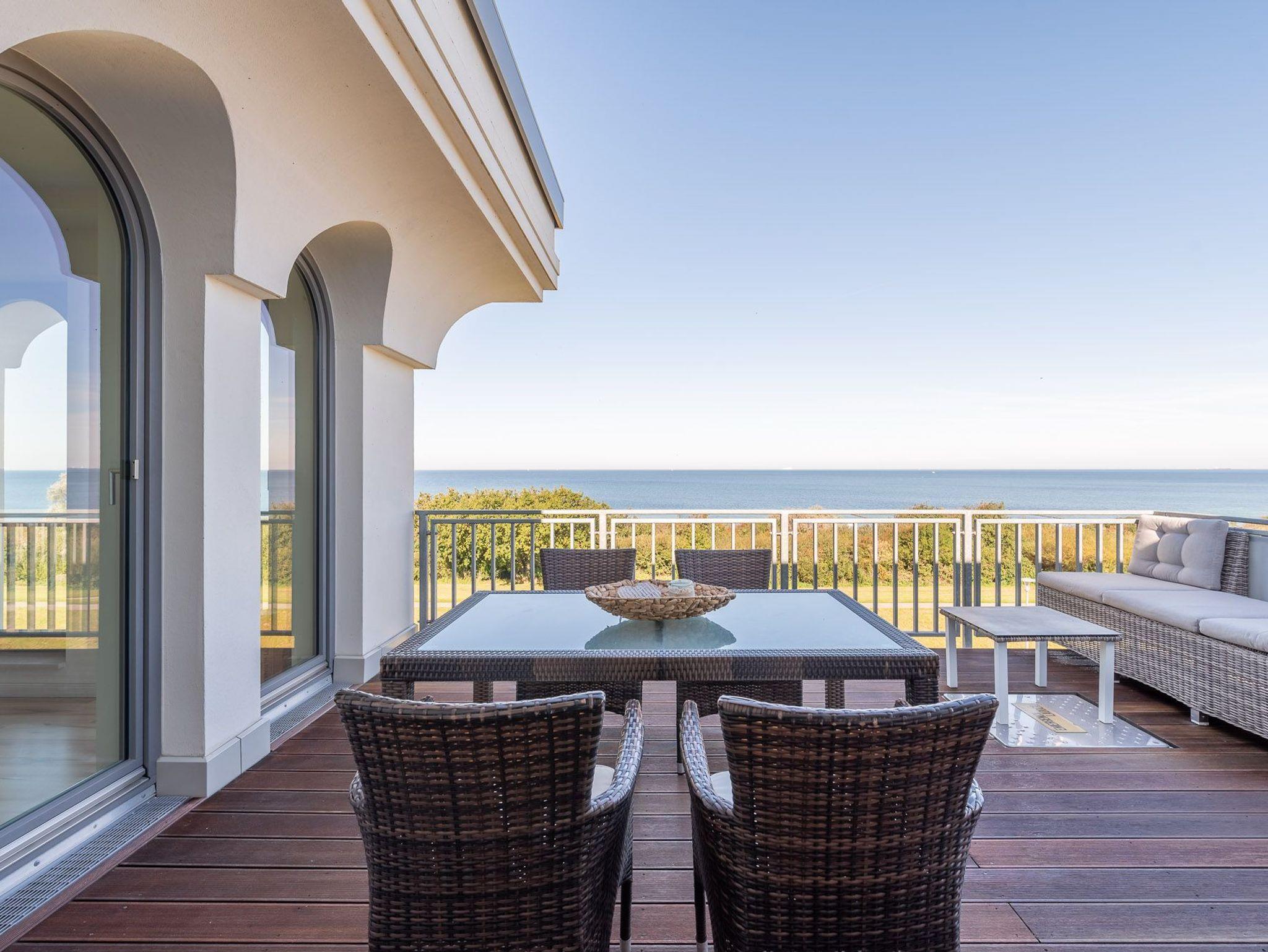 Über eine kleine Diele gelangen Sie in den luxuriösen Wohnbereich der Ferienwohnung. Diese verspricht entspannte Stunden. Sie ist ausgestattet mit einem TV- Gerät, einem Radio und einer großzügigen Sitzlandschaft. Angrenzend befindet sich die offene Einbauküche mit integriertem Essbereich und stilvollen Hochstühlen. Auch hier befindet sich ein TV-Gerät für rundum beste Unterhaltung. Die Küchenzeile ist voll ausgestattet mit Geschirrspüler, Kühlschrank, inklusive Gefrierfach, Kaffeemaschine, ?Nespresso Maschine?, Wasserkocher, Toaster sowie Einbau-Mikrowelle. Das separate Schlafzimmer empfängt Sie mit einem herrlichen Doppelbett (getrennte Matratzen) und einer raumhohen Schrankwand, die viel Stauraum für Ihr Gepäck bereithält. Das mit Tageslicht geflutete Badezimmer besticht mit einem Dachfenster sowie einer ebenerdigen Dusche. Über den Wohnbereich gelangen Sie auf die herrliche möblierte Dachterrasse (Balkon) in Nord-Ost-Ausrichtung mit eigenem Strandkorb. Diese lädt zum gemeinsamen Aufenthalt an der frischen Seeluft mit fantastischem Meerblick ein. Highlight der hellen Wohnung sind die geschwungenen bodentiefen Fenster im Wohn- und Essbereich. In alle Räume der Unterkunft wurde eine Fußbodenheizung eingebaut. Außerdem besitzt die Wohnung einen kostenfreien Tiefgaragenstellplatz und eine Abstellmöglichkeit für Fahrräder. Bitte beachten Sie die Durchfahrtshöhe von max. 1,90 m der Tiefgarage. Mit einem Personenaufzug gelangen Sie von der Tiefgarage aus direkt zu Ihrer Wohnung. Im Erdgeschoss der Wohnung befindet sich ein gekennzeichneter Abstellbereich für Kinderwagen. Hier noch einige Hinweise: Es handelt sich um eine Nichtraucherwohnung. Es sind keine Haustiere erlaubt. Die Kosten der Bettwäsche und Handtücher (einmaliges Starterset) sind inklusive. Eine Waschmaschine und ein Trockner stehen im separaten Hauswirtschaftsraum im Untergeschoss der Villa zu Ihrer Verfügung (gegen Gebühr / 1,00 Euro Münzen). Das kostenfreie WLAN in der Unterkunft ist ausschließlich für die Verwendung von Social Media und den Austausch von Bildern mit Familie und Freunden gedacht. Die Nutzung zum Streamen von Filmen ist nicht vorgesehen. Buchungen in der Neben- und Zwischensaison sind ab 4 Übernachtungen möglich. In der Hauptsaison gilt eine Übernachtungsdauer von mindestens 7 Nächten. Sichern Sie sich einen der begehrten Strandkörbe nur ein paar Meter entfernt von den rauschenden Wellen der Ostsee (Anfang Mai - Ende August) und buchen Sie jetzt zu besonderen Konditionen (12,00 Euro pro Tag oder 75,00 Euro pro Woche).