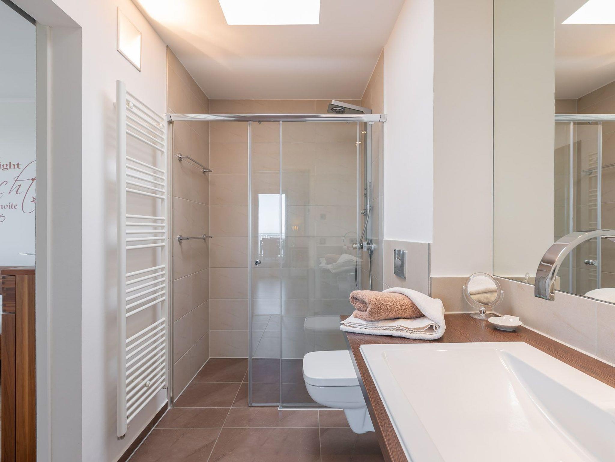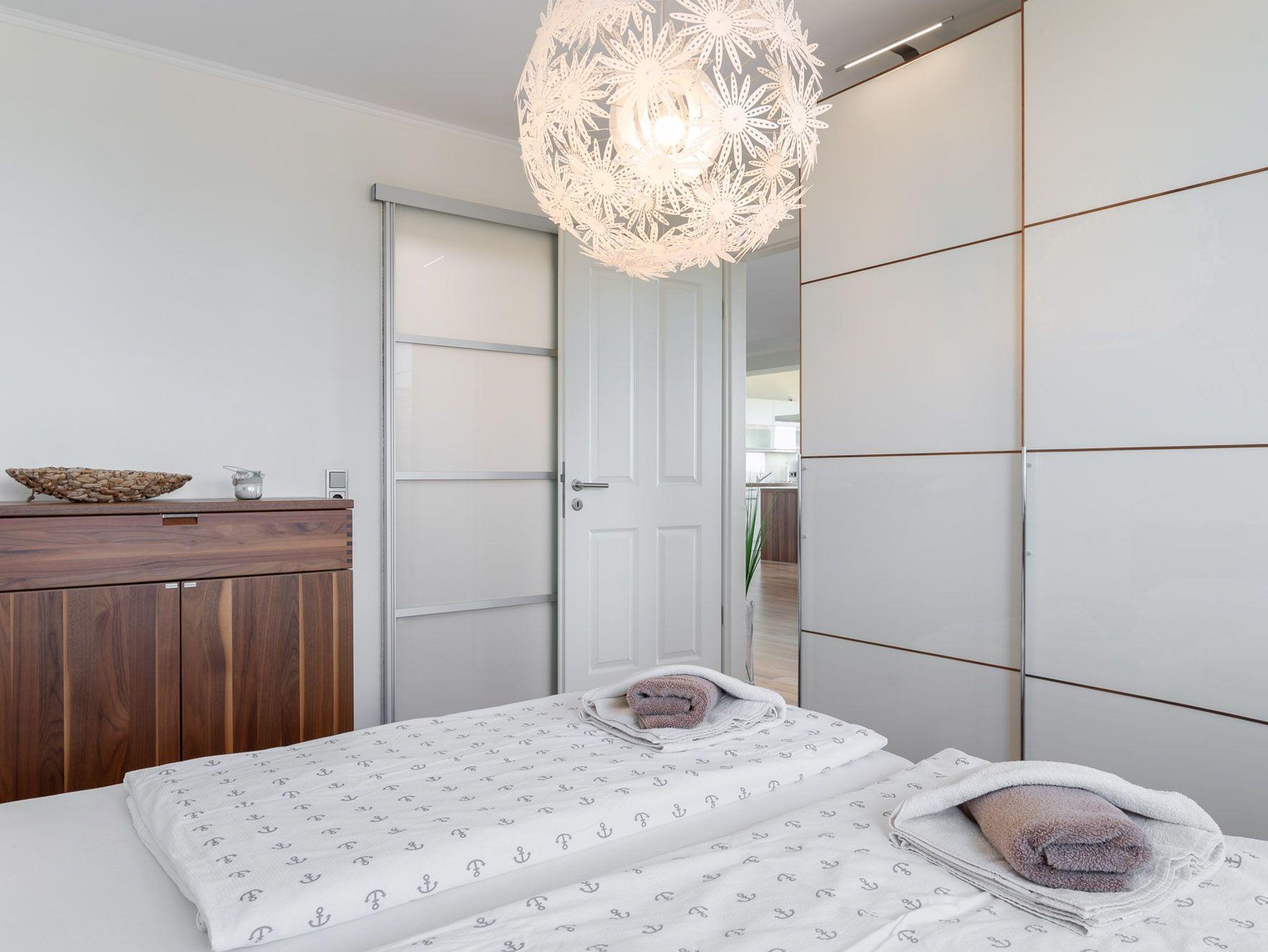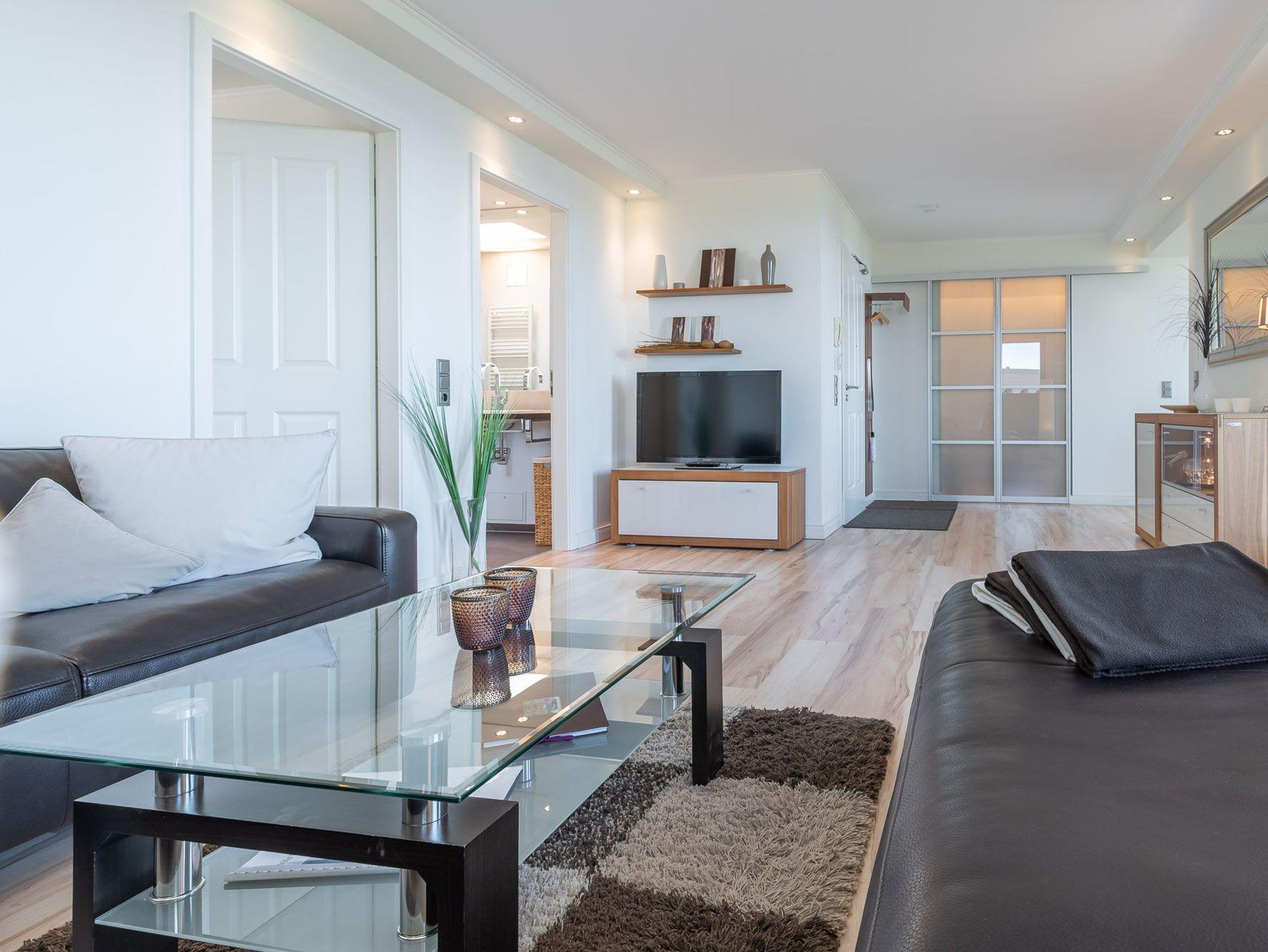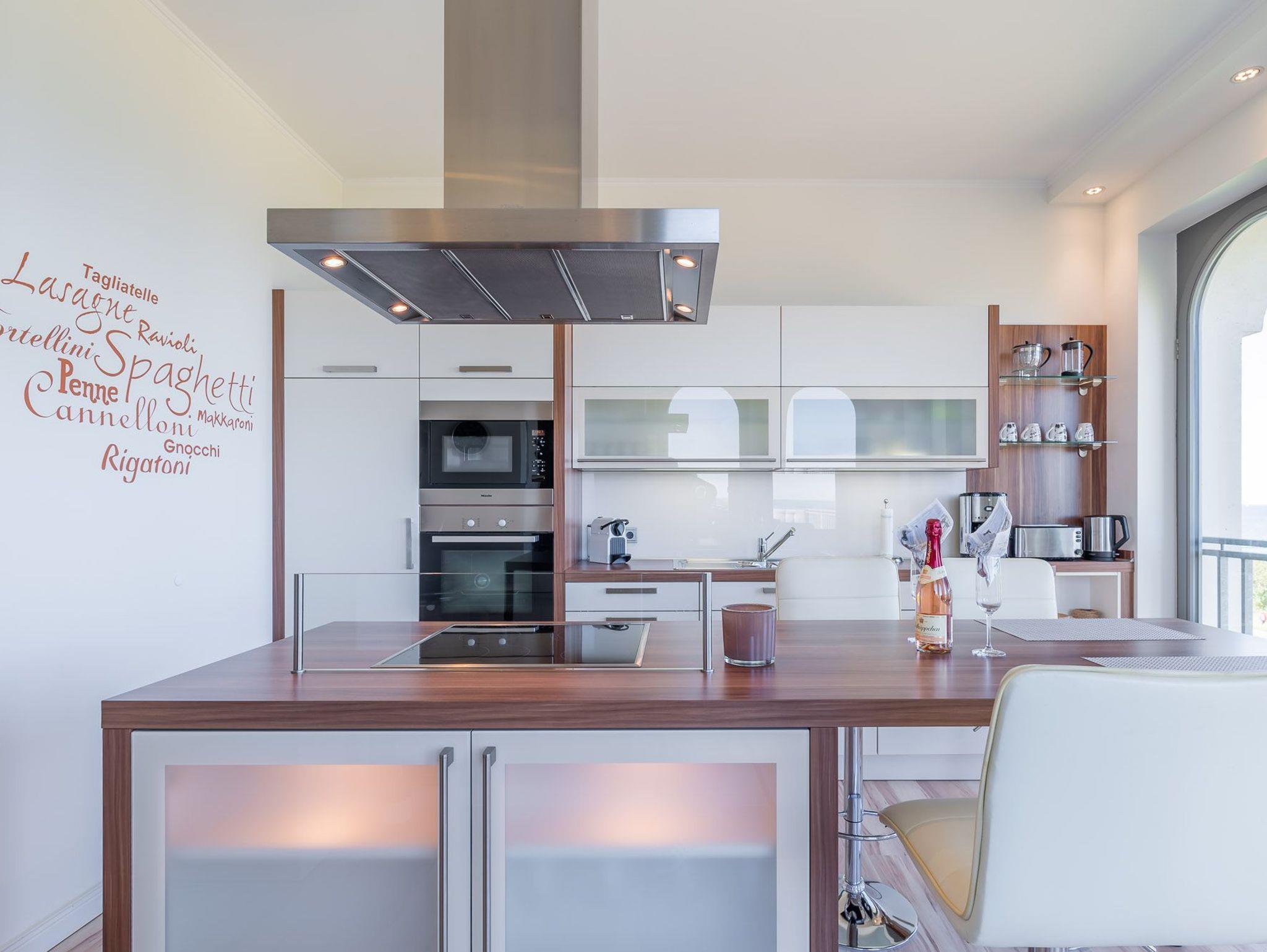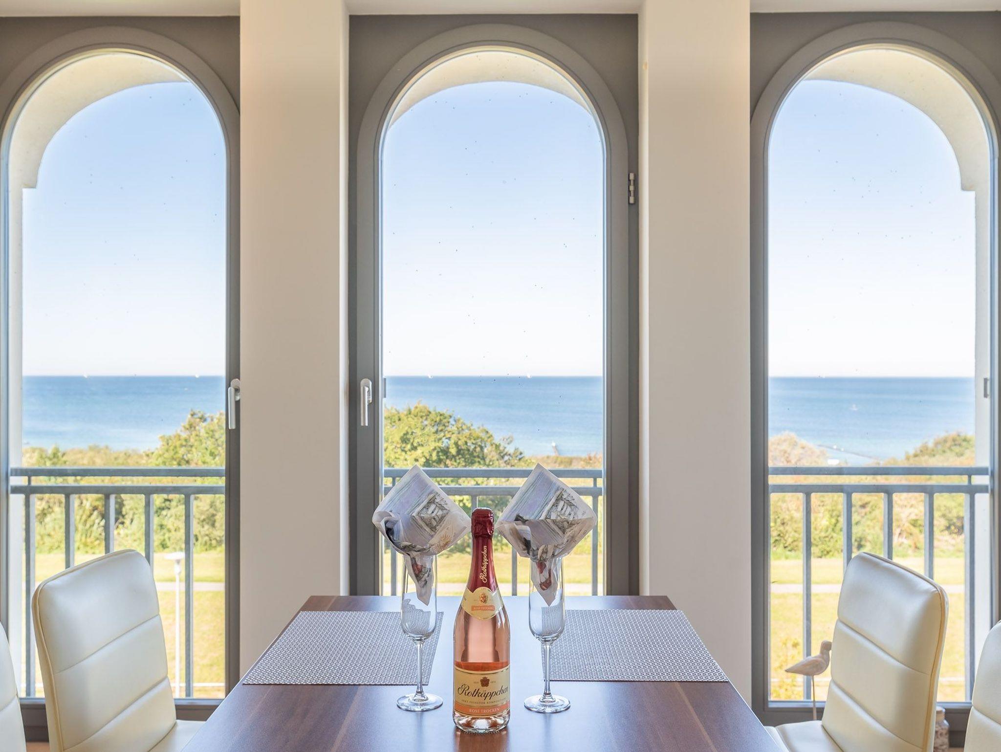 Über eine kleine Diele gelangen Sie in den luxuriösen Wohnbereich der Ferienwohnung. Diese verspricht entspannte Stunden. Sie ist ausgestattet mit einem TV- Gerät, einem Radio und einer großzügigen Sitzlandschaft. Angrenzend befindet sich die offene Einbauküche mit integriertem Essbereich und stilvollen Hochstühlen. Auch hier befindet sich ein TV-Gerät für rundum beste Unterhaltung. Die Küchenzeile ist voll ausgestattet mit Geschirrspüler, Kühlschrank, inklusive Gefrierfach, Kaffeemaschine, ?Nespresso Maschine?, Wasserkocher, Toaster sowie Einbau-Mikrowelle. Das separate Schlafzimmer empfängt Sie mit einem herrlichen Doppelbett (getrennte Matratzen) und einer raumhohen Schrankwand, die viel Stauraum für Ihr Gepäck bereithält. Das mit Tageslicht geflutete Badezimmer besticht mit einem Dachfenster sowie einer ebenerdigen Dusche. Über den Wohnbereich gelangen Sie auf die herrliche möblierte Dachterrasse (Balkon) in Nord-Ost-Ausrichtung mit eigenem Strandkorb. Diese lädt zum gemeinsamen Aufenthalt an der frischen Seeluft mit fantastischem Meerblick ein. Highlight der hellen Wohnung sind die geschwungenen bodentiefen Fenster im Wohn- und Essbereich. In alle Räume der Unterkunft wurde eine Fußbodenheizung eingebaut. Außerdem besitzt die Wohnung einen kostenfreien Tiefgaragenstellplatz und eine Abstellmöglichkeit für Fahrräder. Bitte beachten Sie die Durchfahrtshöhe von max. 1,90 m der Tiefgarage. Mit einem Personenaufzug gelangen Sie von der Tiefgarage aus direkt zu Ihrer Wohnung. Im Erdgeschoss der Wohnung befindet sich ein gekennzeichneter Abstellbereich für Kinderwagen. Hier noch einige Hinweise: Es handelt sich um eine Nichtraucherwohnung. Es sind keine Haustiere erlaubt. Die Kosten der Bettwäsche und Handtücher (einmaliges Starterset) sind inklusive. Eine Waschmaschine und ein Trockner stehen im separaten Hauswirtschaftsraum im Untergeschoss der Villa zu Ihrer Verfügung (gegen Gebühr / 1,00 Euro Münzen). Das kostenfreie WLAN in der Unterkunft ist ausschließlich für die Verwendung von Social Media und den Austausch von Bildern mit Familie und Freunden gedacht. Die Nutzung zum Streamen von Filmen ist nicht vorgesehen. Buchungen in der Neben- und Zwischensaison sind ab 4 Übernachtungen möglich. In der Hauptsaison gilt eine Übernachtungsdauer von mindestens 7 Nächten. Sichern Sie sich einen der begehrten Strandkörbe nur ein paar Meter entfernt von den rauschenden Wellen der Ostsee (Anfang Mai - Ende August) und buchen Sie jetzt zu besonderen Konditionen (12,00 Euro pro Tag oder 75,00 Euro pro Woche).