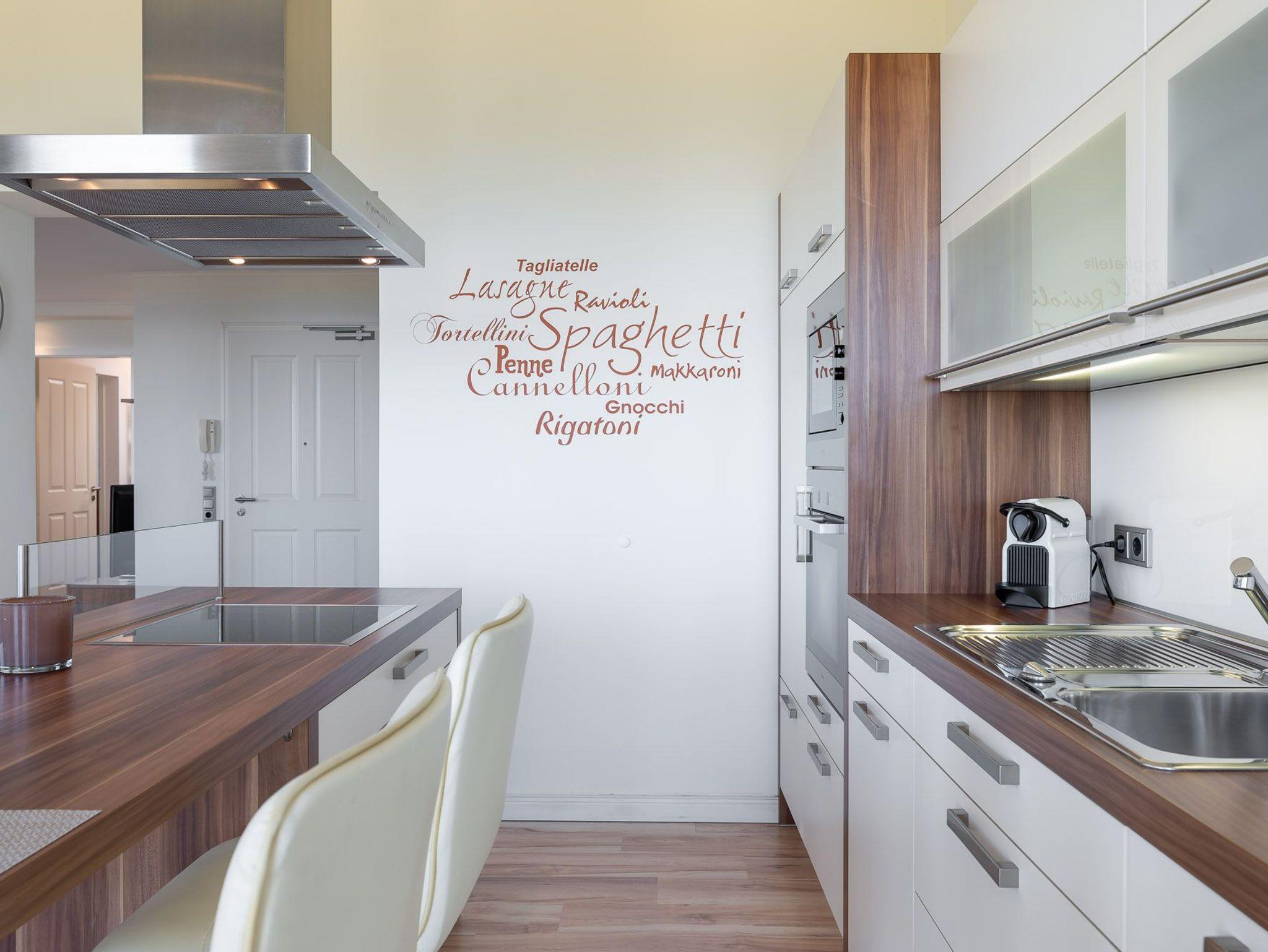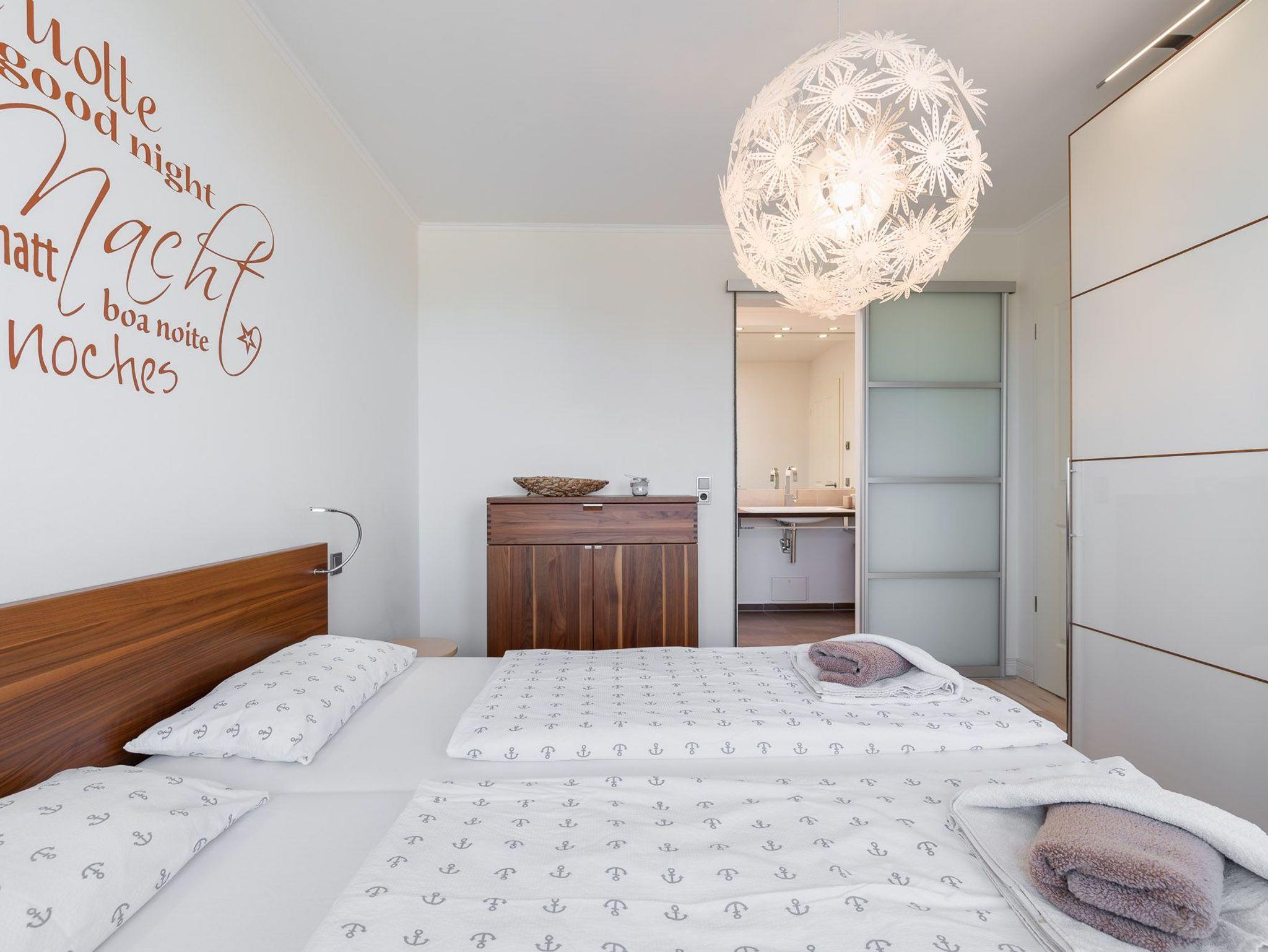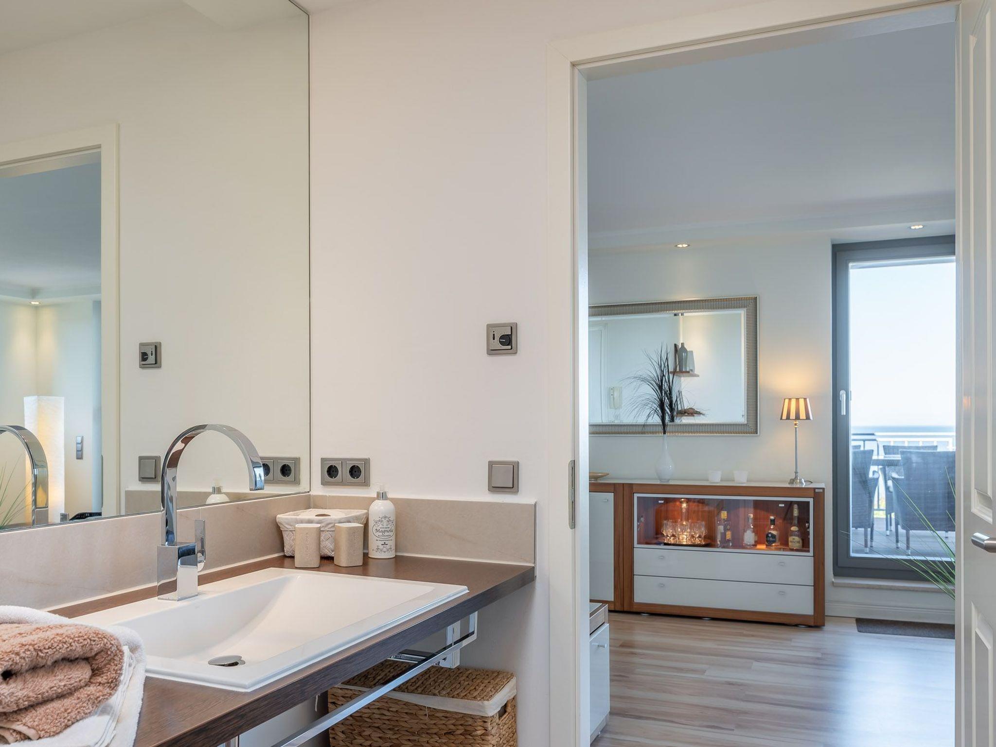 Über eine kleine Diele gelangen Sie in den luxuriösen Wohnbereich der Ferienwohnung. Diese verspricht entspannte Stunden. Sie ist ausgestattet mit einem TV- Gerät, einem Radio und einer großzügigen Sitzlandschaft. Angrenzend befindet sich die offene Einbauküche mit integriertem Essbereich und stilvollen Hochstühlen. Auch hier befindet sich ein TV-Gerät für rundum beste Unterhaltung. Die Küchenzeile ist voll ausgestattet mit Geschirrspüler, Kühlschrank, inklusive Gefrierfach, Kaffeemaschine, „Nespresso Maschine“, Wasserkocher, Toaster sowie Einbau-Mikrowelle. Das separate Schlafzimmer empfängt Sie mit einem herrlichen Doppelbett (getrennte Matratzen) und einer raumhohen Schrankwand, die viel Stauraum für Ihr Gepäck bereithält. Das mit Tageslicht geflutete Badezimmer besticht mit einem Dachfenster sowie einer ebenerdigen Dusche. Über den Wohnbereich gelangen Sie auf die herrliche möblierte Dachterrasse (Balkon) in Nord-Ost-Ausrichtung mit eigenem Strandkorb. Diese lädt zum gemeinsamen Aufenthalt an der frischen Seeluft mit fantastischem Meerblick ein. Highlight der hellen Wohnung sind die geschwungenen bodentiefen Fenster im Wohn- und Essbereich. In alle Räume der Unterkunft wurde eine Fußbodenheizung eingebaut. Außerdem besitzt die Wohnung einen kostenfreien Tiefgaragenstellplatz und eine Abstellmöglichkeit für Fahrräder. Bitte beachten Sie die Durchfahrtshöhe von max. 1,90 m der Tiefgarage. Mit einem Personenaufzug gelangen Sie von der Tiefgarage aus direkt zu Ihrer Wohnung. Im Erdgeschoss der Wohnung befindet sich ein gekennzeichneter Abstellbereich für Kinderwagen. Hier noch einige Hinweise: Es handelt sich um eine Nichtraucherwohnung. Es sind keine Haustiere erlaubt. Die Kosten der Bettwäsche und Handtücher (einmaliges Starterset) sind inklusive. Eine Waschmaschine und ein Trockner stehen im separaten Hauswirtschaftsraum im Untergeschoss der Villa zu Ihrer Verfügung (gegen Gebühr / 1,00 € Münzen). Das kostenfreie WLAN in der Unterkunft ist ausschließlich für die Verwendung von Social Media und den Austausch von Bildern mit Familie und Freunden gedacht. Die Nutzung zum Streamen von Filmen ist nicht vorgesehen. Buchungen in der Neben- und Zwischensaison sind ab 4 Übernachtungen möglich. In der Hauptsaison gilt eine Übernachtungsdauer von mindestens 7 Nächten. Sichern Sie sich einen der begehrten Strandkörbe nur ein paar Meter entfernt von den rauschenden Wellen der Ostsee (Anfang Mai - Ende August) und buchen Sie jetzt zu besonderen Konditionen (12,00 € pro Tag oder 75,00 € pro Woche).