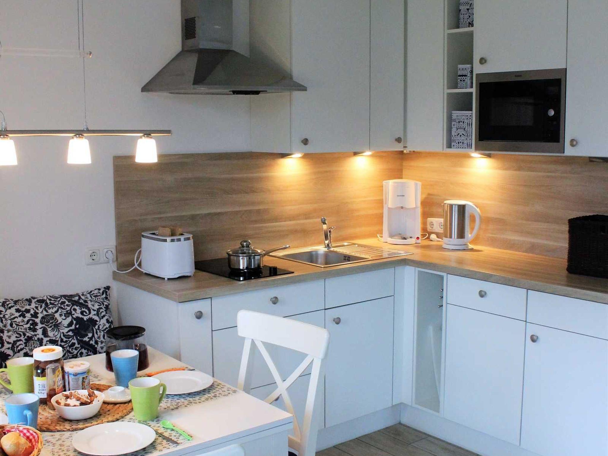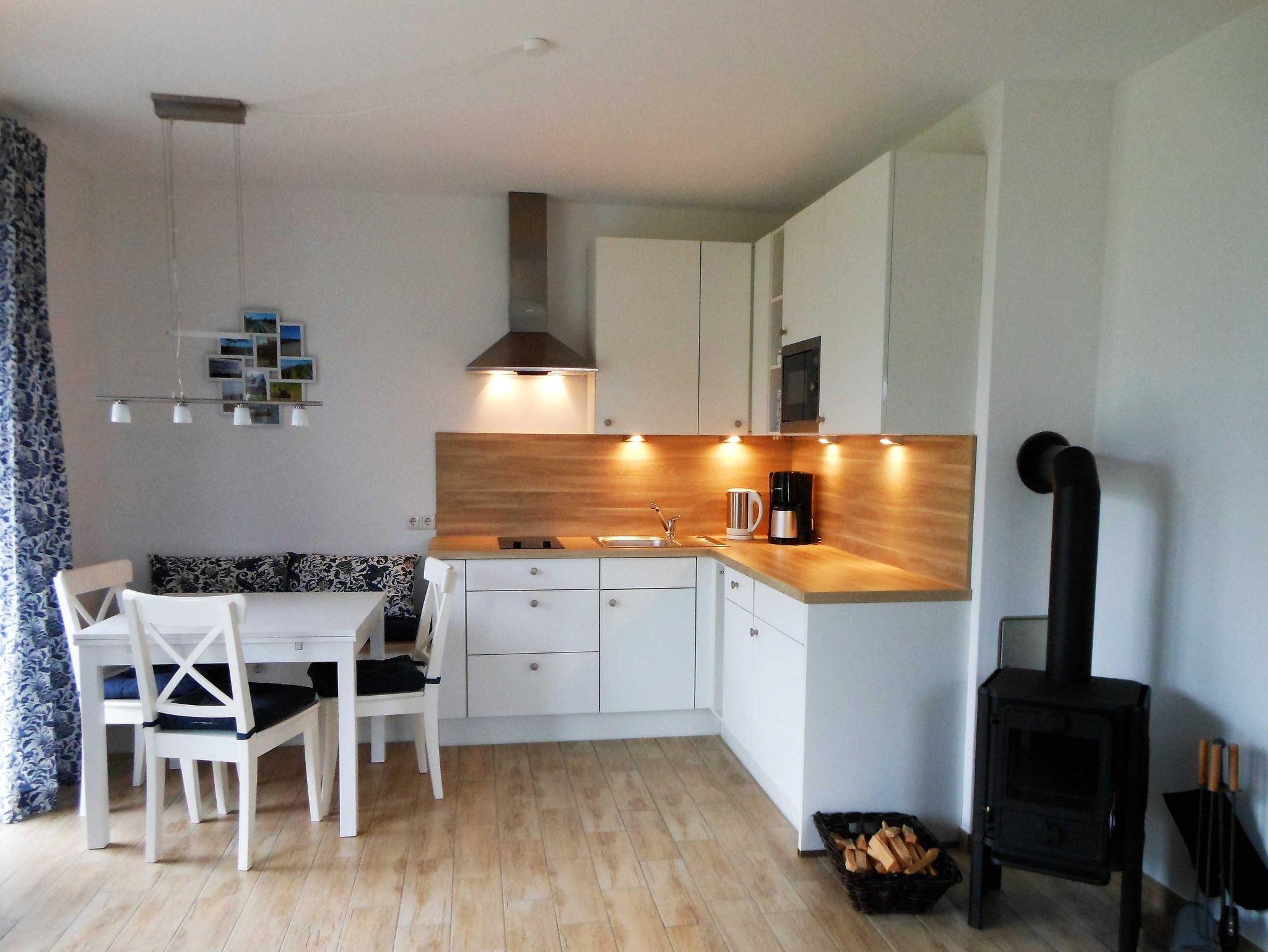 Die Ferienunterkunft verfügt über ein Schlafsofa im Wohnbereich (Liegefläche 140 x 200 cm) und zwei separate Schlafzimmer (Doppelbett 180 x 200cm und Ausziehbett mit zwei Matratzen 80 x 200 cm). Ein Wäscheset kann pro Person kostenpflichtig zugebucht werden. Für Kleinkinder sind ein Kinderreisebett und ein Kinderhochstuhl vorhanden. Die Wohnung ist komplett gefliest und mit einer Fußbodenheizung ausgestattet. Zusätzlich kann der Kaminofen im Wohnbereich für wohlige Wärme sorgen (Brennholz muss selbst organisiert werden). In den hellen Wohn-/Essbereich ist eine moderne Küche mit Kühl-/Gefrierkombi, Mikrowelle, Cerankochfeld, Spülmaschine, Kaffeemaschine, Wasserkocher und Toaster integriert. Zur technischen Ausstattung der Unterkunft gehören zudem ein Fernseher, ein CD-Player, ein DVD-Player und eine Stereoanlage. Das Bad ist mit einer ebenerdigen Dusche ausgestattet.