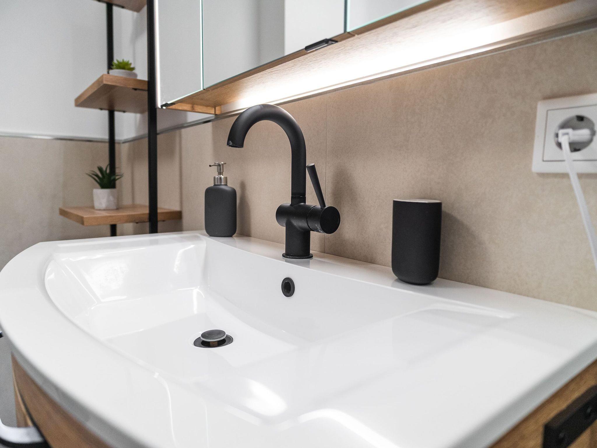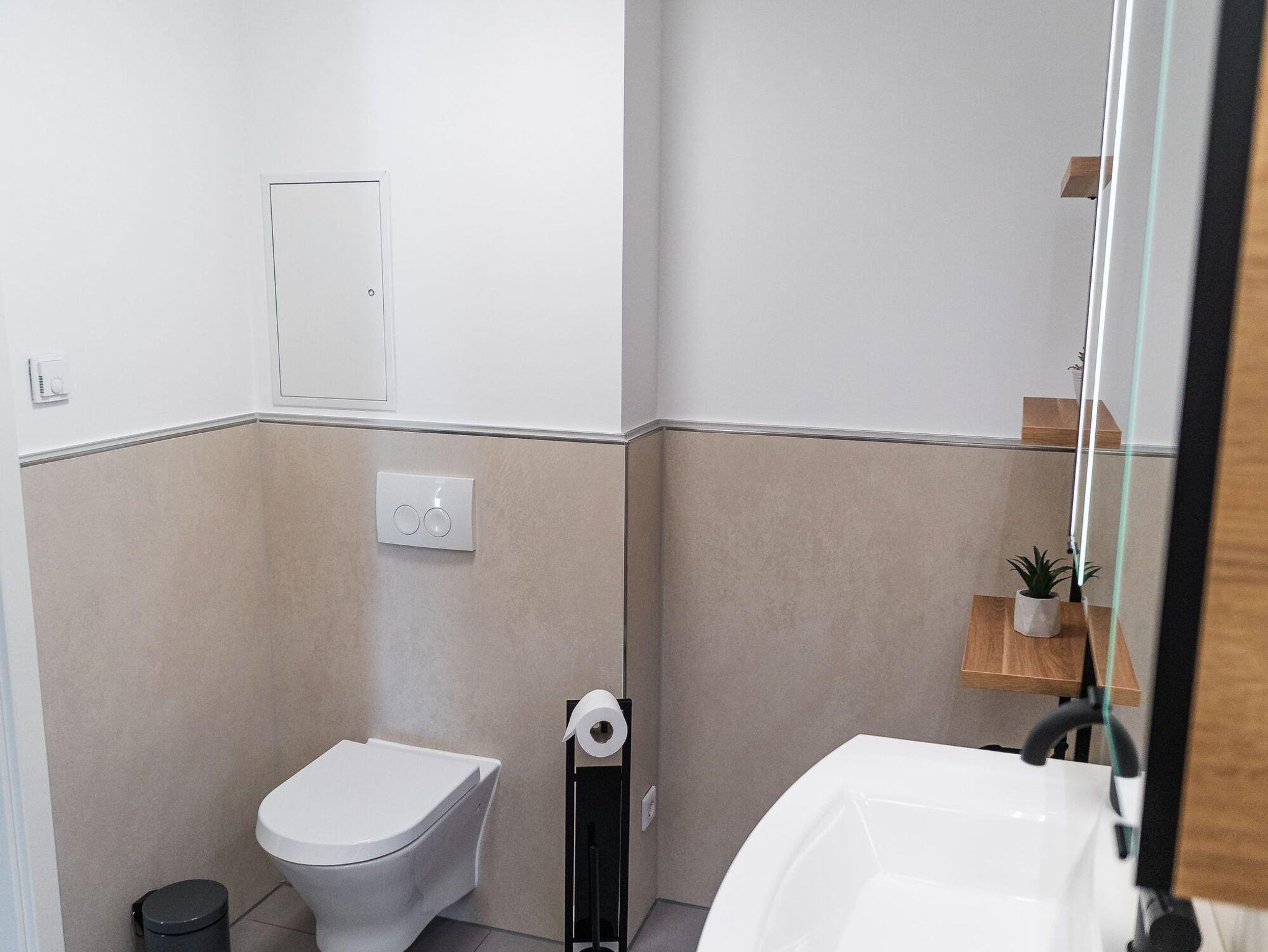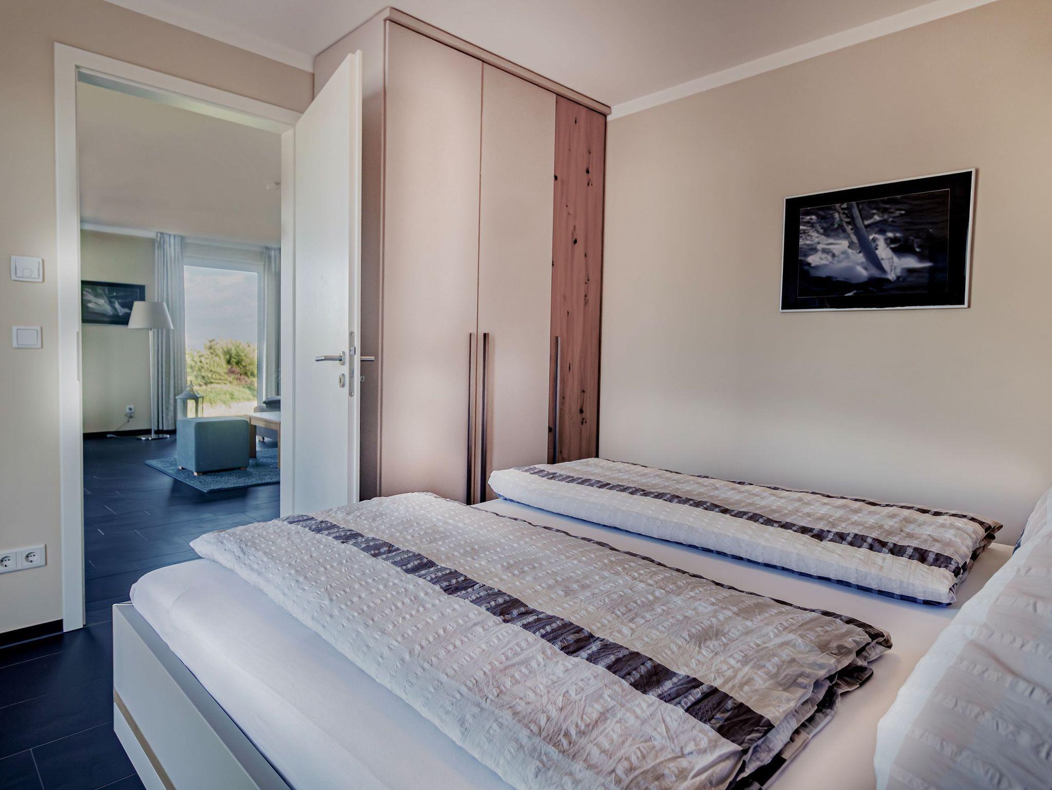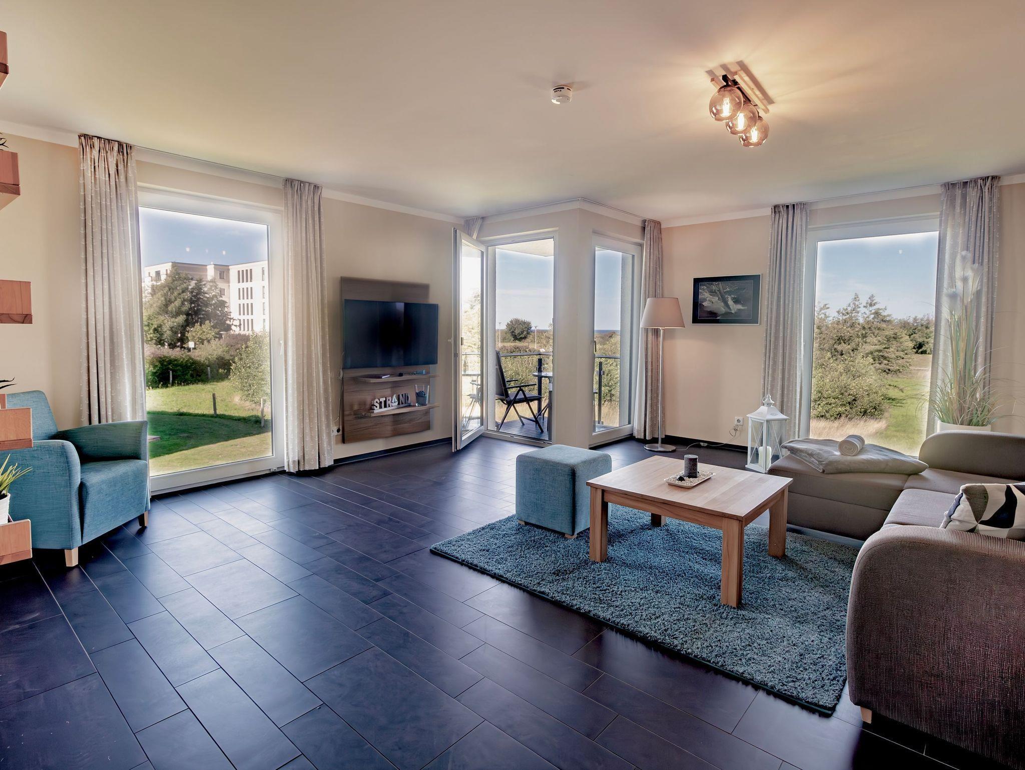 Im Flur befindet sich genügend Platz für die Ablage von Strandutensilien. Der gemütliche Couchbereich (ausziehbar 1,6 x 2,0 m) mit Fernseher im offenen Wohn- und Kochbereich lädt zu erholsamen Abenden und zum Träumen auf die Ostsee ein. Die anschließende Küche mit dem großzügigen Essbereich ist komfortabel ausgestattet für gemeinsame Kochabende. Geschirrspüler und verschiedenes Koch- und Esszubehör sind vorhanden. Das Wohnzimmer verfügt über einen kleinen Balkon mit Ostseeblick, auf dem man perfekt den Tag beim Beobachten des Sonnenunterganges ausklingen lassen kann. Das Schlafzimmer besitzt ein großes Bett (2,0 x 1,8 m / getrennte Matratzen) und einen Kleiderschrank. In dem modernen Badezimmer befinden sich eine ebene Dusche sowie ein großer Spiegel und ein Haartrockner.