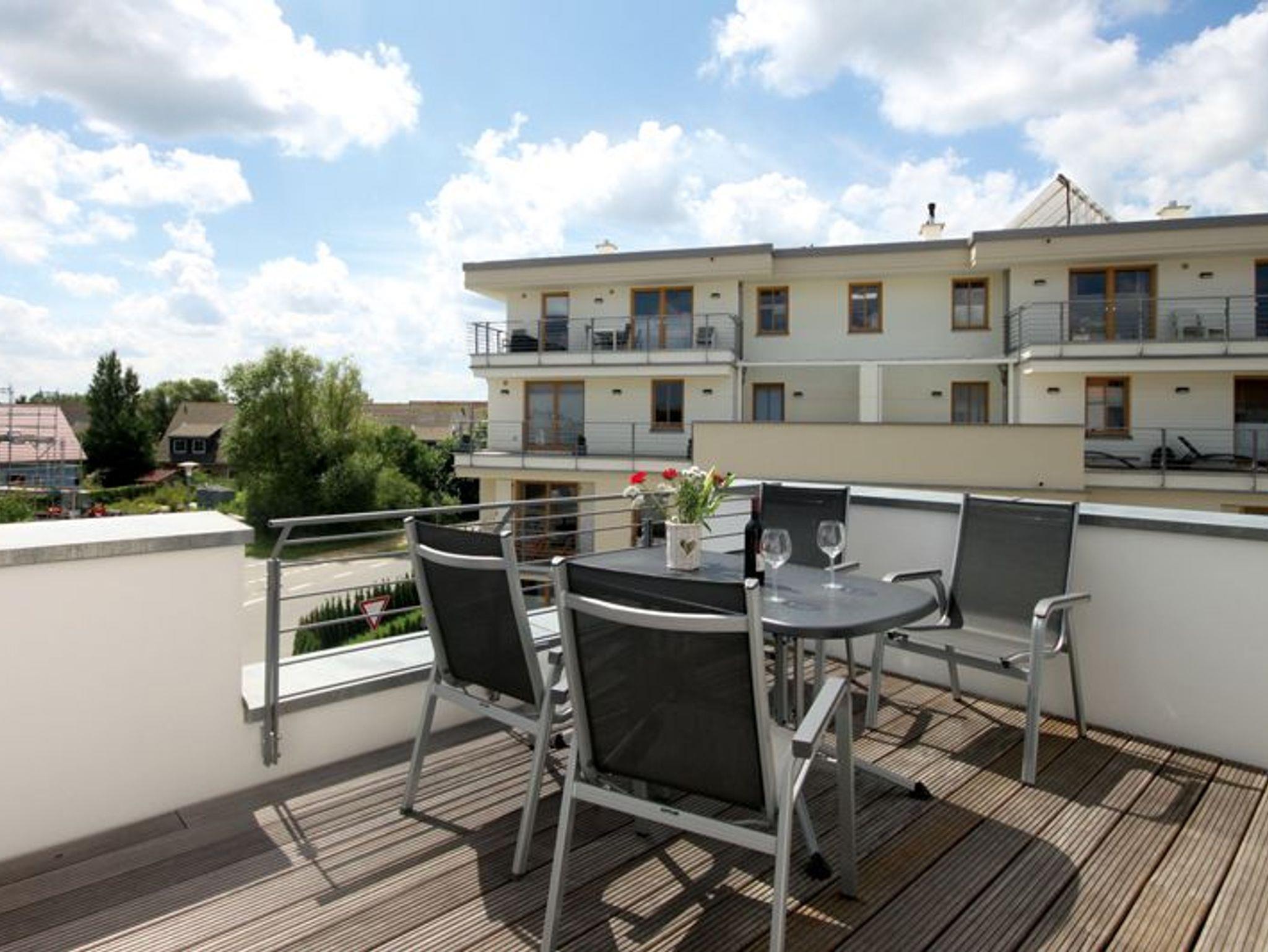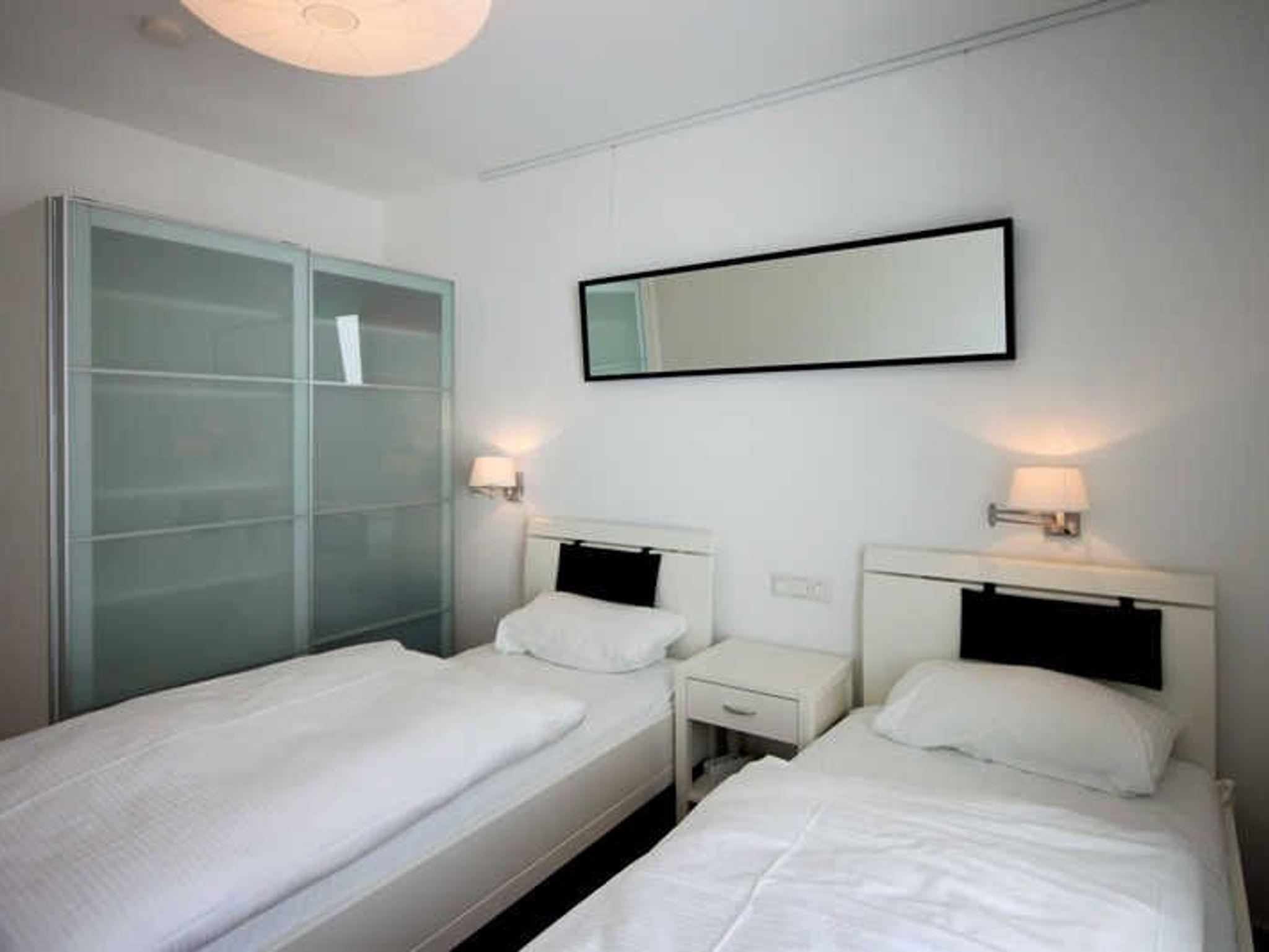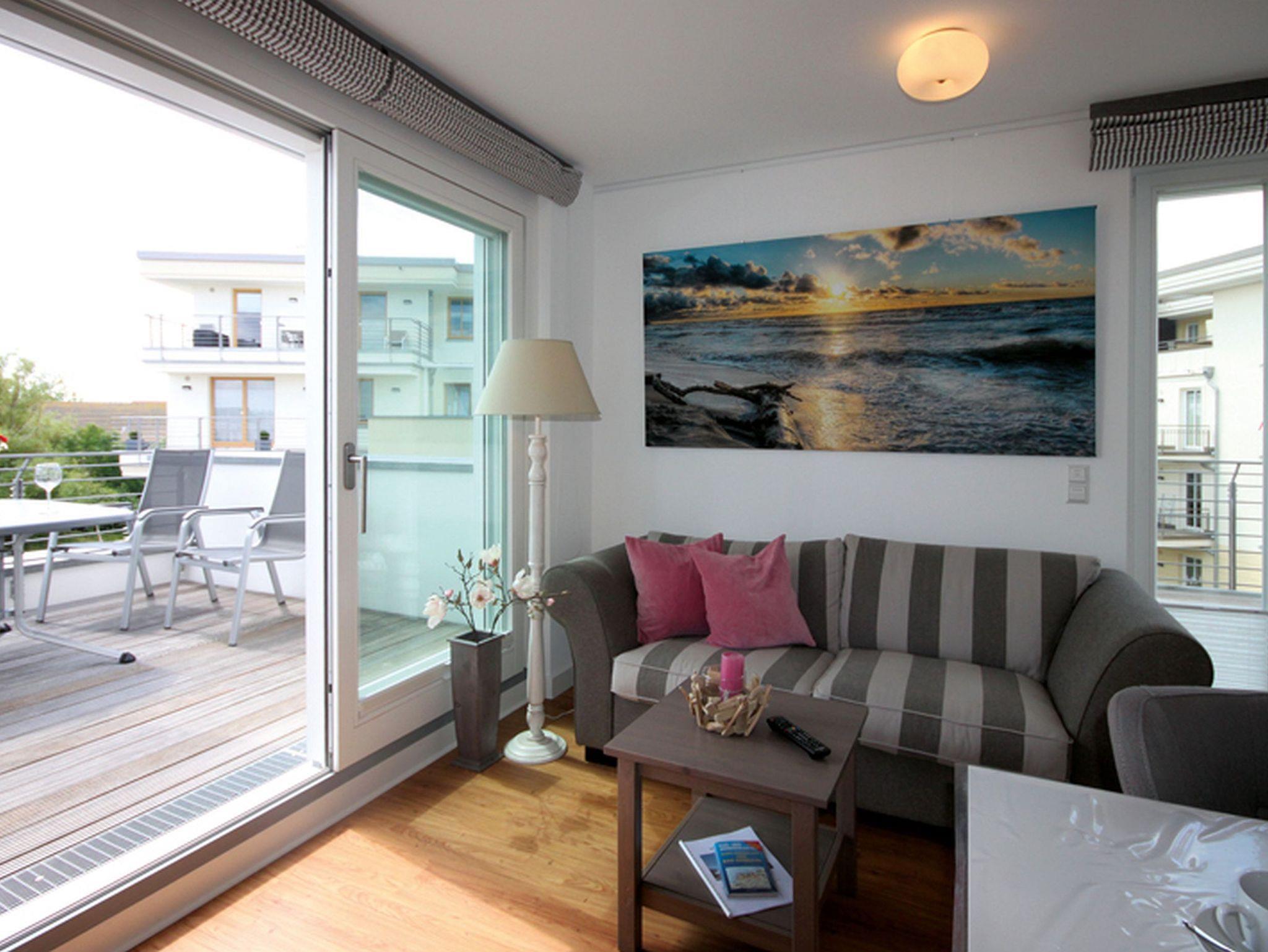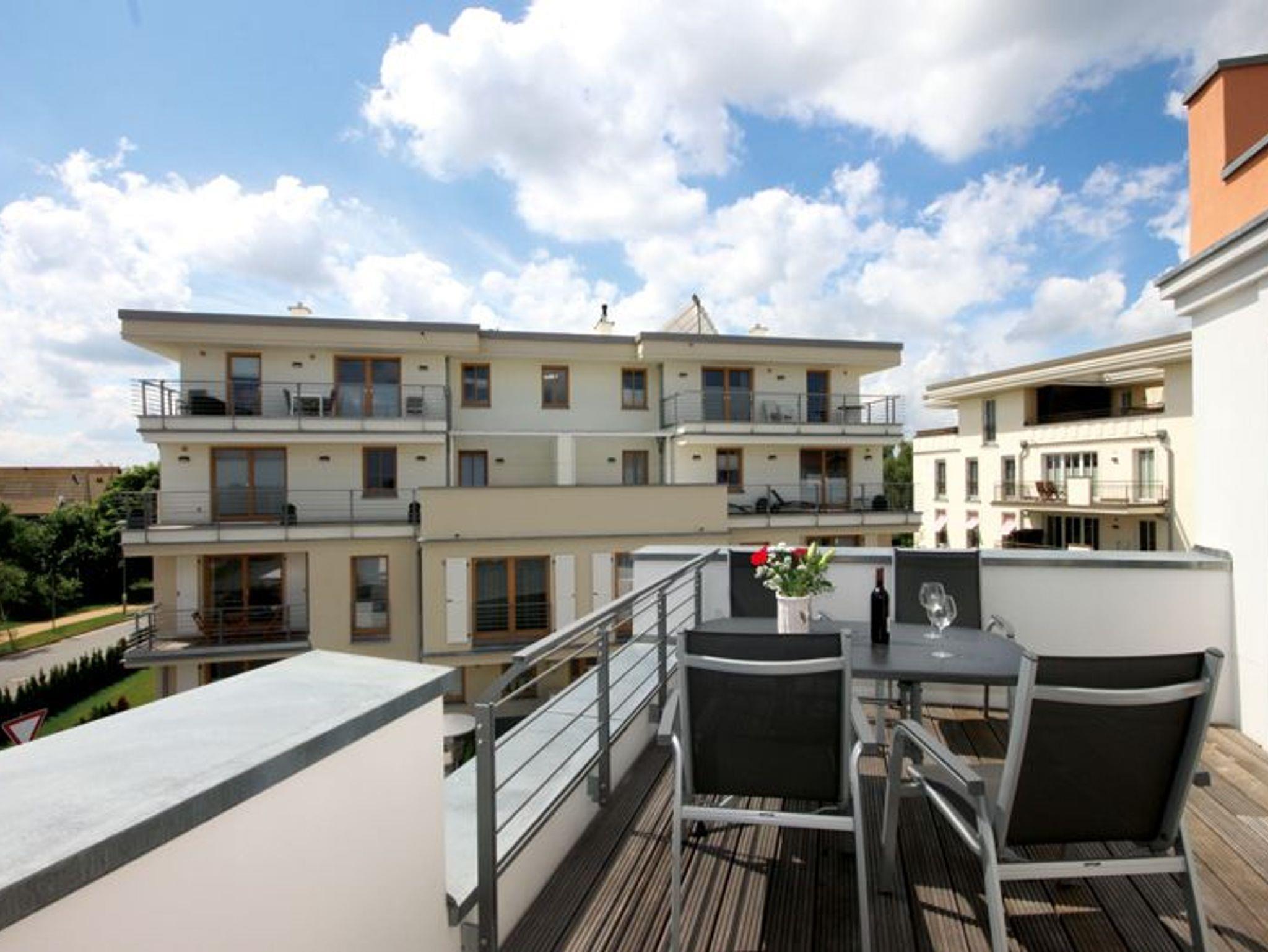 Der Wohnbereich verfügt über eine gemütliche Zweisitzer-Couch mit Beistelltisch und einem großen Wand-TV-Gerät. Die Küche, die offen zum Wohnbereich ist, ist mit einem Esstisch und vier bequemen Stühlen bestückt. Hier finden Sie, neben der Standardausrüstung, einen Geschirrspüler, Backofen, Cerankochfeld und einen Kühlschrank, inklusive Gefrierfach. Diese Ferienwohnung besitzt zwei Schlafräume. Ein Schlafraum ist mit einem Doppelbett und einem Schwebetürschrank ausgestattet. Im zweiten stehen zwei Einzelbetten und ein Kleiderschrank für Ihre Kleidung zur Verfügung. Das Duschbad besticht mit einer bodengleichen Dusche, einem Waschtisch, einem Fön und einer eigenen Sauna. Diese ist gebührenfrei. Zusätzlich befindet sich noch ein Gäste-WC im Flurbereich. Der 2. Balkon (Dachterrasse) kann über den Wohnraum betreten werden. Da diese(r) nach Süden ausgerichtet ist, können Sie viele Sonnenstunden dort verbringen. Zum anderen Balkon gelangen Sie sowohl über die beiden Schlafräume als auch aus dem Wohnbereich. Er liegt nach Westen. Dort steht Ihnen ein, seitlicher Blick auf das Meer zur Verfügung. Für Ihren PKW steht ein Stellplatz in der Tiefgarage des Objekts bereit. Bitte beachten Sie die Durchfahrtshöhe von max. 1,90 m. Bei Überschreitung der maximalen Durchfahrtshöhe, besteht die Möglichkeit auf einen kostenpflichtigen Parkplatz in unmittelbarer Nähe auszuweichen. Der im Gebäude installierte Aufzug erleichtert den Transport der mitgebrachten Koffer. Im Bereich der Tiefgarage ist zudem ein separater abschließbarer Fahrradraum eingerichtet worden. Und ein Aufzug in Ihre Wohnebene. Außerdem können im Waschraum, der sich im Erdgeschoss befindet, Bekleidung maschinell gewaschen und getrocknet werden. Diese Geräte sind kostenpflichtig. Halten Sie 50 Cent- Münzen bereit. Hier noch einige Hinweise: Die Ferienwohnung ist eine Nichtraucherwohnung. Haustiere aller Art sind nicht gestattet. In der Nebensaison und Zwischensaison wird für die dritte und vierte Person ein Aufpreis in Höhe von 10,00 Euro/ÜN pro Person berechnet. Wäscheset, Kinderreisebett und Kinderhochstuhl können kostenpflichtig zugebucht werden. Sichern Sie sich zusätzlich den Anspruch auf einen der begehrten Strandkörbe nur ein paar Meter entfernt von den rauschenden Wellen der Ostsee (Anfang Mai - Ende August) und buchen Sie jetzt zu besonderen Konditionen (12,00 Euro pro Tag oder 75,00 Euro pro Woche.)