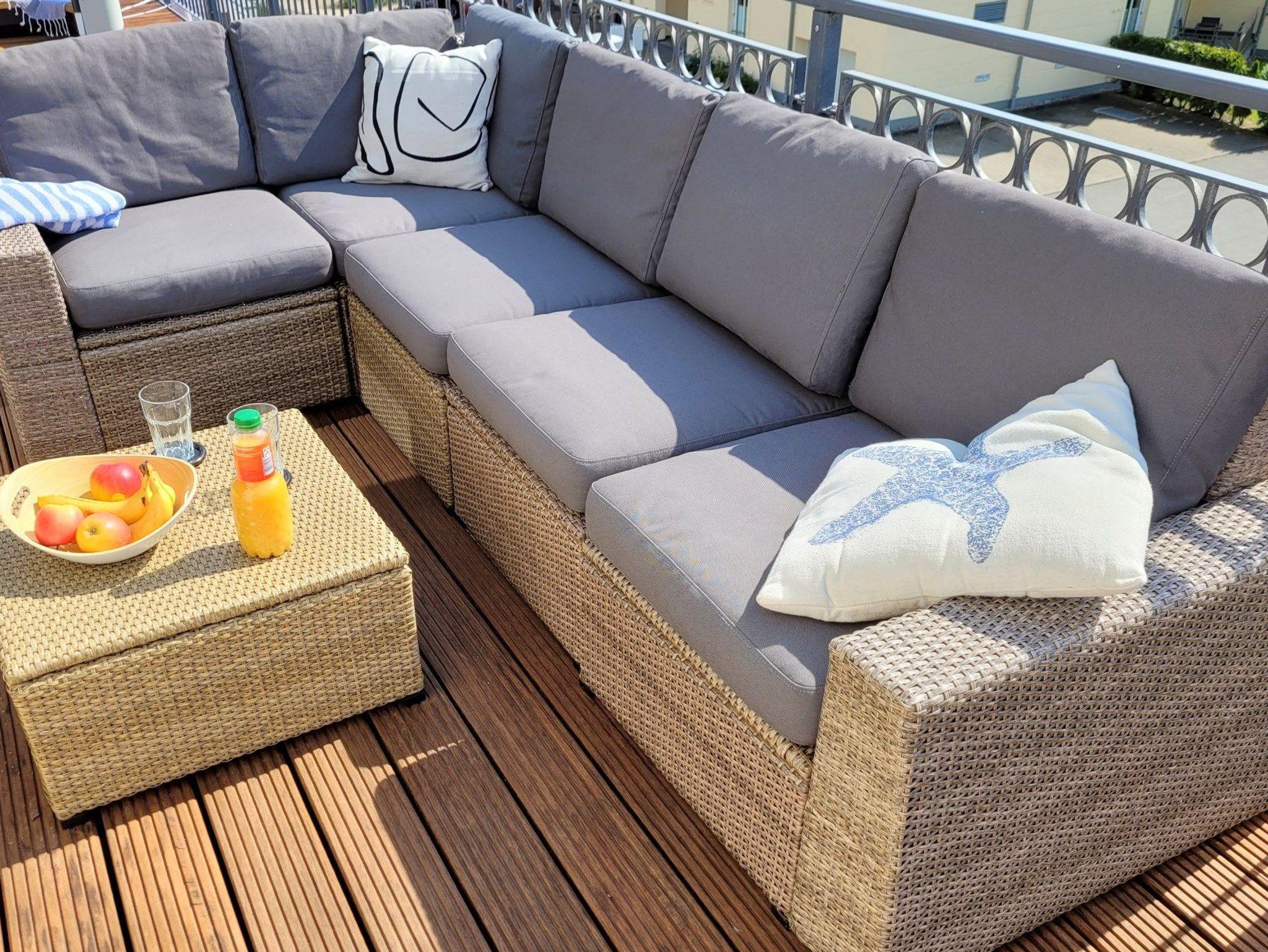Der moderne, lichtdurchflutete Wohnraum empfängt Sie mit einer gemütlichen Leder-Ecksitzgruppe, einem Couchtisch sowie einem Flatscreen-TV mit Blu-ray- / DVD-Player und einer HiFi-Anlage (mit kabelloser Wiedergabe vom eigenen Smartphone/Tablet). Ein großer Tulip-Esstisch mit Stühlen lädt zu gemeinsamen Mahlzeiten ein. Die hochwertig eingerichtete Einbauküche ist voll ausgestattet mit Geschirrspüler, Kühlschrank, inklusive Gefrierfach, Backofen, Mikrowelle, Induktions-Kochfeld, Dunstabzugshaube, Kaffeemaschine, Wasserkocher und Toaster. Zwei modern eingerichtete Schlafzimmer empfangen Sie jeweils mit bequemem Doppelbett (hochwertige Kaltschaum-Matratzen/ getrennt 180 x 200 cm. Die Wohnung ist mit je 4 Sets an Standardbettdecken 135 x 200 cm und Komfort Bettdecken 155 x 220 cm ausgestattet. (Bitte beachten Sie: Für die Komfort Bettdecken kann keine Bettwäsche gestellt werden.) Ein raumhoher Kleiderschrank bietet ausreichend Platz für Ihr Gepäck. Eines der Schlafzimmer verfügt über einen eigenen Zugang zur Terrasse. Das andere ist mit einem Sound-System sowie einem angrenzenden Wannenbad ausgestattet. In der Unterkunft befindet sich zudem ein zweites Bad mit bodengleicher Walk-In Regendusche, großer Spiegelfront, Föhn und einem Fenster, durch das Sie die Morgensonne begrüßt. Das einzigartige Penthouse-Highlight ist die 70 qm große Dachterrasse (Balkon) in Süd-West-Lage. Dort verwöhnt Sie die Sonnen den ganzen Tag. Neben einer Esstischgruppe und einem Sonnenschirm stehen Ihnen von März bis Oktober außerdem eine Chillout-Lounge und exklusiv der vermutlich größte Strandkorb zwischen Wismar und Warnemünde zur Verfügung. Von hier genießen Sie einen wunderschönen Blick auf die Ostsee. Bei gutem Wetter kann hier sogar unter freiem Himmel übernachtet werden! Bitte den Schlafsack und ein zusätzliches Laken (140 x 200 cm) nicht vergessen. Die Wohnung ist mit raumhohen Fenstern und Blindouts ausgestattet. Die Fußbodenheizung sorgt für wohlige Wärme in allen Räumen. Ein separater Abstellraum bietet Stauraum für Ihre Urlaubskleidung. Zu Ihrer Ferienwohnung gehört ein kostenfreier Tiefgaragenstellplatz. Bitte beachten Sie die Durchfahrtshöhe von max. 1,90 m. Der im Gebäude installierte Aufzug erleichtert den Transport der mitgebrachten Koffer. Über den Innenhof der Villa erreichen Sie den abschließbaren Fahrradraum sowie den angrenzenden Waschraum. Eine Waschmaschine und ein Trockner stehen zu Ihrer Verfügung (gegen Gebühr / 1,00 Euro Münzen). Im Erdgeschoss finden Sie eine Eisdiele und ein Restaurant. In der Nähe außerdem ein ?Kaufmannsladen? mit Backshop, diversen Strand- und Souvenirartikeln sowie einen Fahrradverleih. Der beliebte Ostsee-Rad-Wanderweg beginnt vor der Haustür. Bei herrlichen Fahrradtouren erreichen Sie die bekannten Seebäder Heiligendamm (3 km), Kühlungsborn (8 km), Nienhagen (4 km) und Warnemünde (13 km). Hier noch einige Hinweise: Es handelt sich um eine Nichtraucherwohnung. Es sind keine Haustiere erlaubt. Ab der dritten und vierten Person wird ein Aufpreis in Höhe von 10,00 Euro/ÜN pro Person berechnet. Wäscheset, Kinderreisebett und Kinderhochstuhl können kostenpflichtig zugebucht werden. Das kostenfreie WLAN in der Unterkunft ist ausschließlich für die Verwendung von Social Media und den Austausch von Bildern mit Familie und Freunden gedacht. Die Nutzung zum Streamen von Filmen ist nicht vorgesehen. Sichern Sie sich einen der begehrten Strandkörbe nur ein paar Meter entfernt von den rauschenden Wellen der Ostsee (Anfang Mai - Ende August) und buchen Sie jetzt zu besonderen Konditionen (12,00 Euro pro Tag oder 75,00 Euro pro Woche).