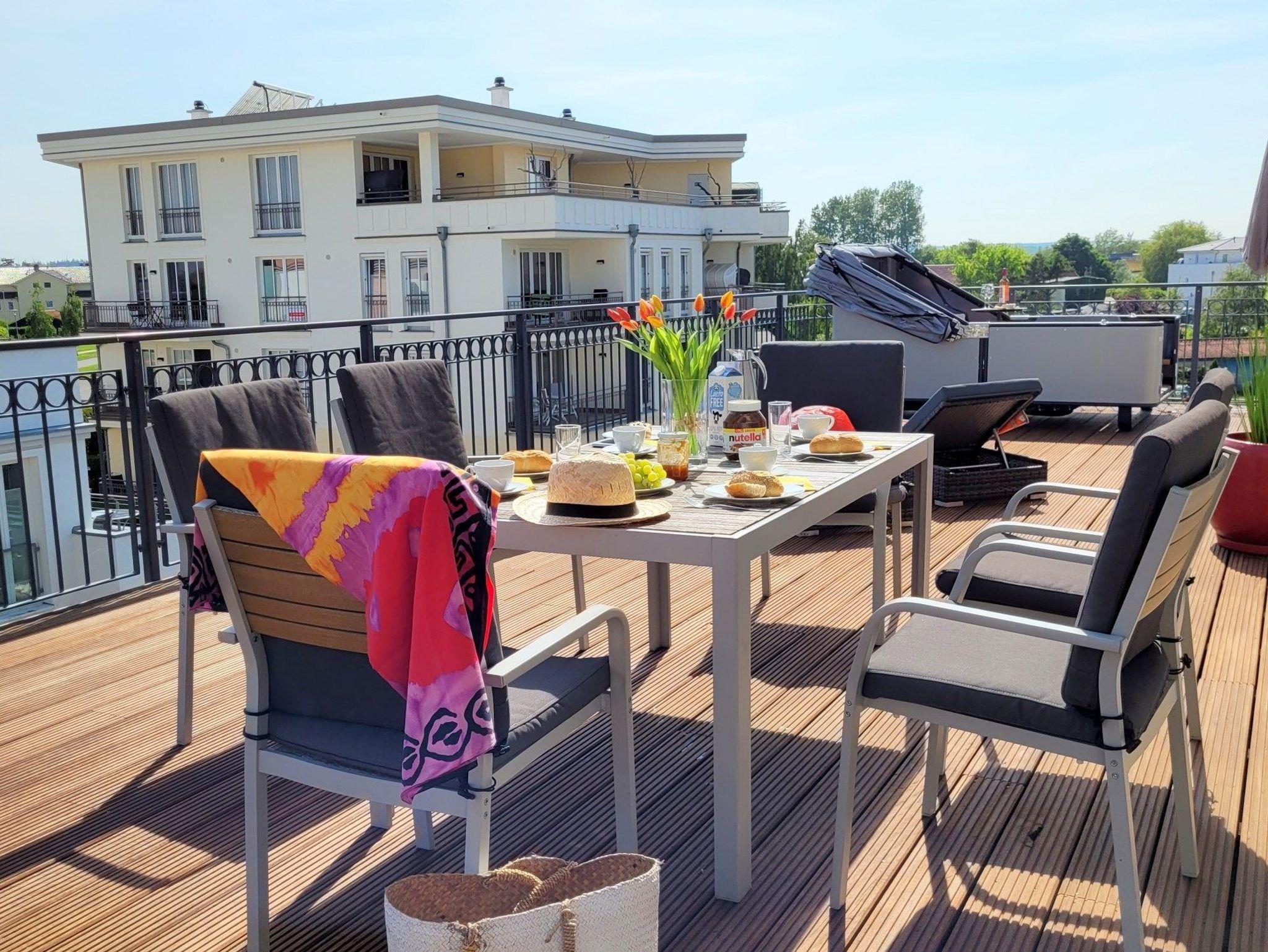 Strandnahe 3-Raum-Penthouse-Wohnung für vier Personen, Balkon (große Dachterrasse), Strandkorb und seitlichem Meerblick im 2. OG.
