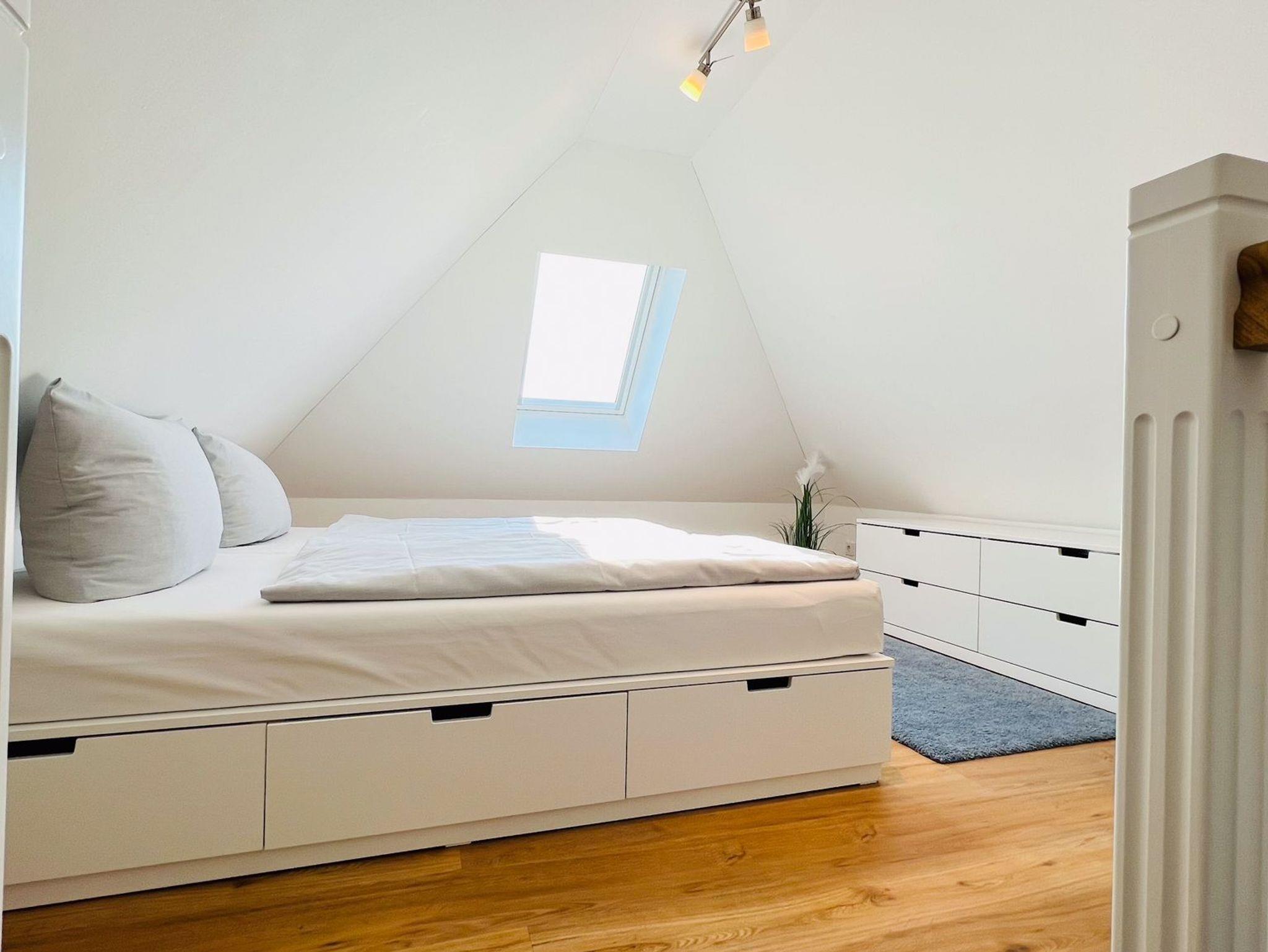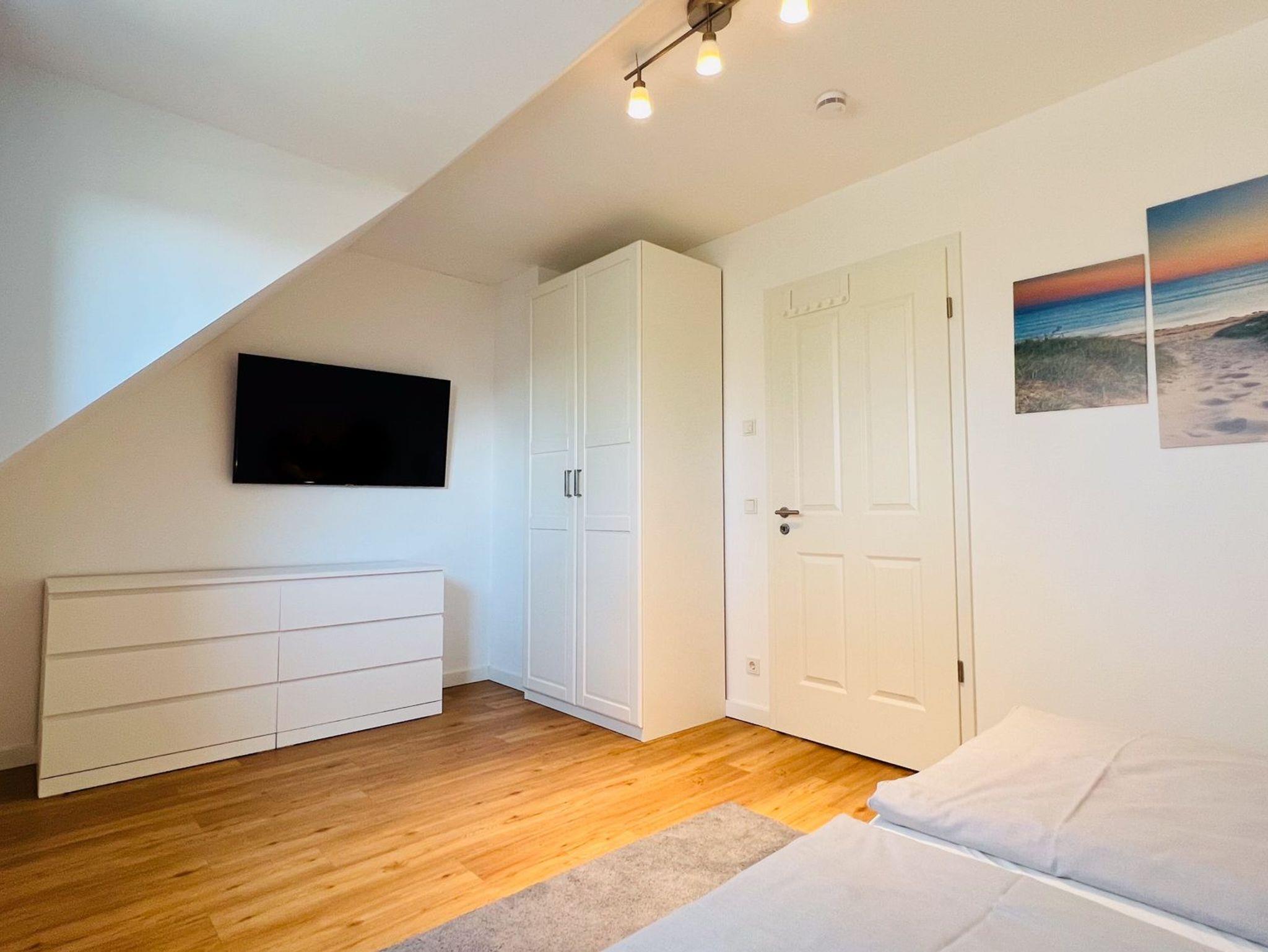 Im ersten Obergeschoss befindet sich das zweite großzügig und hell angelegte Badezimmer, ebenfalls mit ebenerdiger Dusche. Zwei Schlafzimmer mit Doppelbetten (1,80 x 2,00 m / mit Einzelmatratzen) sorgen für süße Träume. Zum besseren Einschlafen kann in beiden Räumen auf den installierten Flat-TV Fernsehen geschaut werden. Genügend Stauraum bieten geräumige Kleiderschränken und Kommoden. Im zweiten Obergeschoss liegt unsere wunderschöne Dachgalerie. Hier gibt es zwei weitere Schlafmöglichkeiten (Einzelbetten).