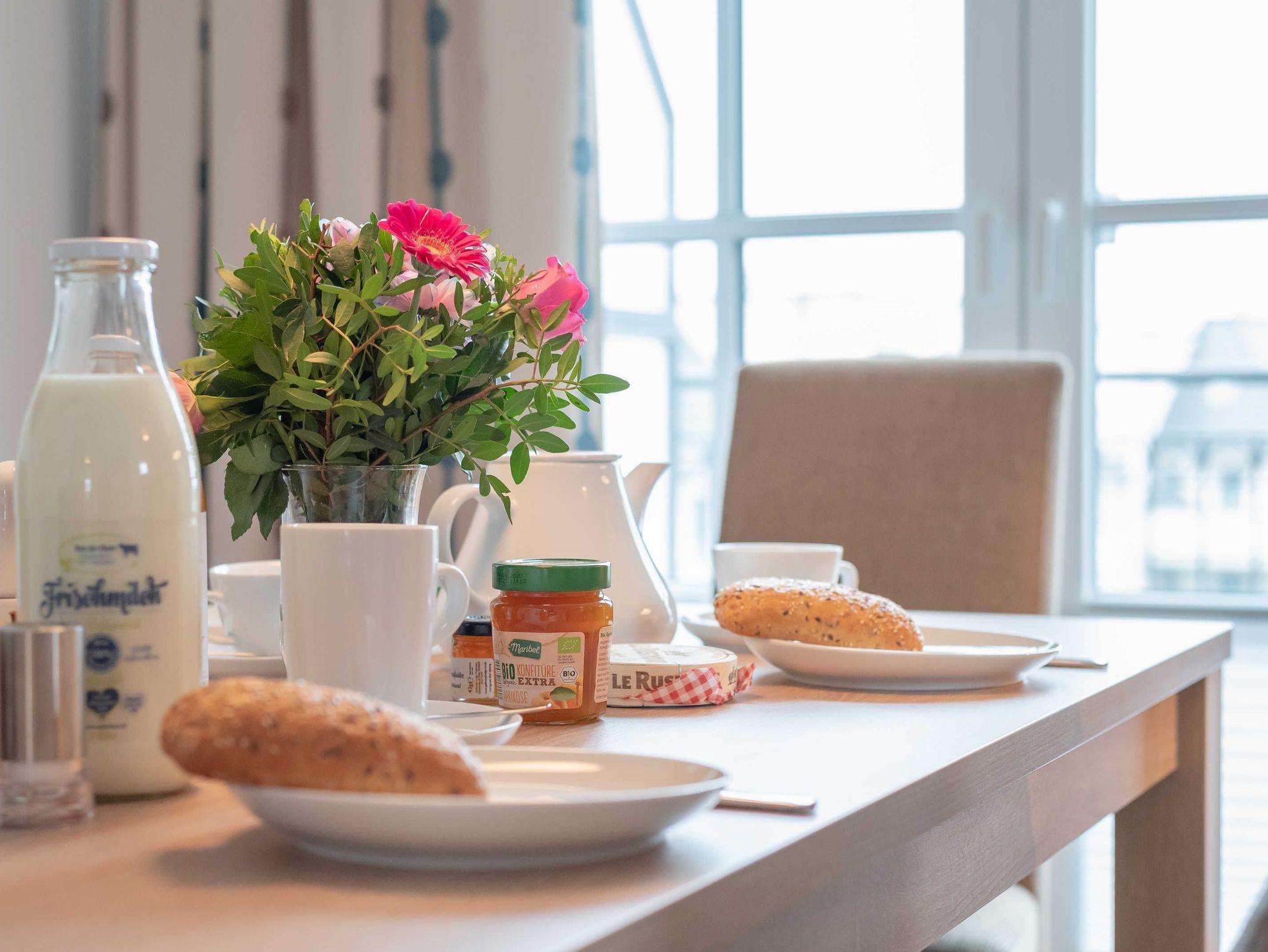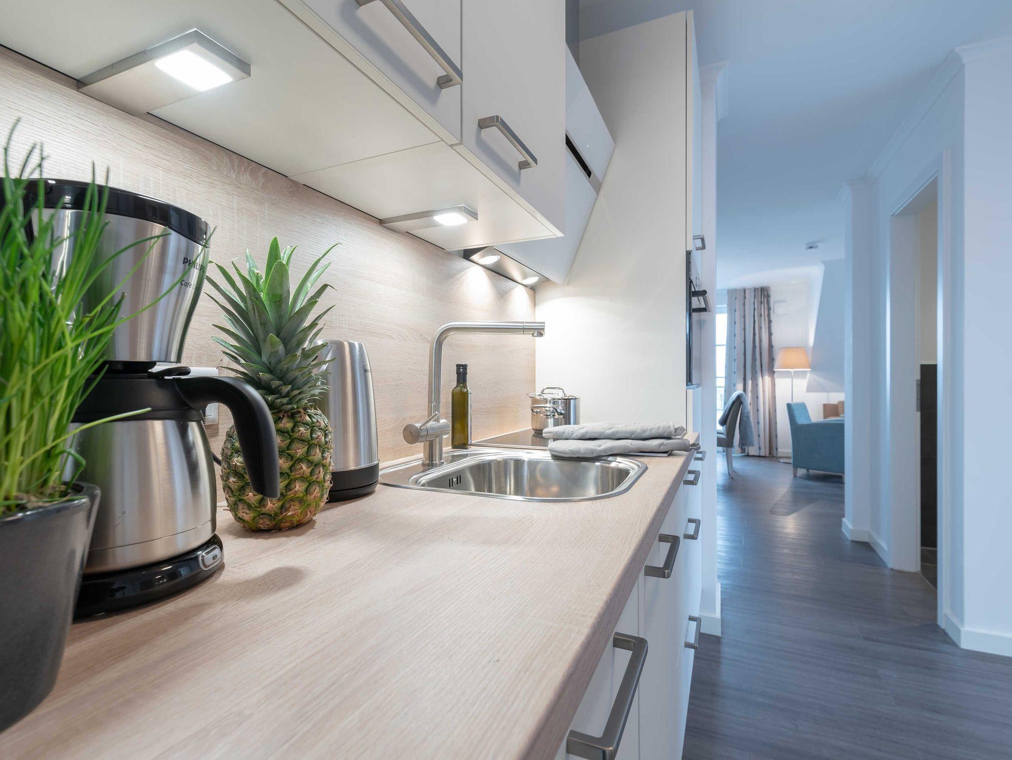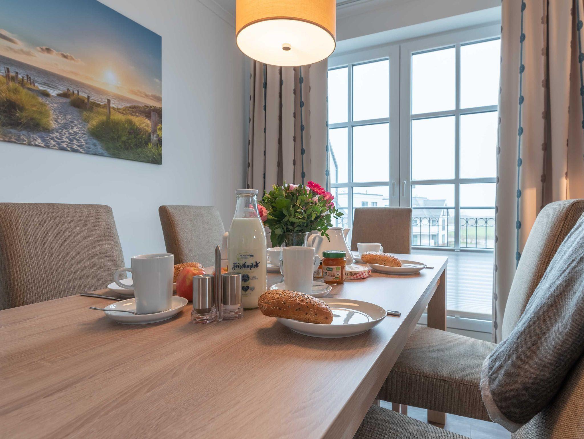 Herzstück der Wohnung ist der offene Wohn- und Essbereich. Eine gemütliche Sitzecke mit Eckcouch (inkl. Schlaffunktion), zwei Sessel und ein Flat-TV laden zum Relaxen ein. In der hellen Wohnküche finden Sie alles, was Sie zum Kochen benötigen ? inklusive einem Herd mit Glaskeramik-Kochfeld und Backofen, einer Kühl-Gefrierkombi, einem Geschirrspüler, modernen Küchengeräten und hochwertigem Geschirr. Der große Esstisch mit sechs Stühlen ist der ideale Platz für ausgiebiges Schlemmen und Zusammensitzen. Bodentiefe Fenster sorgen für viel Licht und führen auf einen der beiden Balkone mit Meerblick. Dort erwarten Sie komfortable Terrassenmöbel. Frühstücken Sie mit traumhaftem Ausblick oder lassen Sie den Tag bei einem Glas Wein am Abend Revue passieren ? was kann es Schöneres geben? Zwei Schlafzimmer sorgen für erholsame Träume. Jedes Zimmer verfügt über einen großen Kleiderschrank für Ihr Urlaubsgepäck. Kommen Sie an und fühlen Sie sich wie zu Hause. Besonderen Komfort bietet das größere Schlafzimmer mit einem Boxspringbett mit Bandscheiben-Federkernmatratzen (1,80 x 2,00 m), einem weiteren Flat-TV sowie dem Zugang zum zweiten Meerblick-Balkon. Zusätzlich zum Hauptbad mit bodentiefer Dusche, einem großen Waschtisch, Wandspiegel und Fön steht den Gästen ein zusätzliches separates WC zur Verfügung.