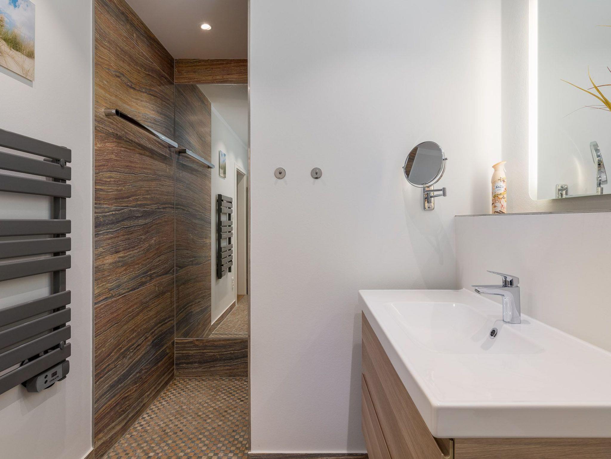 Der offene Wohn- und Essbereich verfügt über eine gemütlichen Sitzecke mit lauschiger Couch und dekorativem Kamin (nicht nutzbar). Ein zusätzlicher Schaukelsessel, ein TV-Flatscreen sowie ein DAB-Radio laden zum Verweilen ein. Leckere gemeinsame Mahlzeiten nehmen Sie gemeinsam am modernen runden Esstisch ein. Die Küche ist komplett mit modernen Geräten ausgestattet: Backofen, Herd, Geschirrspüler, Kühlschrank mit Gefrierfach, Kaffeemaschine, Wasserkocher, Toaster sowie verschiedene Küchenutensilien sind vorhanden. Im Schlafzimmer erwartet Sie ein gemütliches Boxspringbett (180 x 200 cm / durchgehende Matratze). Das moderne Bad verfügt über eine ebenerdige Dusche, einen Waschtisch mit großem Spiegel sowie einen zusätzlichen Kosmetikspiegel.