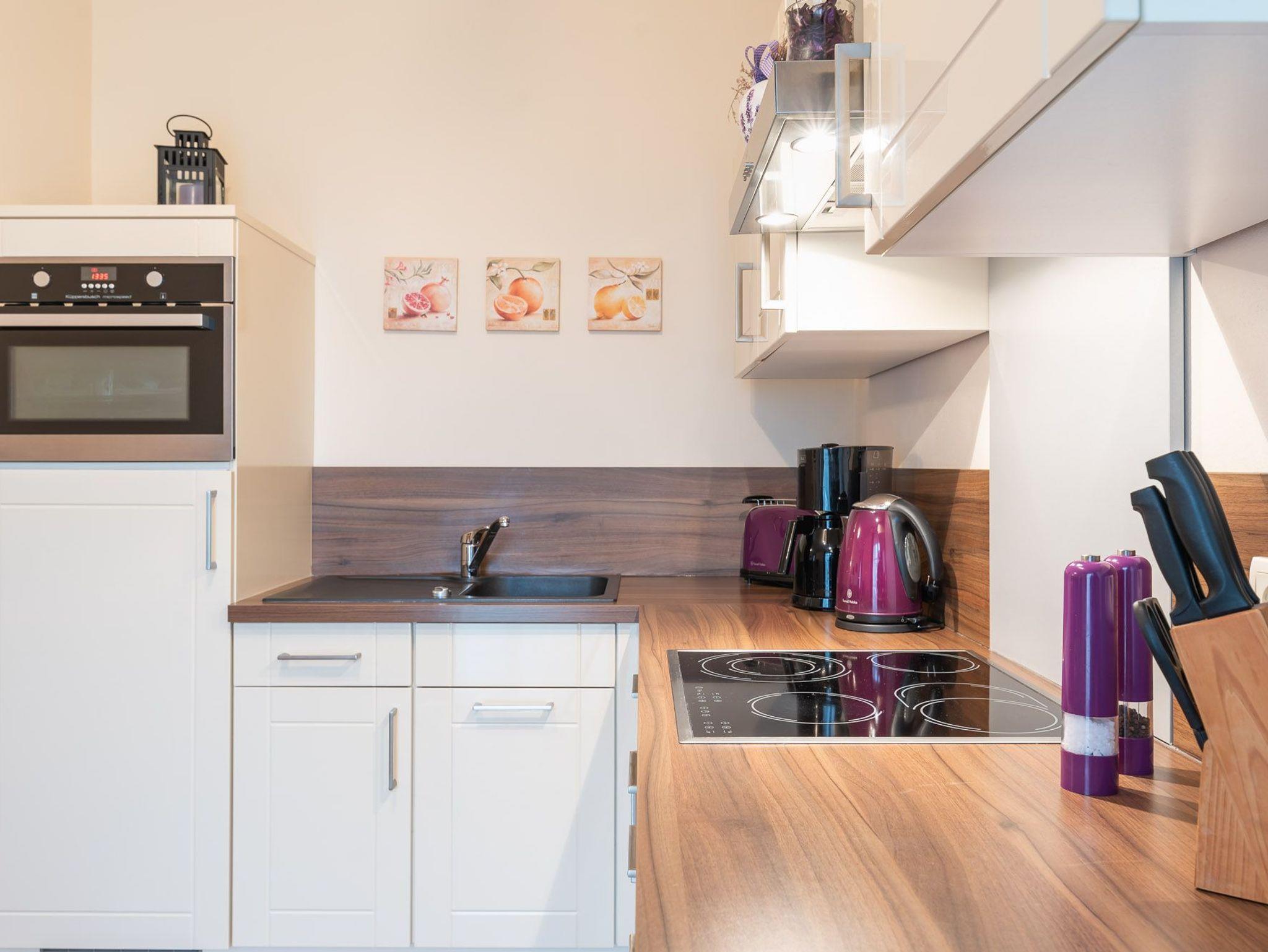 Der weite Wohn-/Essbereich empängt Sie mit einer geräumigen Ledercouch, einem Esstisch mit vier Stühlen, einem Flatscreen-TV inklusive Radio und einem gemütlichen Kaminofen (Kaminholz muss selbst organisiert werden.) Die Küche ist voll ausgestattet mit Geschirrspüler, Kühlschrank mit Gefrierfach, Kaffeemaschine, Wasserkocher, Toaster und Mikrowelle. Das Schlafzimmer besticht mit einem großen Doppelbett (durchgehenden Matratze ) und einem geräumigen Kleiderschrank in warmen Erdtönen. Highlight des Badezimmers ist die geräumige ebenerdige Dusche mit angrenzendem deckenhohen Spiegel. Von Schlafzimmer und Wohnzimmer aus haben Sie möglichkeit die Außenterrasse zu betreten. Bei schönem Wetter laden die Balkonmöbel mit Blick ins Grüne zum Verweilen und Entspannen ein.