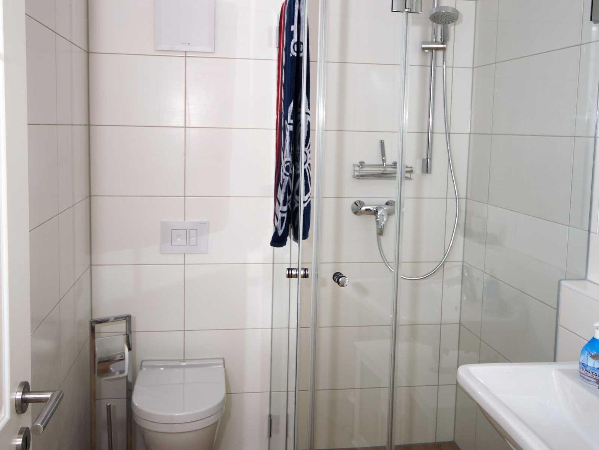 Im Erdgeschoss befindet sich der großzügig gestaltete Wohnbereich mit integrierter Küche und ein Duschbad. Der maritim eingerichtete Wohnbereich eignet sich ideal zum Entspannen nach einem ausgedehnten Strandspaziergang. Die modernen Elektronikgeräte wie wandhängender ein 60-Zoll-Flat-TV, ein Blu-ray-Player, ein DAB-Radio oder ein Spieleabend mit der Familie lassen die Zeit spaßig verfliegen. Die moderne Einbauküche sowie diverse Küchengeräte wie Geschirrspüler, Toaster, Kaffeemaschine, Wasserkocher, Mikrowelle, Herd mit Cerankochfeld, Backofen und Kühl-Gefrierkombination bieten ambitionierten Hobbyköchen auch im Urlaub die Möglichkeit Essen nach eigenen Wünschen zu kochen. Die Küche ist großzügig mit Ess- und Kochgeschirr, Besteck und Gläsern ausgestattet. Im hell gefliesten Duschbad mit Echtglasdusche, großem Waschtisch mit Unterschrank, darüber eingefliestem Wandspiegel, WC, Föhn und Handtuchtrockner wird Hygiene zum Spaß.