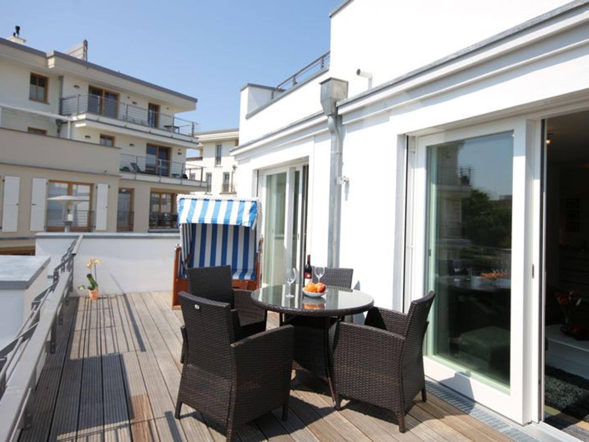 Im Wohnraum erwartet Sie eine großzügige Eck-Couch mit Beistelltisch sowie TV- Gerät inklusive Blu-ray-Player. Die zum Wohnbereich offene Küche wartet mit einer sehr gut ausgestatteten Küchenzeile auf. Sie bietet einen Geschirrspüler, Cerankochfeld, Backofen, Mikrowelle und einen Kühlschrank mit integriertem Gefrierfach. Dazu einen großen Glastisch mit vier Stühlen für gemeinsame Mahlzeiten. Auf dem großzügigen nach Süden ausgerichteten Balkon (Dachterrasse) können Sie wunderbar im Strandkorb relaxen. Für die kühlen Getränke oder das Frühstück, steht ein Tisch und vier Rattan Stühle bereit. Das gemütliche Schlafzimmer bietet Ihnen ein großes Doppelbett, einen Schwebetürenschrank mit viel Stauraum und ein TV- Gerät. Das elegante Duschbad ist mit einer bodengleichen Dusche, einem Waschtisch, einem Handtuchwärmer und einem Fön ausgestattet. In die Sauna gelangen Sie vom Wohnbereich aus. In die Sauna wurde ein Fenster für das Tageslicht eingebaut. Für Ihr Fahrzeug steht ein kostenfreier Stellplatz in der Tiefgarage zur Verfügung. Mit dem Aufzug können Sie Ihr Gepäck in Ihre Wohnetage befördern. Bitte beachten Sie die Durchfahrtshöhe von max. 1,90 m. Bei Überschreitung der maximalen Durchfahrtshöhe, besteht die Möglichkeit auf einen kostenpflichtigen Parkplatz in unmittelbarer Nähe auszuweichen. Zudem befindet sich ebenfalls im Untergeschoss ein separater abschließbarer Fahrradraum. Noch einige Hinweise: Es handelt sich um eine Nichtraucherwohnung. Haustiere aller Art sind nicht erlaubt. Das kostenfreie WLAN in der Unterkunft ist ausschließlich für die Verwendung von Social Media und den Austausch von Bildern mit Familie und Freunden gedacht. Die Nutzung zum Streamen von Filmen ist nicht vorgesehen. Wäscheset, Kinderreisebett und Kinderhochstuhl können kostenpflichtig zugebucht werden. Eine Waschmaschine und ein Trockner stehen im Waschraum im Erdgeschoss des Objekts zur Verfügung (gegen Gebühr / 0,50 Euro Münzen). Der im Gebäude installierte Aufzug erleichtert den Transport der mitgebrachten Koffer. Sichern Sie sich zusätzlich den Anspruch auf einen der begehrten Strandkörbe nur ein paar Meter entfernt von den rauschenden Wellen der Ostsee (Anfang Mai - Ende August) und buchen Sie jetzt zu besonderen Konditionen (12,00 Euro pro Tag oder 75,00 Euro pro Woche).