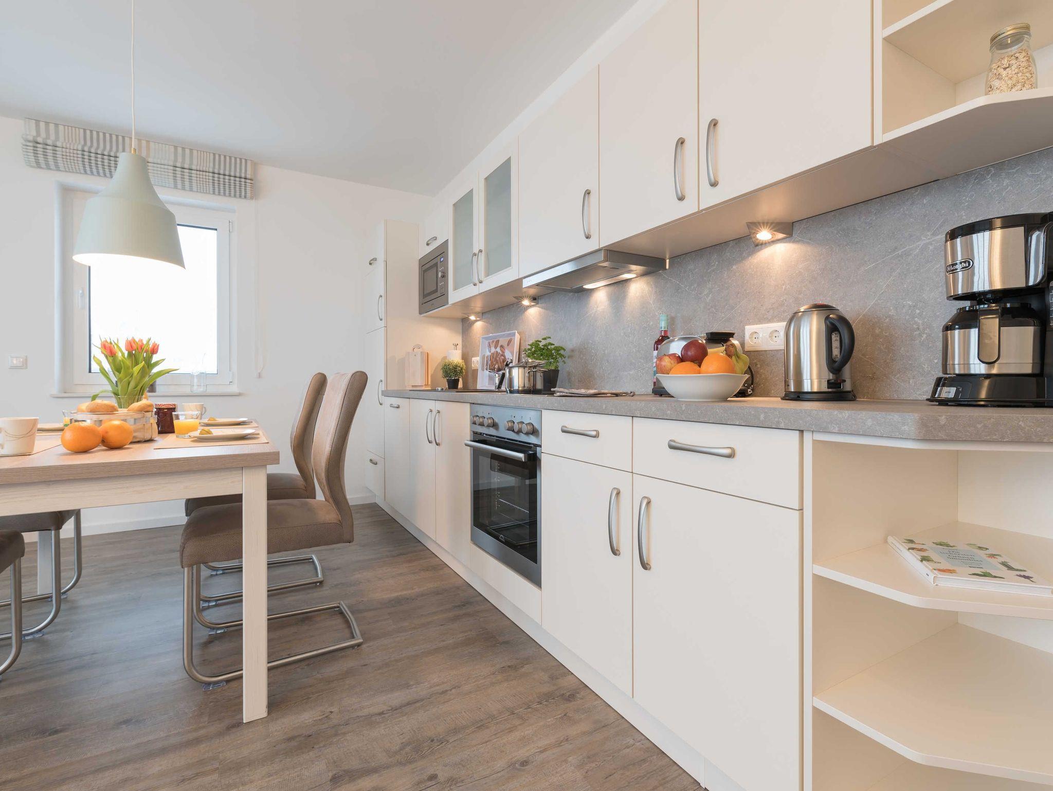 Die hochwertige, moderne Einbauküche verfügt über einen Geschirrspüler, einen Kühl- und Gefrierschrank, einen Backofen, ein Cerankochfeld, eine Mikrowelle, einen Toaster, eine Kaffeemaschine und einen Wasserkocher. Eine Geschirr-, Koch- und Zubehörausstattung - vom Mixer bis zum Eierbecher - ist vorhanden.