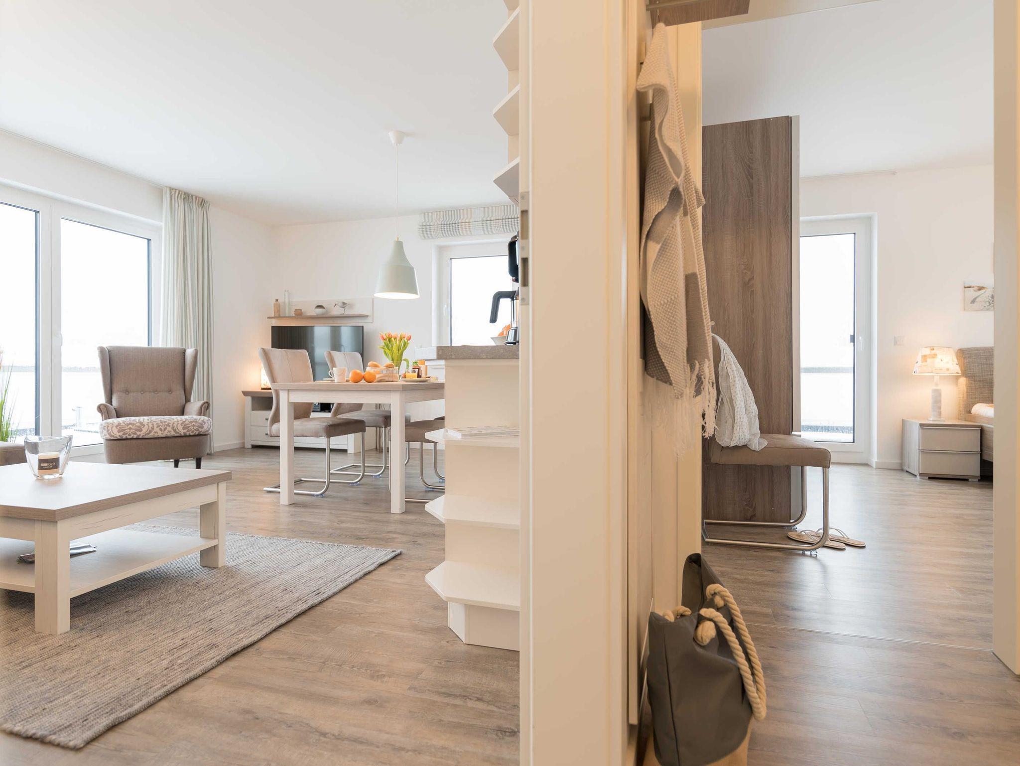 Im hellen und geschmackvoll eingerichteten Wohnzimmer laden eine gemütliche Couch mit passendem Sessel sowie ein großer Esstisch zum Verweilen ein. Die bodentiefen Terrassenelemente sorgen für lichtdurchfluteten Wohngenuss. Weiterhin gehören Flatscreen-TV´s im Wohn- und im Kinderzimmer, ein DVD-Player sowie eine Stereo-Anlage zur modernen Ausstattung dieser Ferienwohnung. Die Dachterrasse in West- und Nordausrichtung ist mit geschmackvollen Gartenmöbeln versehen. Sie umläuft das Haus an zwei Seiten und ist über Wohn- und Schlafzimmer erreichbar. Genießen Sie hier einen entspannten Urlaub beim Sonnenbad, bei gemeinsamen Mahlzeiten oder einfach beim Relaxen.