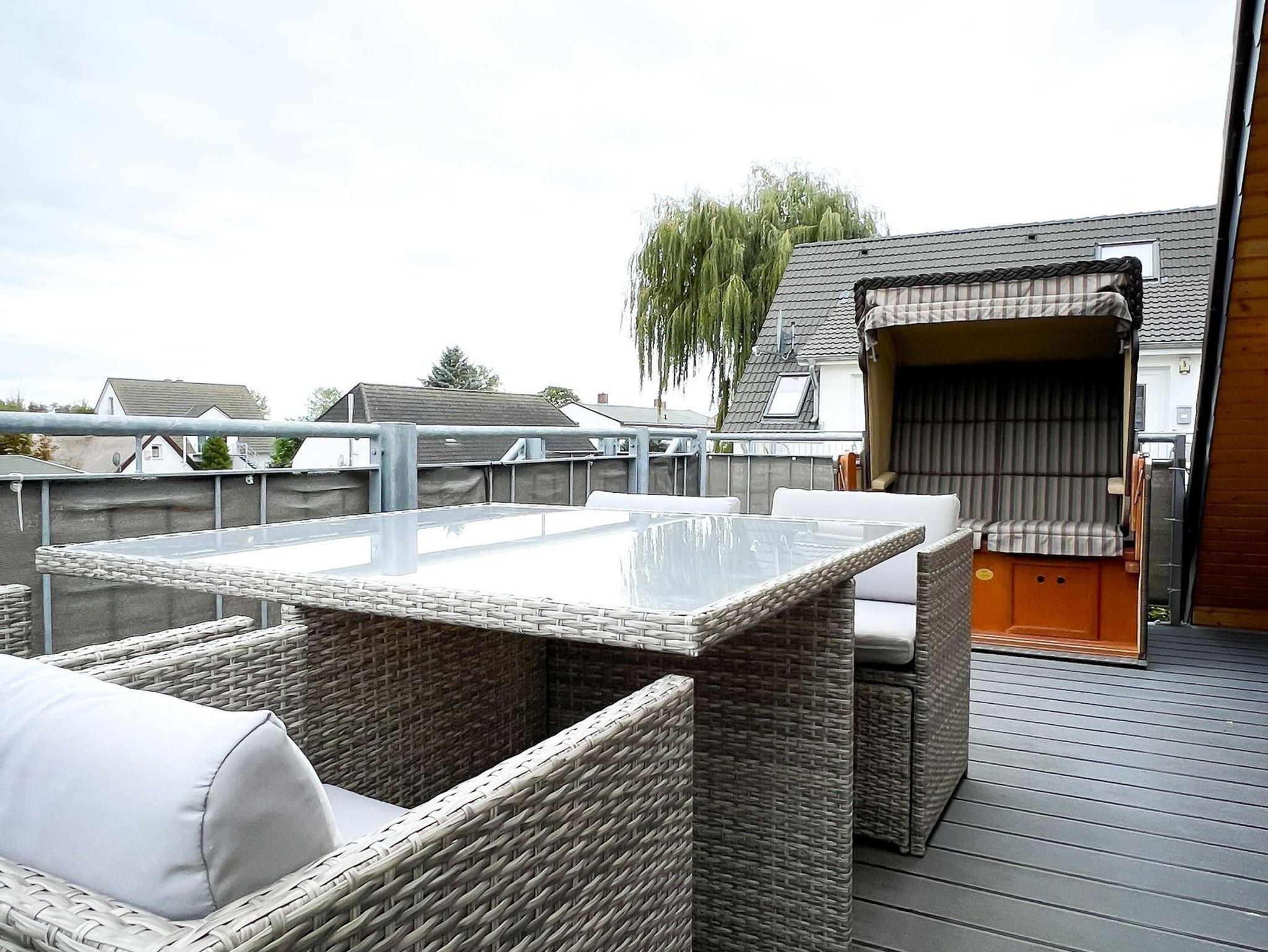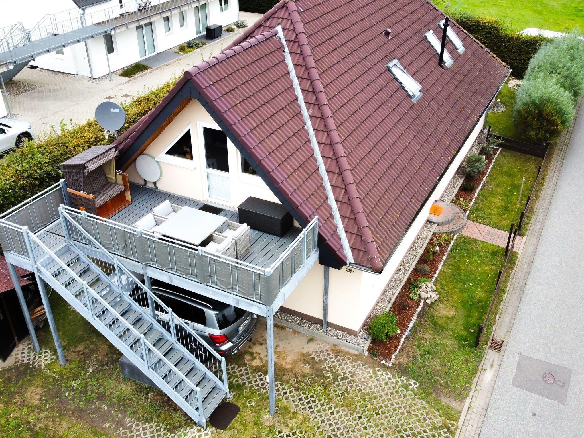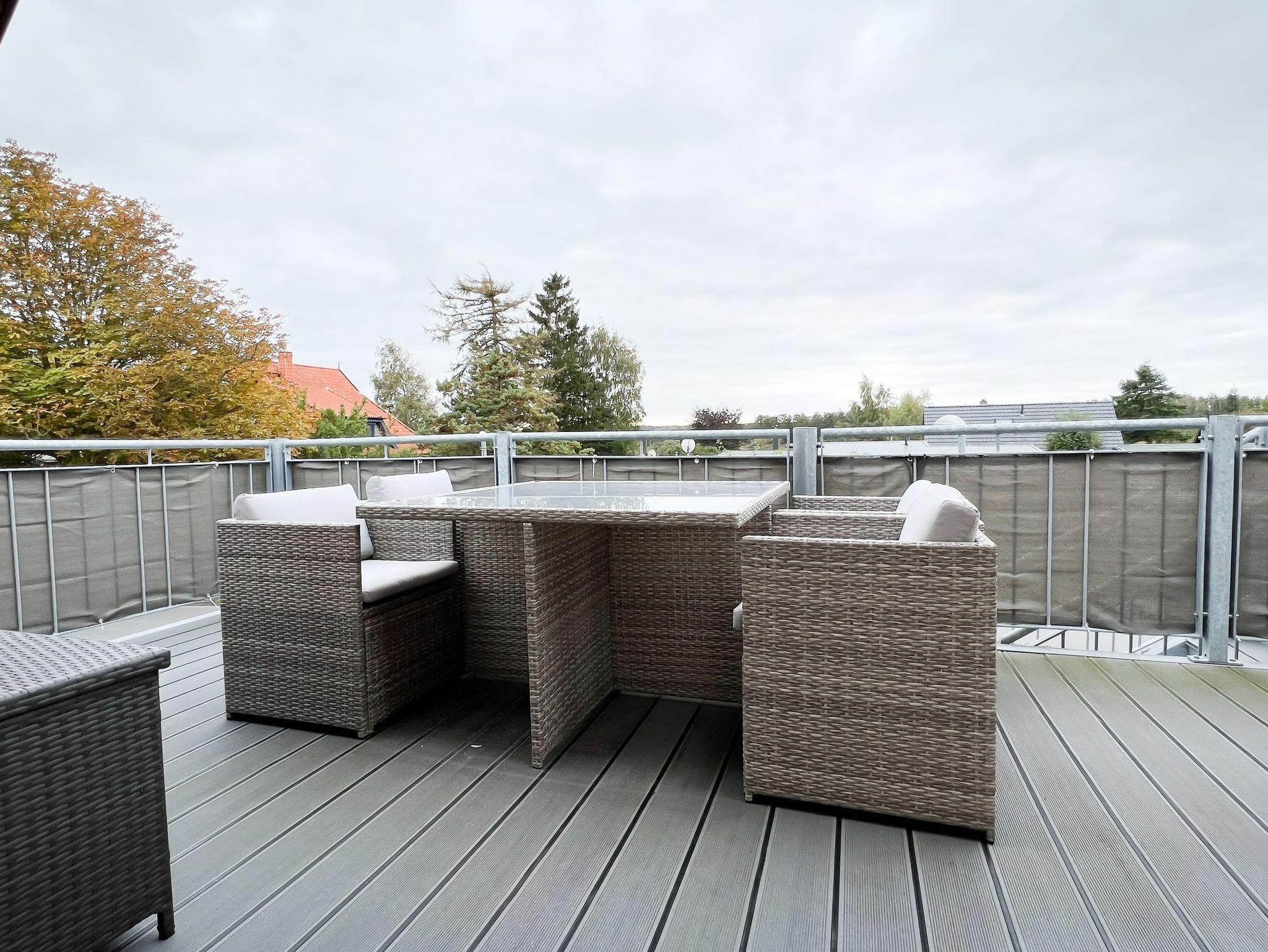 Die Ferienwohnung Sandkorn wurde 2020 komplett renoviert und bietet in Bezug auf Ausstattung und Komfort eine vergleichbare Qualität wie ihr großer Bruder Findling im Erdgeschoss. Sandkorn befindet sich im Dachgeschoss und ist über eine moderne Außentreppe erreichbar. Bei Ankunft gelangen Sie zunächst auf eine großzügige Dachterrasse, die mit einem gemütlichen Strandkorb zum Sonnenbaden und Verweilen einlädt. Von hier aus haben Sie sogar eine Aussicht auf den Conventer See in der Ferne.