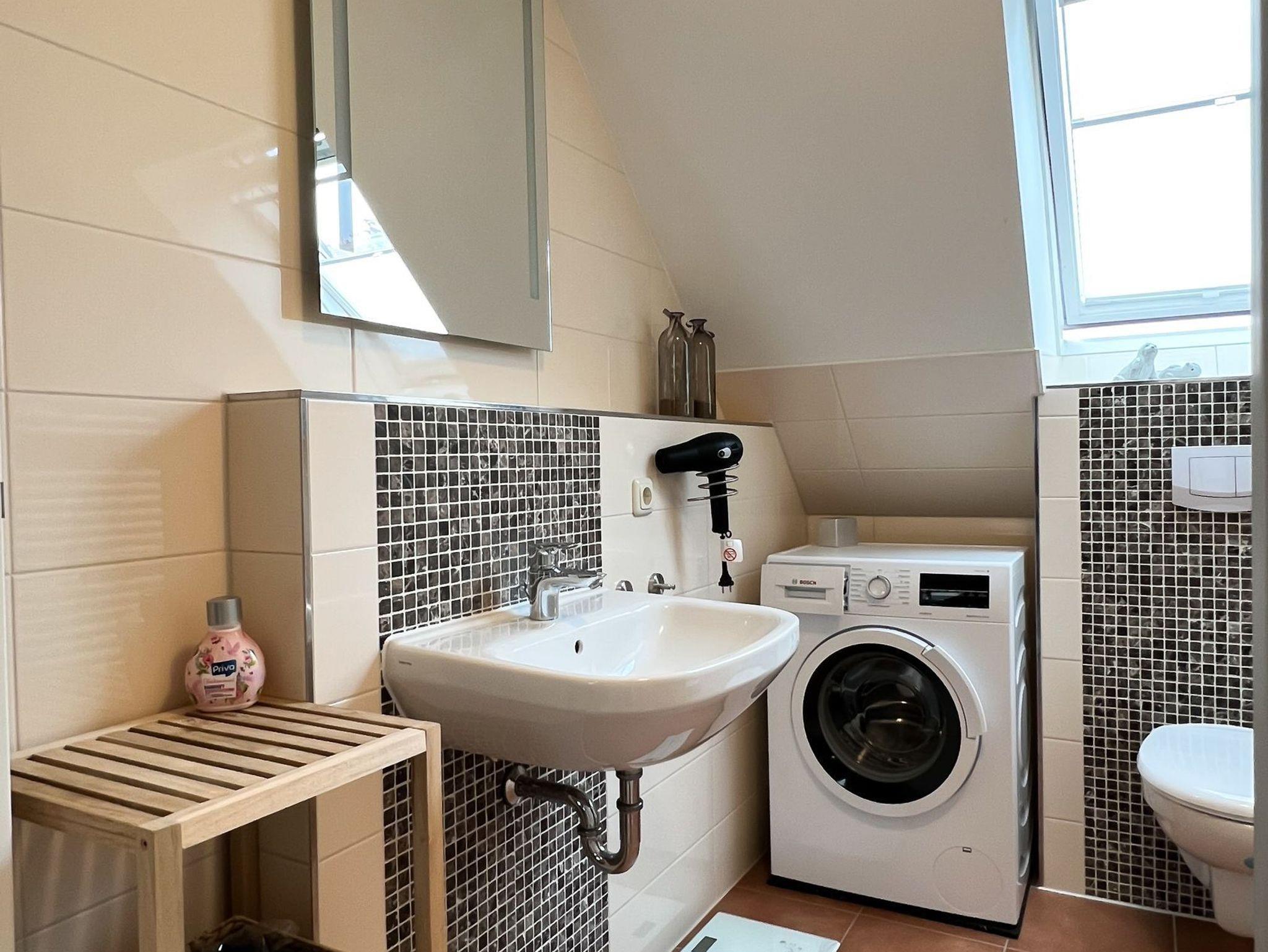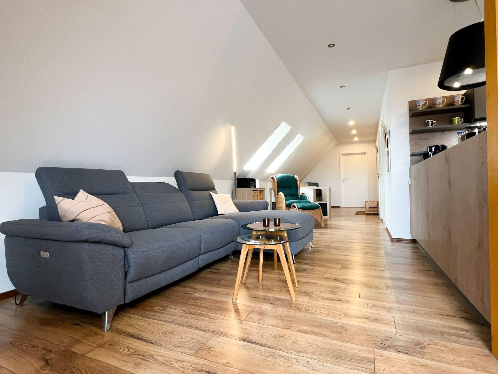 Die hochwertige offene Küche grenzt unmittelbar an den großzügigen Wohnbereich, der einen Essplatz und eine Leseecke unter dem Dachfenster bietet. Das Schlafzimmer ist mit einem komfortablen Doppelbett ausgestattet. Die Böden sind mit Laminat versehen, während der Rest der Wohnung gefliest ist. Ein modernes Tageslichtbad mit Waschmaschine und Regendusche rundet das Gesamtbild ab.
