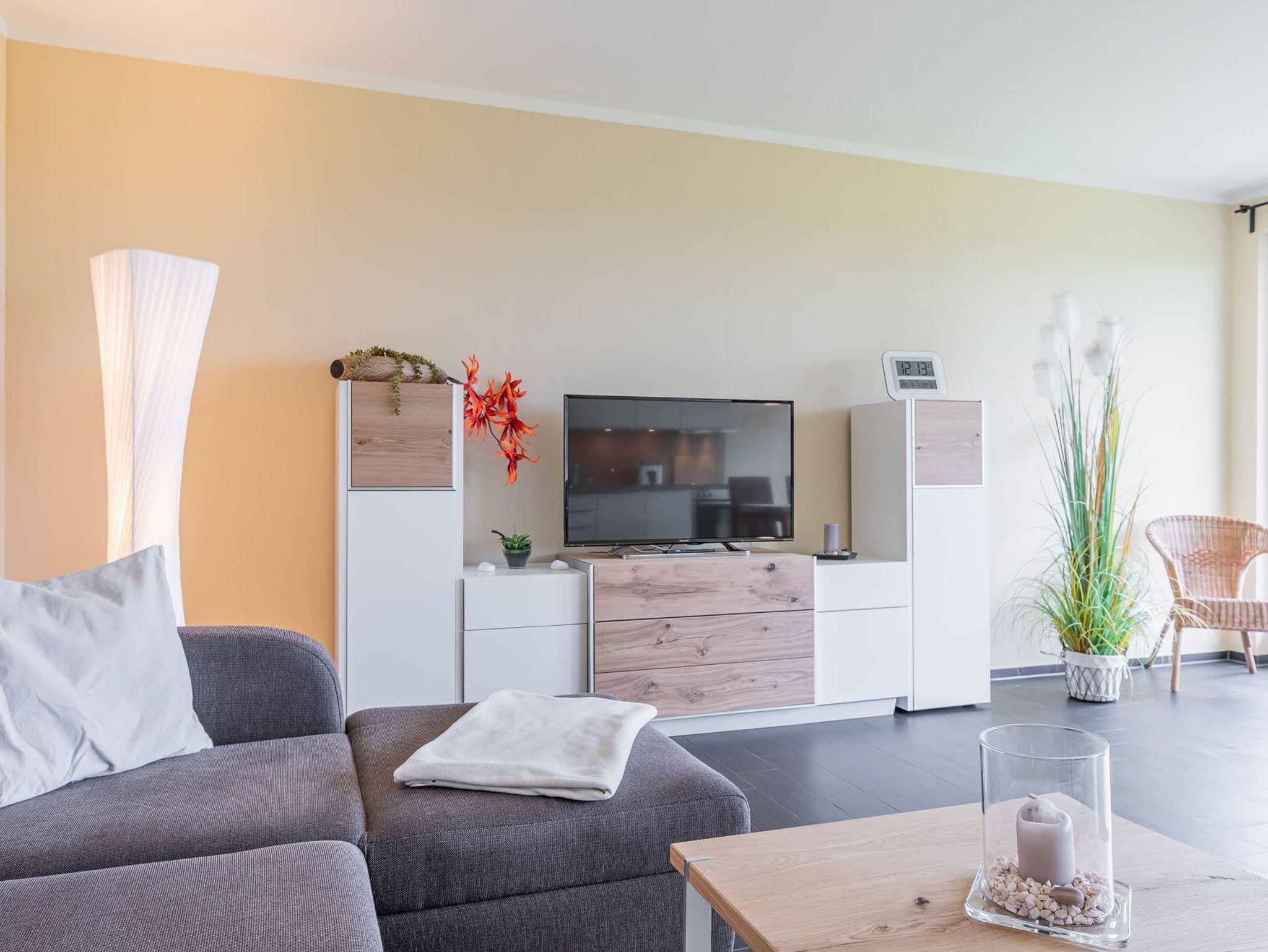 Im Flur der Ferienwohnung befindet sich genügend Platz für die Ablage von Strandutensilien. Der gemütliche Couchbereich (ausziehbar 1,6 x 2,0 m) mit Fernseher im offenen Wohn- und Kochbereich lädt zu erholsamen Abenden und zum Träumen mit Blick auf den Deich ein. Die offene Küche mit großzügigem Essbereich, ist komfortabel ausgestattet für kleine Kochabende. Geschirrspüler und verschiedenes Koch- und Esszubehör sind vorhanden. Der kleine Balkon in Nordausrichtung ist perfekt für das Frühstücken im Sommer geeignet. Das Schlafzimmer besitzt ein großes Bett (2,0 x 1,8 m / getrennte Matratzen) und einen geräumigen Kleiderschrank. In dem modernen Badezimmer befinden sich eine ebene Dusche sowie ein großer Spiegel und ein Haartrockner für die perfekte Föhnwelle.