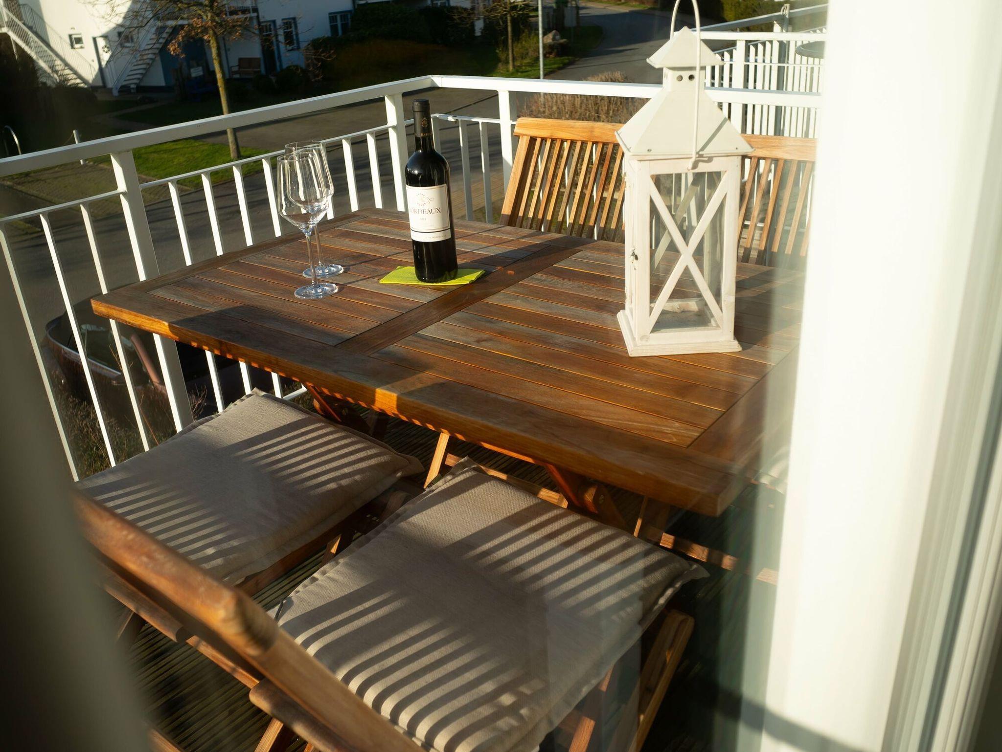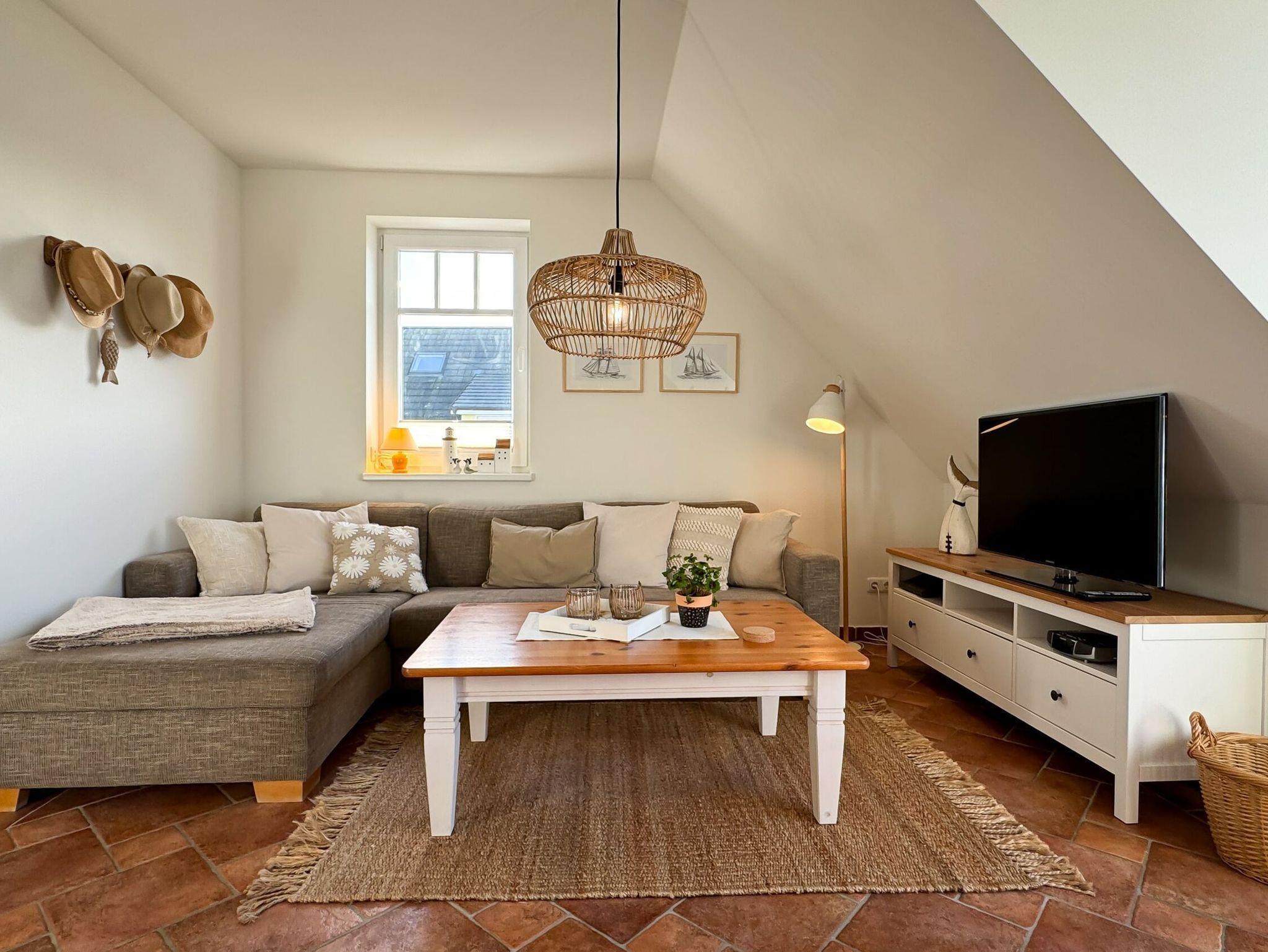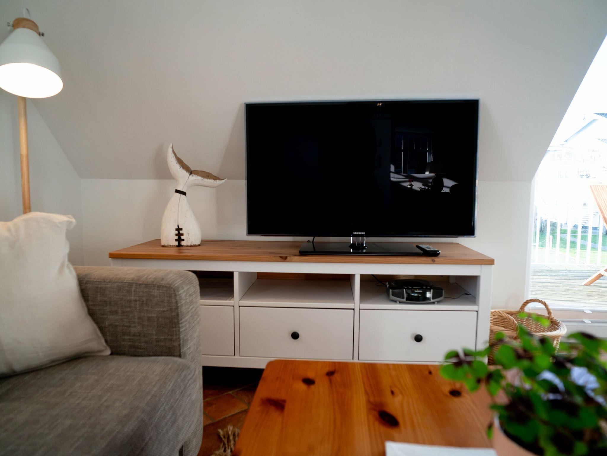 Die Wohnung verfügt über zwei Balkone mit Balkonmöbeln für vier Personen. Sie können hier die frische Meeresluft genießen und entspannte Stunden im Freien verbringen. Die Einrichtung ist mit hochwertigen Naturholzmöbeln gestaltet, was eine warme und gemütliche Atmosphäre schafft. Eine Fußbodenheizung sorgt dafür, dass Sie auch in den kälteren Monaten stets angenehme Wärme haben. Der Wohnbereich ist mit einer gemütlichen Couch und einem HD-TV ausgestattet. Von hier aus haben Sie Zugang zu einem der Balkone.