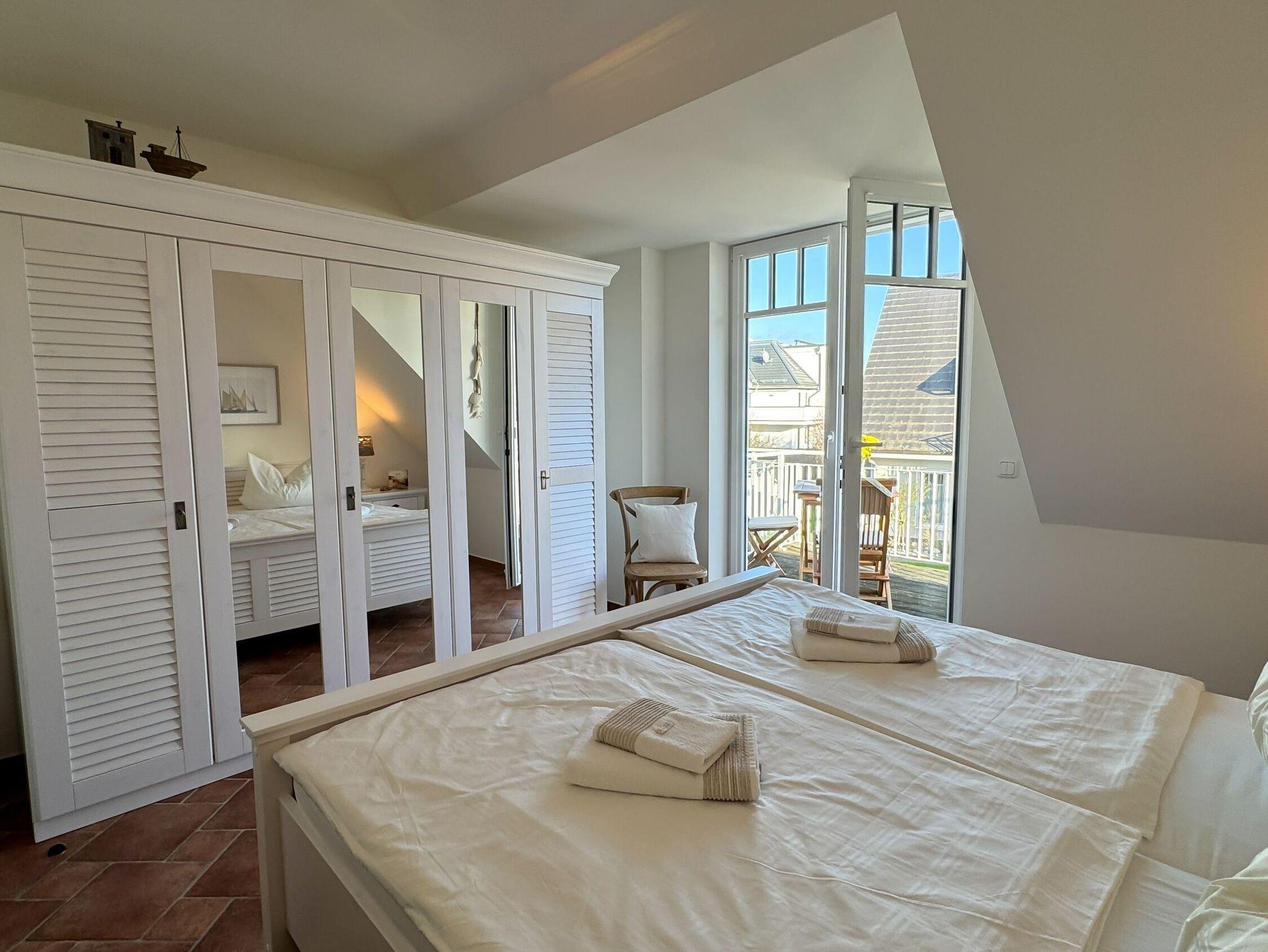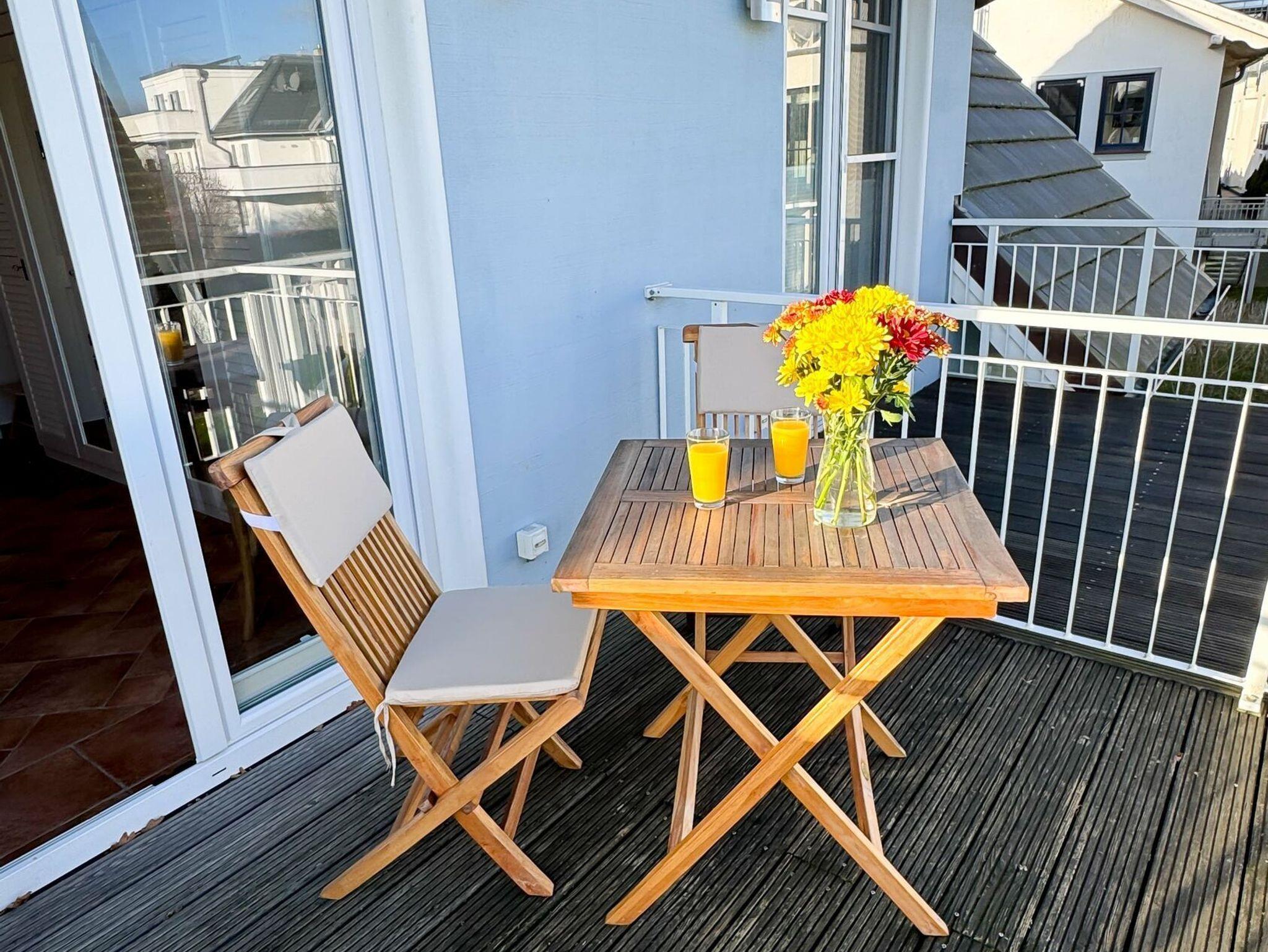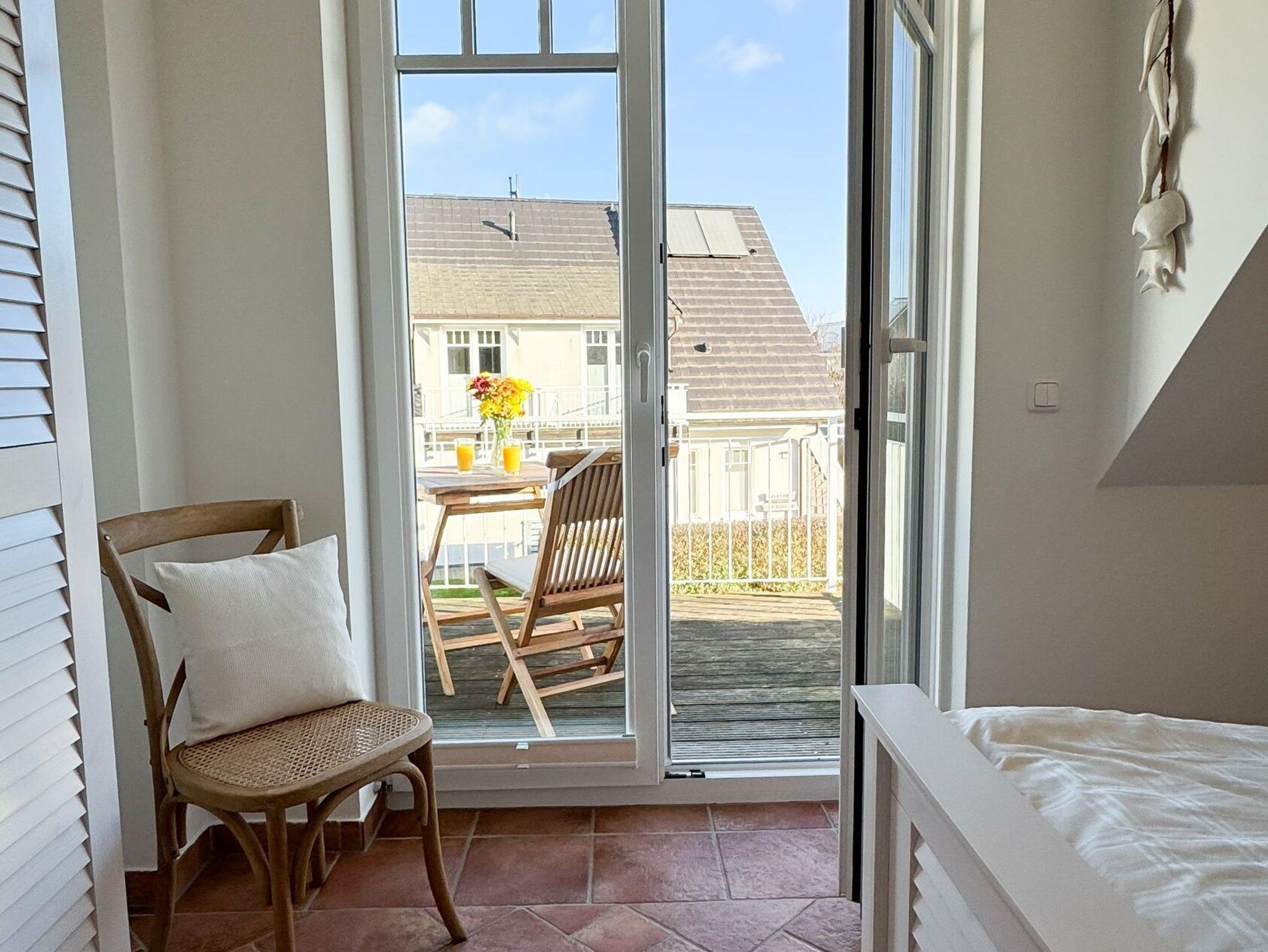 Die Wohnung verfügt über zwei Balkone mit Balkonmöbeln für vier Personen. Sie können hier die frische Meeresluft genießen und entspannte Stunden im Freien verbringen. Die Einrichtung ist mit hochwertigen Naturholzmöbeln gestaltet, was eine warme und gemütliche Atmosphäre schafft. Eine Fußbodenheizung sorgt dafür, dass Sie auch in den kälteren Monaten stets angenehme Wärme haben. Der Wohnbereich ist mit einer gemütlichen Couch und einem HD-TV ausgestattet. Von hier aus haben Sie Zugang zu einem der Balkone.