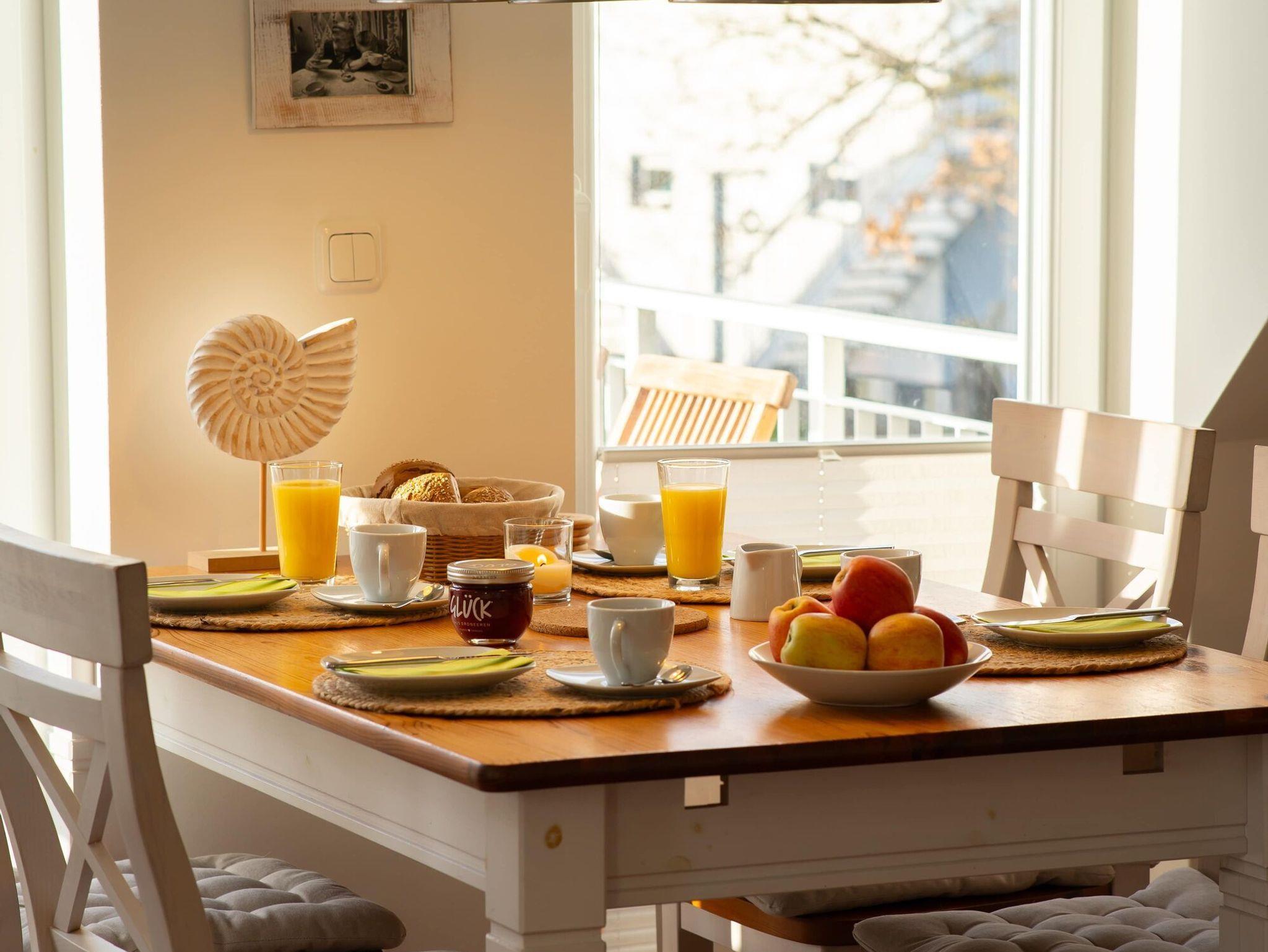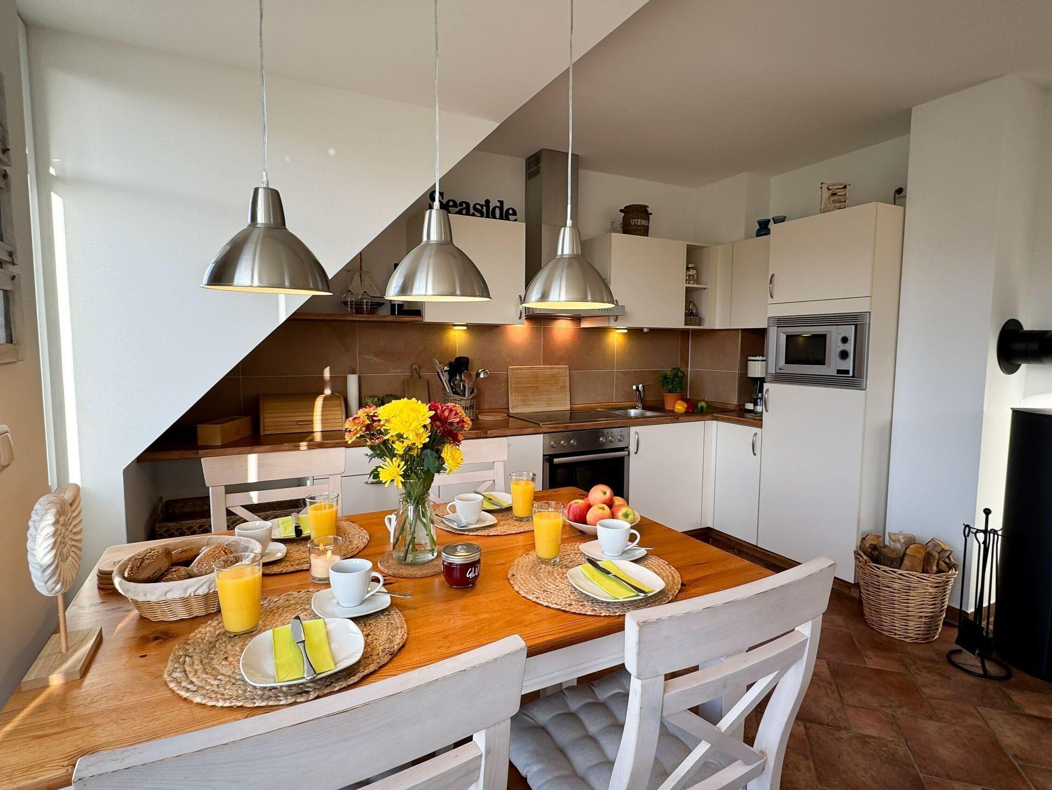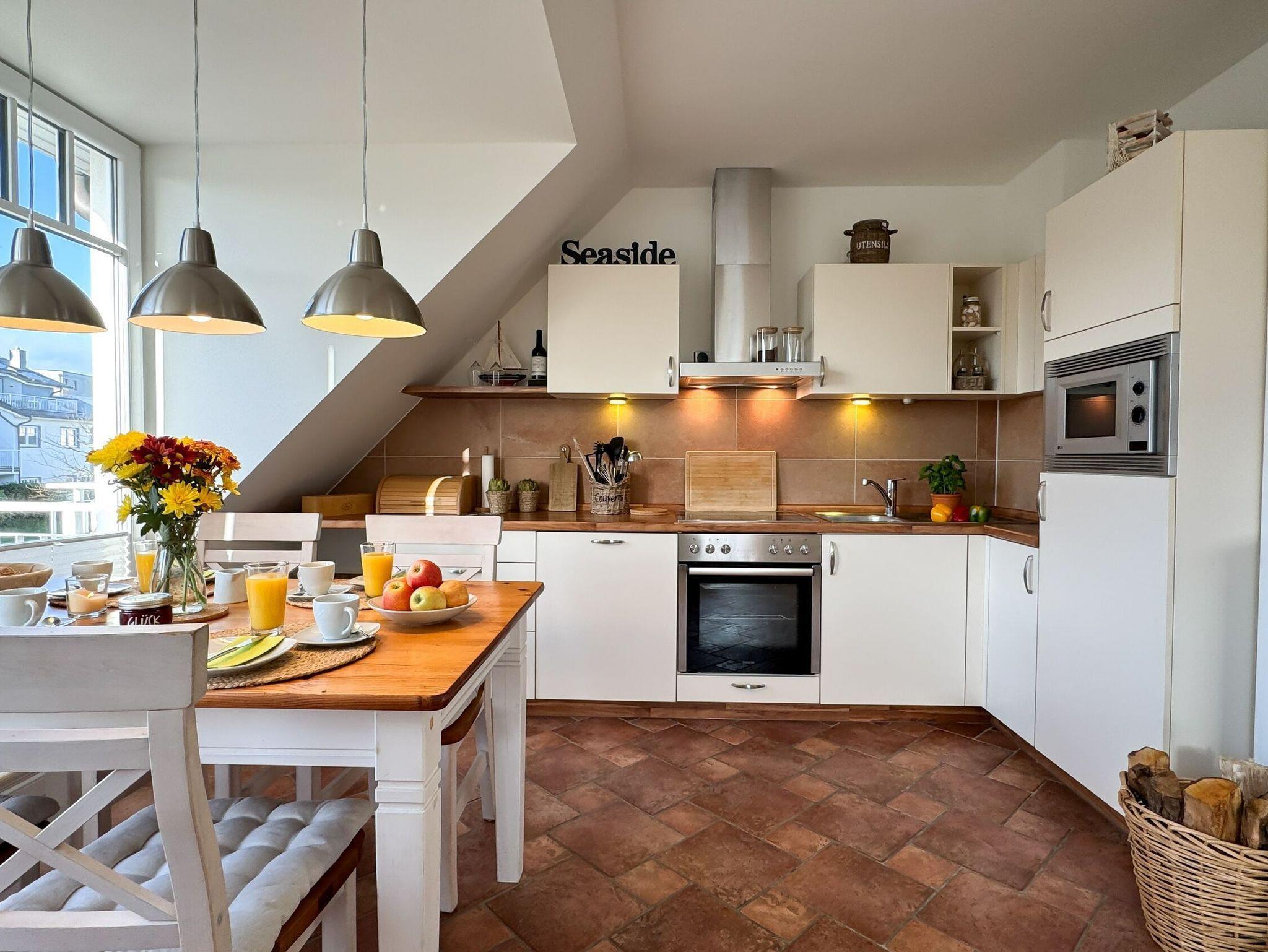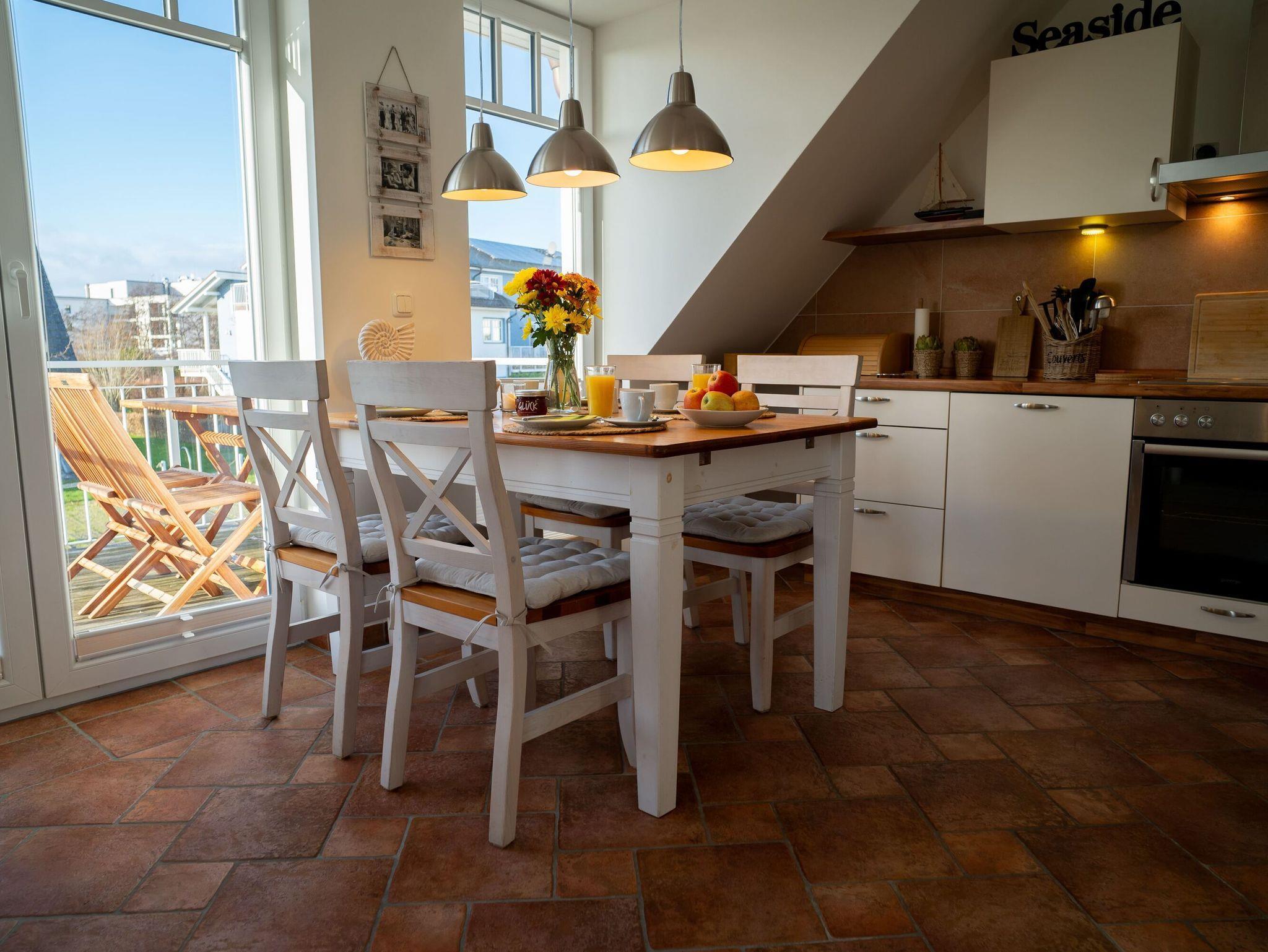 Die offene Küche verfügt über einen großen Esstisch für vier Personen. Hier können Sie gemeinsame Mahlzeiten genießen und gemütliche Abende verbringen.