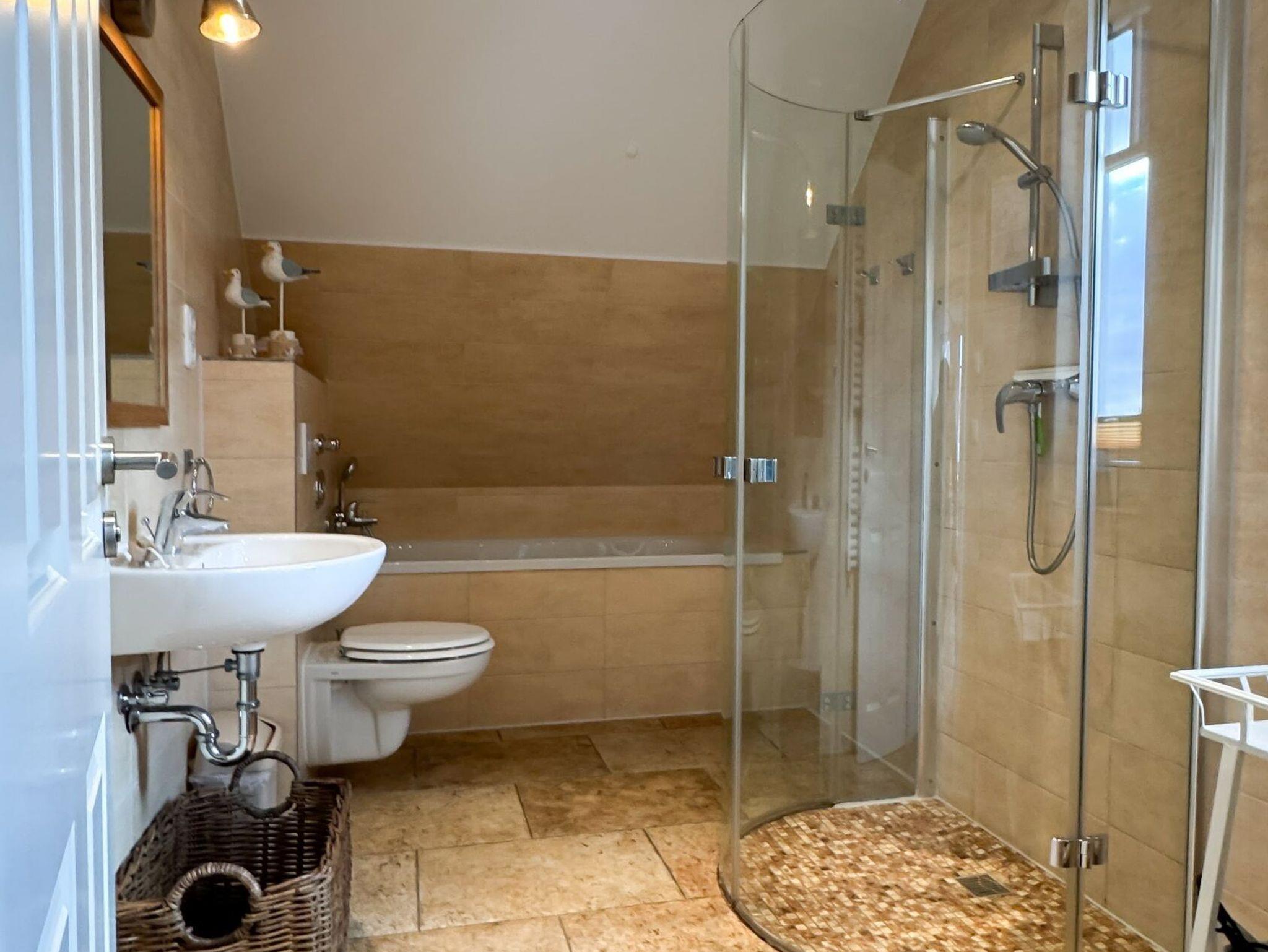 Das Tageslichtbad ist mit einer Badewanne und einer bodenebenen Dusche ausgestattet. Hier können Sie sich erfrischen und entspannen. Ein Wäscheständer ist ebenfalls vorhanden.