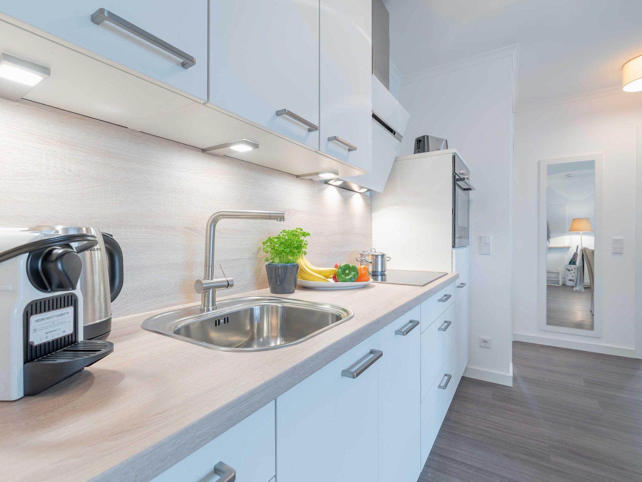Die Einbauküche ist mit Backofen inklusive Grillfunktion, 4-Platten Cerankochfeld, Kühlschrank inklusive Tiefkühlfach, Geschirrspüler, Kaffeemaschine, Nespresso-Maschine, Toaster und Wasserkocher sehr gut ausgestattet.